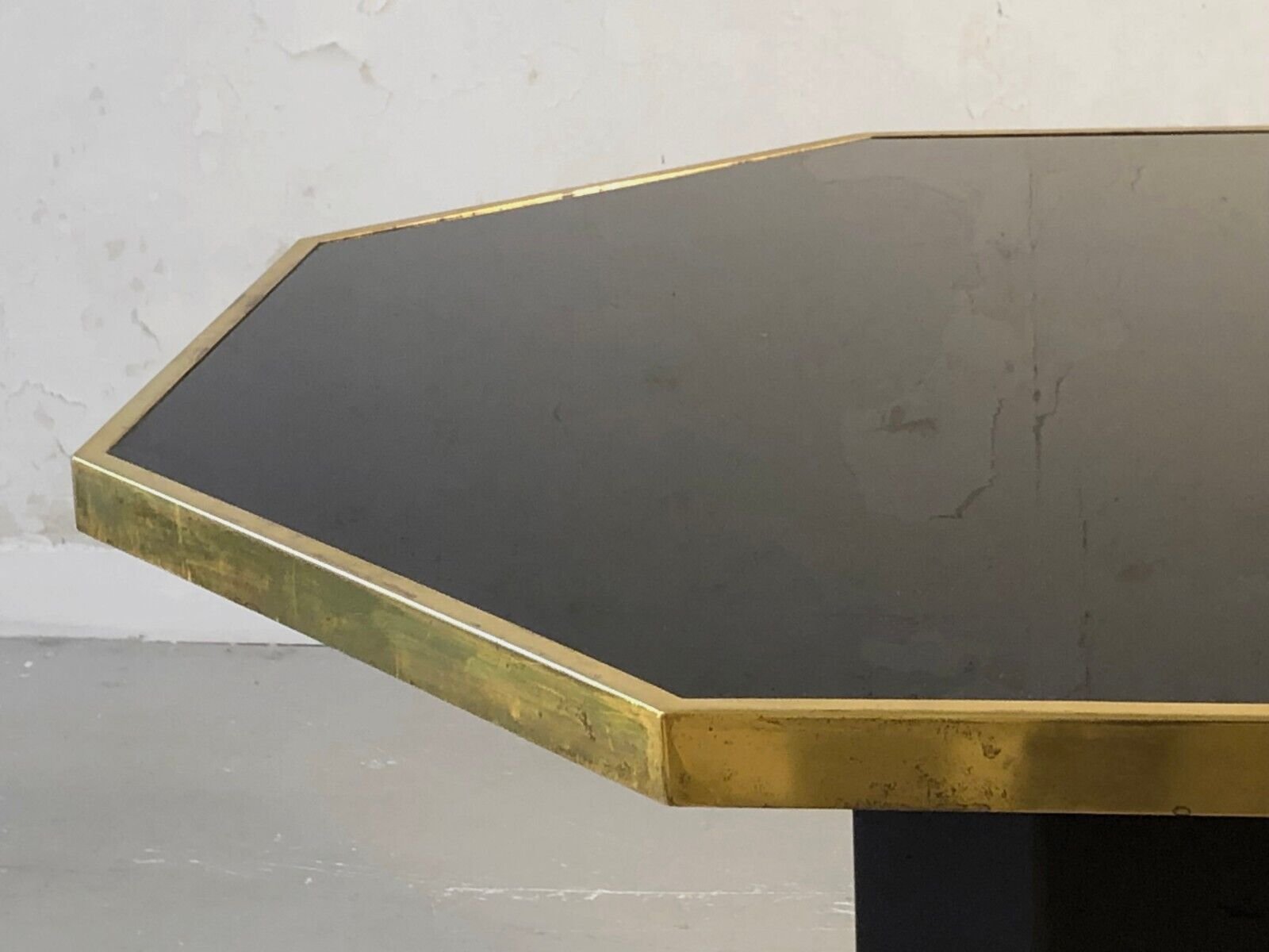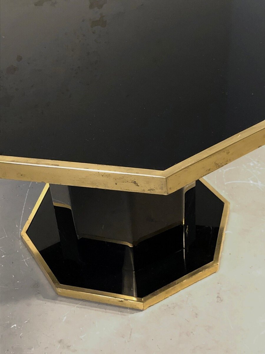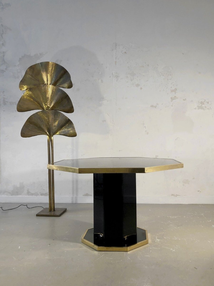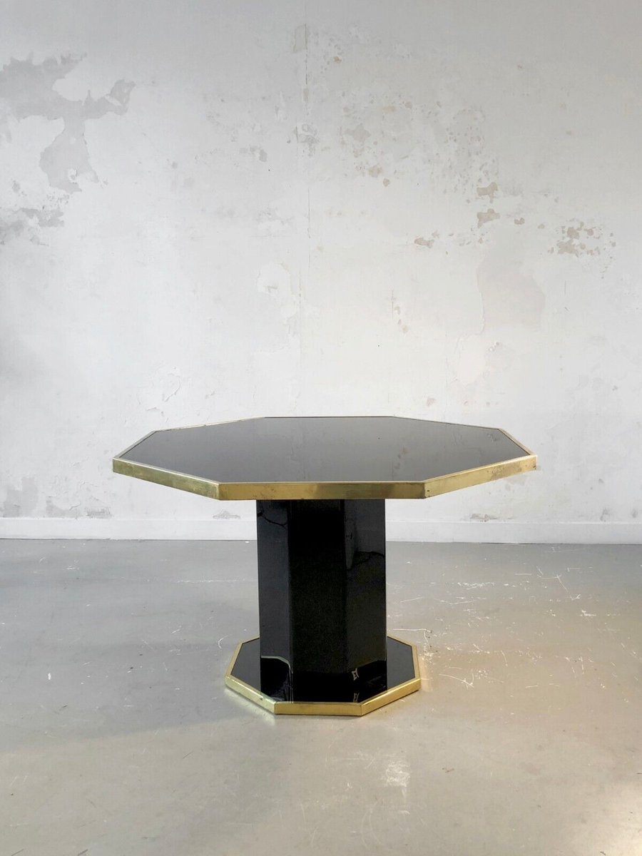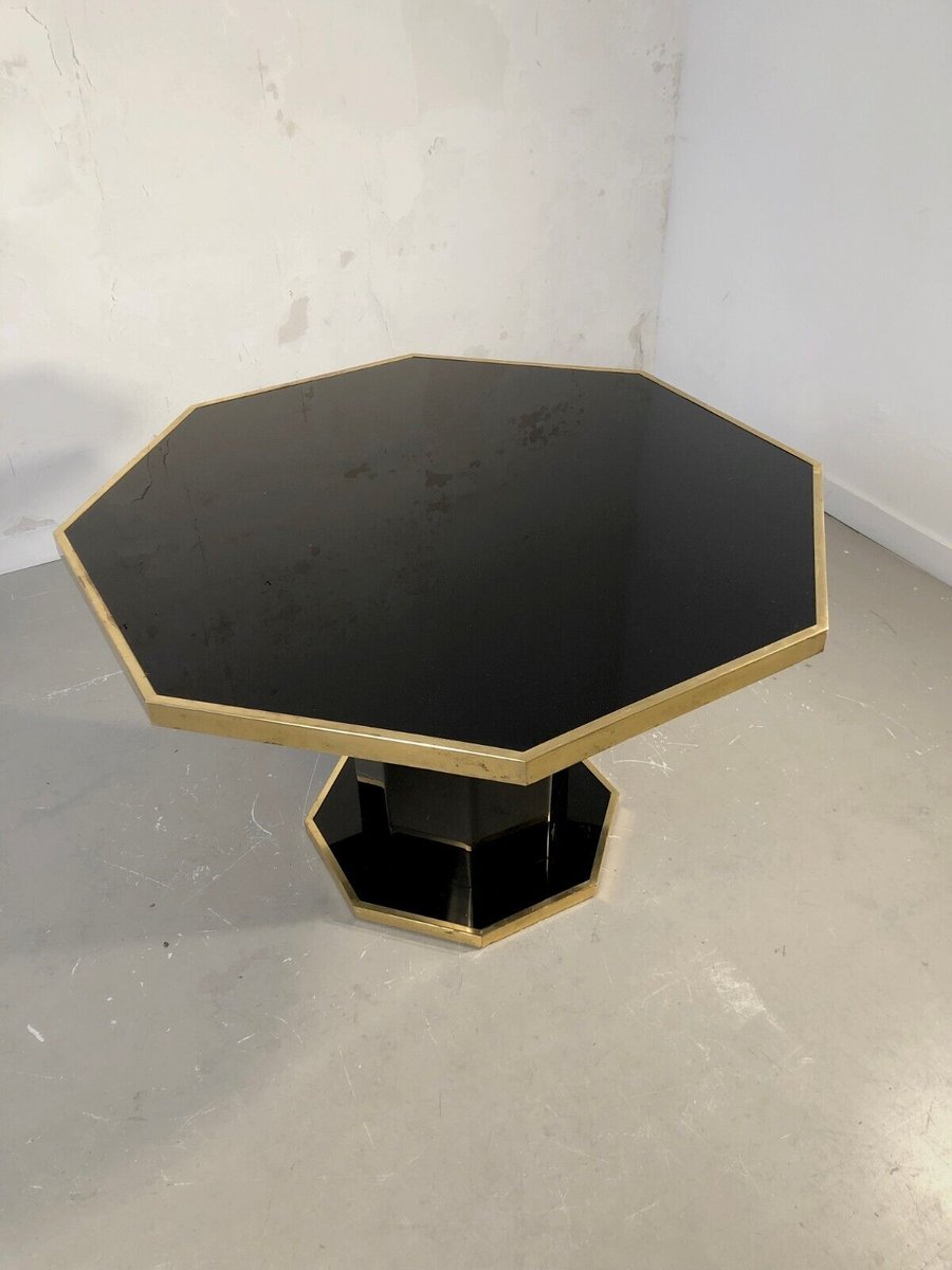 An impressive and very chic octagonal dinner, post-modernist, shabby-chic, octagonal black lacquered wooden base circulated by a bronze or golden brass belt, black octagonal column in black lacquered wood, large octagonal wooden tray Black lacquer circulated by a bronze or gilded brass border, Signature EM EM in golden brass, by Eric Maville, France 1970-1980.