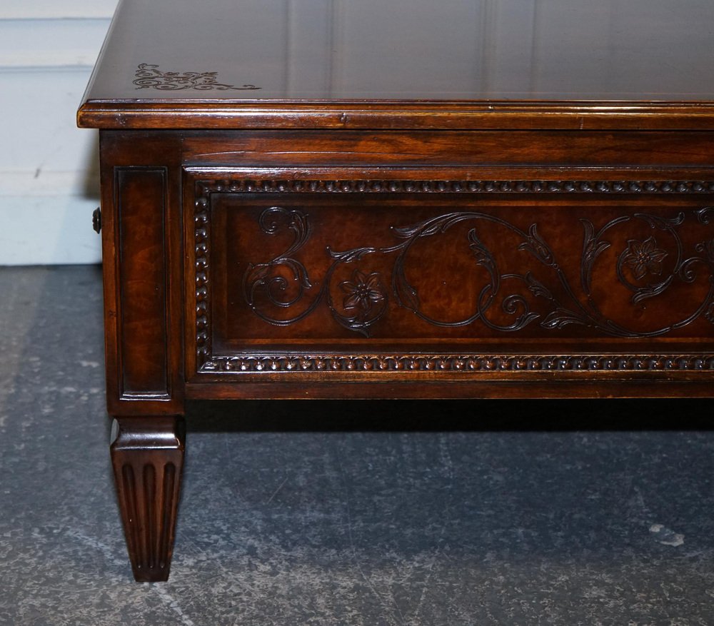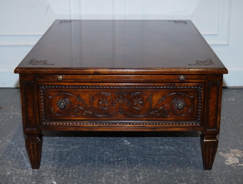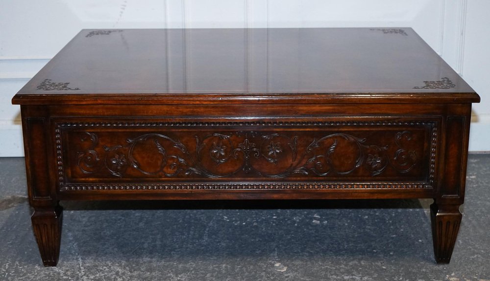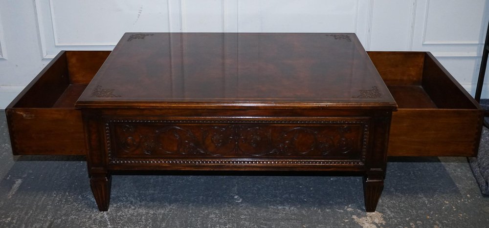 This striking coffee table by Theodore Alexander exemplifies the brand’s reputation for exceptional craftsmanship, refined proportions, and timeless American design. Elegantly constructed and beautifully finished, the table balances classic detailing with practical sophistication, making it a standout centrepiece for a well-considered living space. The design incorporates two smoothly fitted drawers, offering discreet and generous storage for everyday essentials, while maintaining a clean and composed silhouette. Integrated butler trays add both function and visual interest, providing a raised, practical surface ideal for serving while reinforcing the table’s architectural elegance. The wood displays a rich depth of colour and a finely finished surface, reflecting Theodore Alexander’s commitment to quality materials and meticulous attention to detail. Every element feels deliberate and well resolved, from the balanced proportions to the refined joinery. Both decorative and highly functional, this coffee table is designed for real living while retaining a sense of understated luxury. A compelling piece for interiors that value craftsmanship, versatility, and enduring style, it offers the confidence and quality for which Theodore Alexander is internationally recognised.