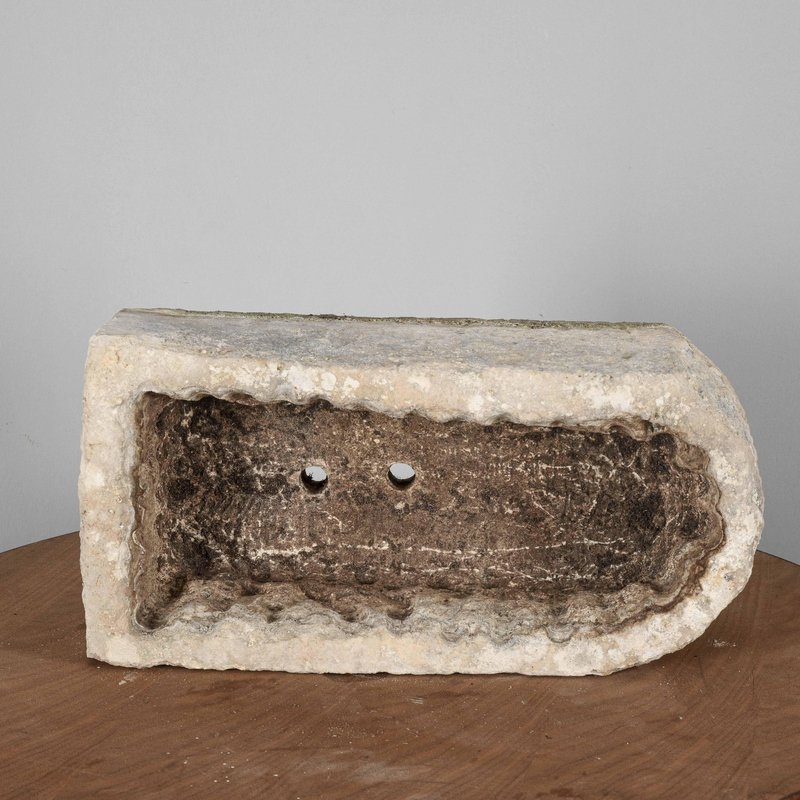 Enhance your space with this charming elongated stone basin, carved from a single block of stone, featuring two holes to allow water to drain, it is a versatile antique piece with a rustic charm. Ideal for adding a touch of history and authenticity to your garden, terrace or interior space. Its dimensions of 37.5 cm in length, 19 cm in width and 13 cm in height, make it perfect for use as a flowerpot for small plants, a decorative centrepiece or a charming bird bath. The natural colours of the stone, ranging from light grey to beige, with light mossy shades, testify to the passage of time and exposure to the elements, giving the piece a lived-in and original aura. Made entirely of stone, this basin is a sturdy and long-lasting example of traditional craftsmanship. Perfect for lovers of modern antiques and rustic design. CATEGORY basin STYLE antique DIMENSIONS: HEIGHT cm 13 WIDTH cm 37.5 DEPTH cm 19 COLOR: cream white gray MATERIAL: stone CONDITION: Very good the vintage object has no defects but may show slight traces of wear