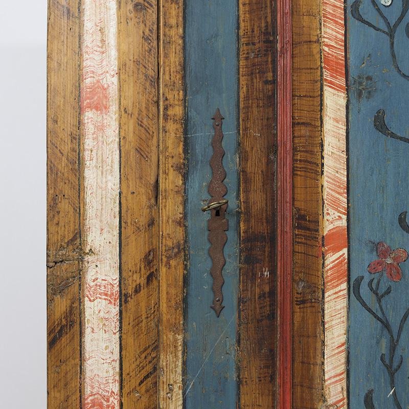 Exceptional painted bridal cabinet in original paint. The colors and patterns on this cabinet are very beautiful and give it a rustic and characteristic appearance. This piece of furniture comes from the Franconian region in southern Germany and probably dates to around 1750-1800. The cabinet is in neat, restored condition. For example, several parts at the base have been expertly replaced. Sporadically, some old woodworm marks can be seen, which have naturally been checked and treated. All in all, signs of wear are quite noticeable in a piece of furniture approximately 250 years old. The door panel features a very large depiction of a flower of life/tree growing from a calyx. This was a key motif in folk art from that period. The piece has three interior shelves and a working lock with a key. In the past, it was customary to give bridal furniture like this to the couple at a wedding. These pieces were later placed in a state room on the farm, which was only rarely used for distinguished guests or special occasions. A beautiful and decorative piece of history. 170cm high, 110cm wide, and 46cm deep.