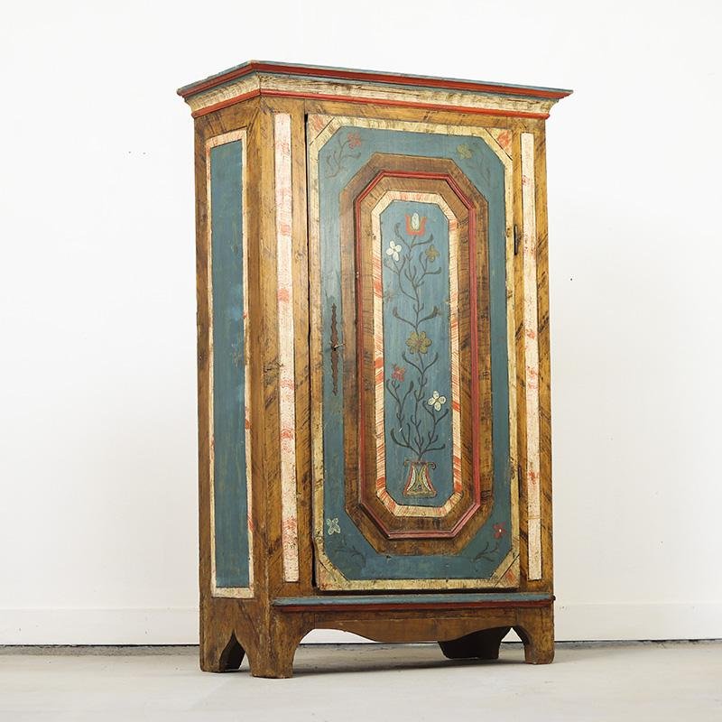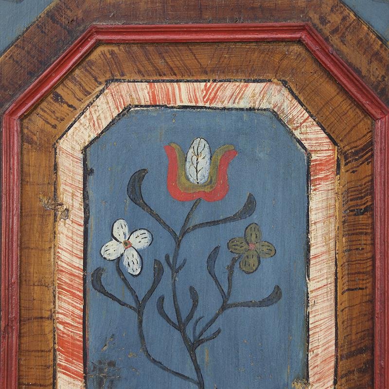 Außergewöhnlicher bemalter Brautschrank in Originalfarbe. Die Farben und Muster auf diesem Schrank sind sehr schön und geben ihm ein rustikales und charakteristisches Aussehen. Das Möbelstück stammt aus der fränkischen Region in Süddeutschland und ist vermutlich um 1750-1800 entstanden. Der Schrank befindet sich in einem gepflegten, restaurierten Zustand. So wurden beispielsweise mehrere Teile am Sockel fachmännisch ersetzt. Vereinzelt sind einige alte Holzwurmspuren zu sehen, die natürlich kontrolliert und behandelt wurden. Insgesamt sind die Gebrauchsspuren bei einem ca. 250 Jahre alten Möbelstück recht deutlich. Das Türblatt zeigt eine sehr große Darstellung einer Lebensblume/eines Baumes, der aus einem Kelch wächst. Dies war ein wichtiges Motiv in der Volkskunst jener Zeit. Das Möbelstück hat drei Einlegeböden und ein funktionierendes Schloss mit einem Schlüssel. Früher war es üblich, dem Brautpaar zur Hochzeit ein solches Möbelstück zu schenken. Später wurden diese Stücke in einem Prunkraum auf dem Hof aufgestellt, der nur selten für hohe Gäste oder besondere Anlässe genutzt wurde. Ein schönes und dekoratives Stück Geschichte. 170 cm hoch, 110 cm breit und 46 cm tief.