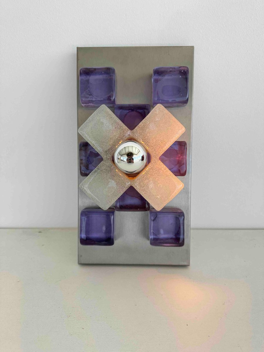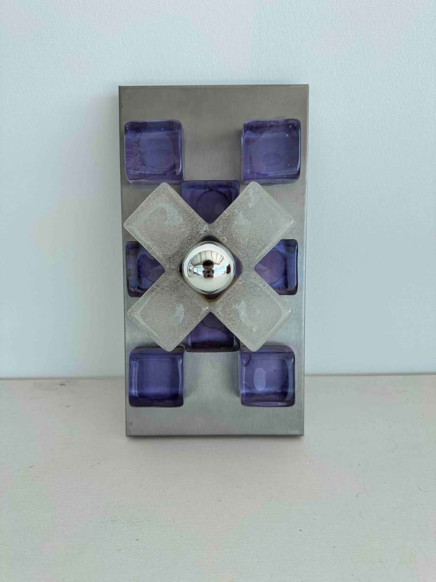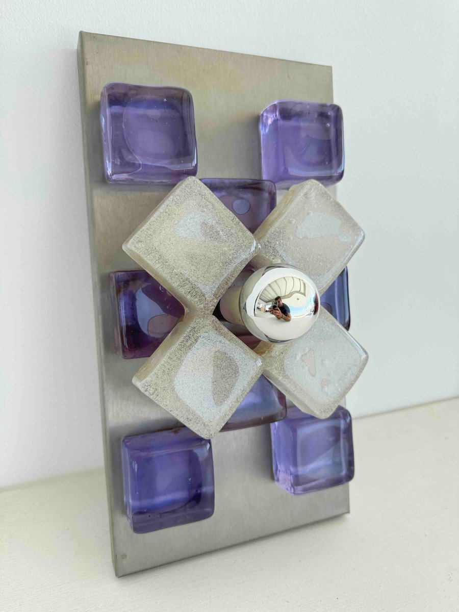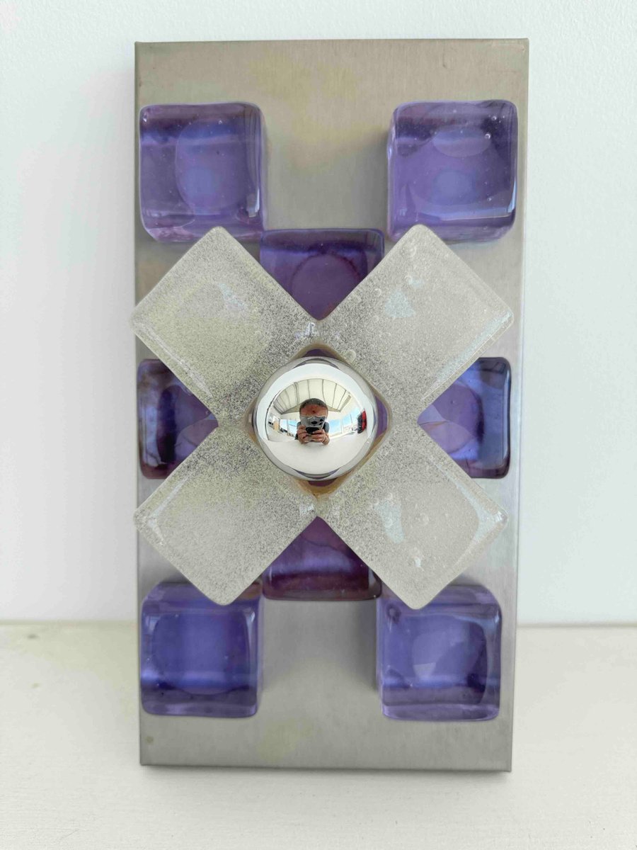 A sculptural wall sconce by Albano Poli for Poliarte, Italy, 1960s — a striking example of mid-century Italian lighting where art meets architecture. The design centers around a brushed aluminum backplate adorned with thick Murano glass cubes in vivid amethyst purple, arranged in perfect symmetry. At the core, a cross of textured frosted glass surrounds a mirrored chrome sphere that captures and distorts its environment, creating a dynamic interplay of light and reflection.