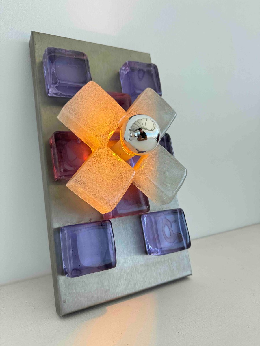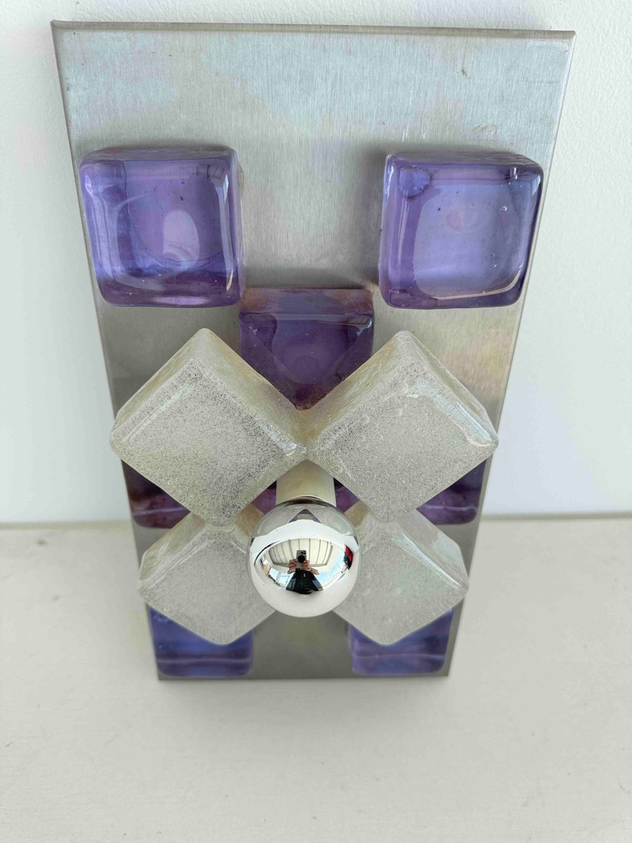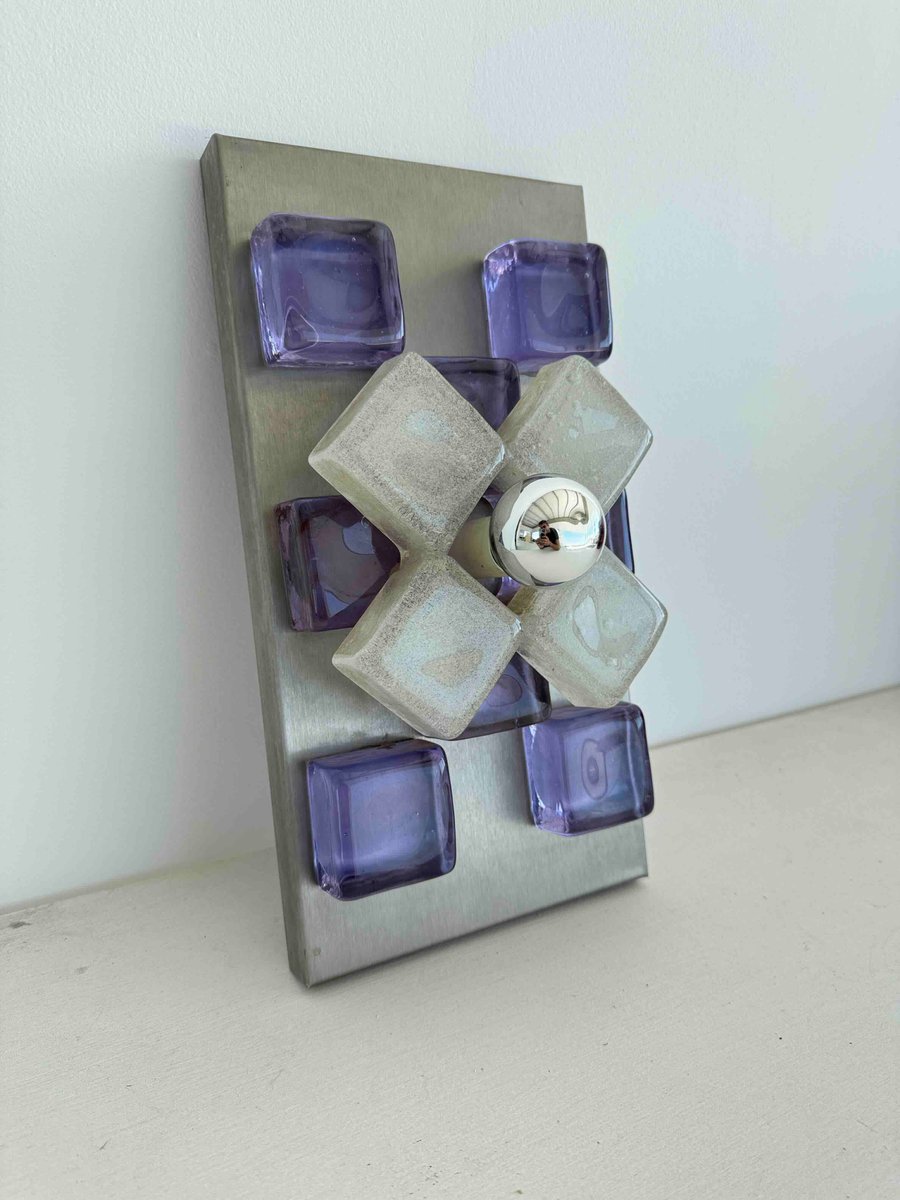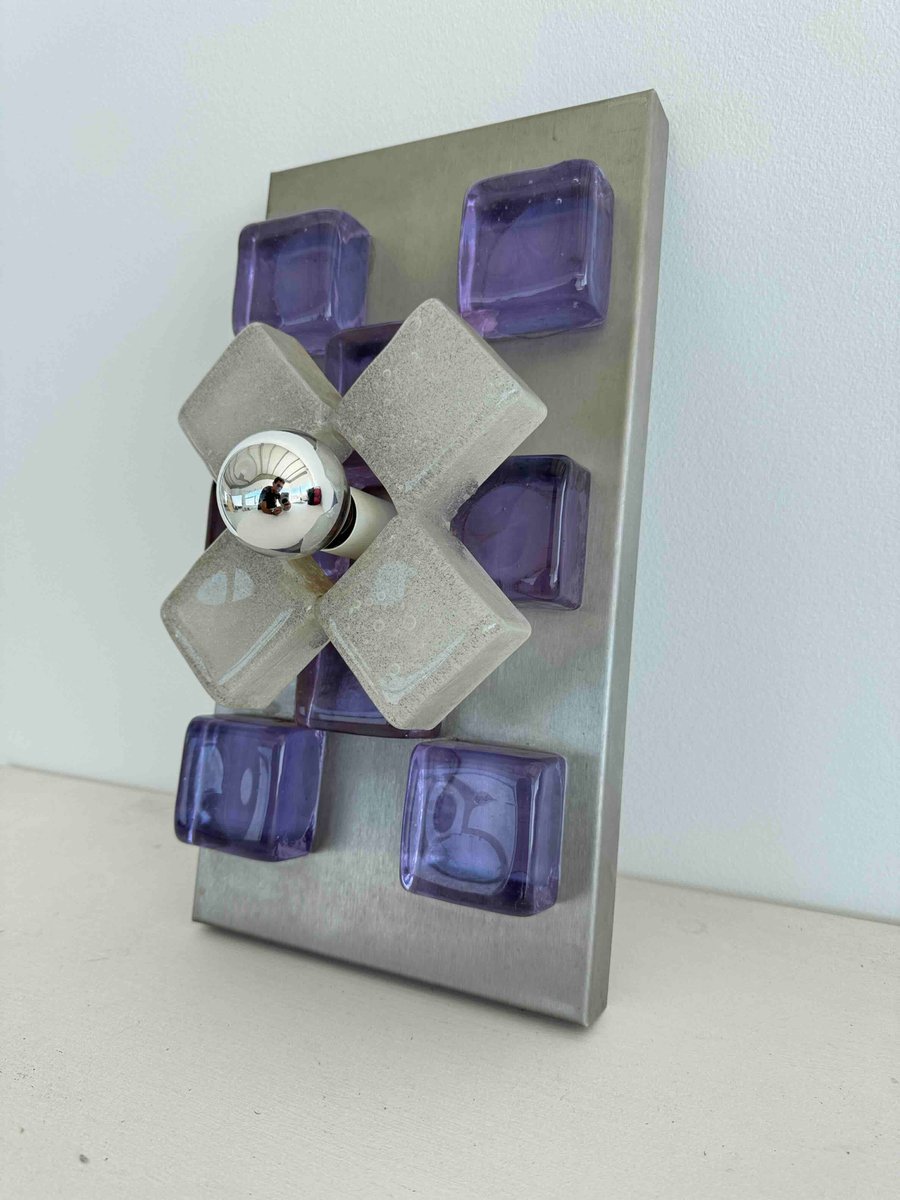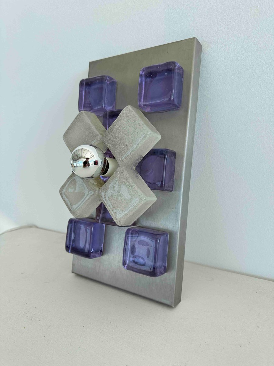 A sculptural wall sconce by Albano Poli for Poliarte, Italy, 1960s — a striking example of mid-century Italian lighting where art meets architecture. The design centers around a brushed aluminum backplate adorned with thick Murano glass cubes in vivid amethyst purple, arranged in perfect symmetry. At the core, a cross of textured frosted glass surrounds a mirrored chrome sphere that captures and distorts its environment, creating a dynamic interplay of light and reflection.