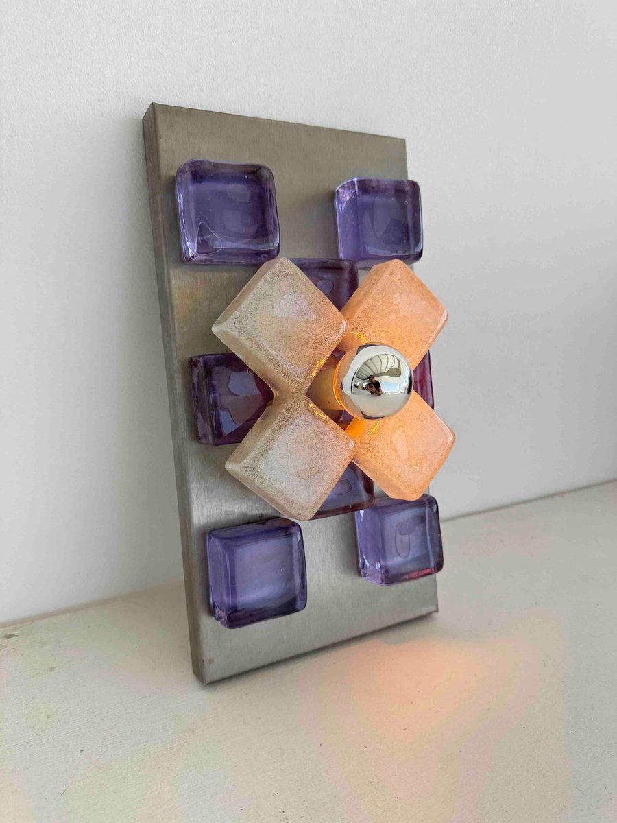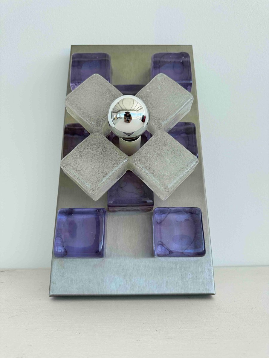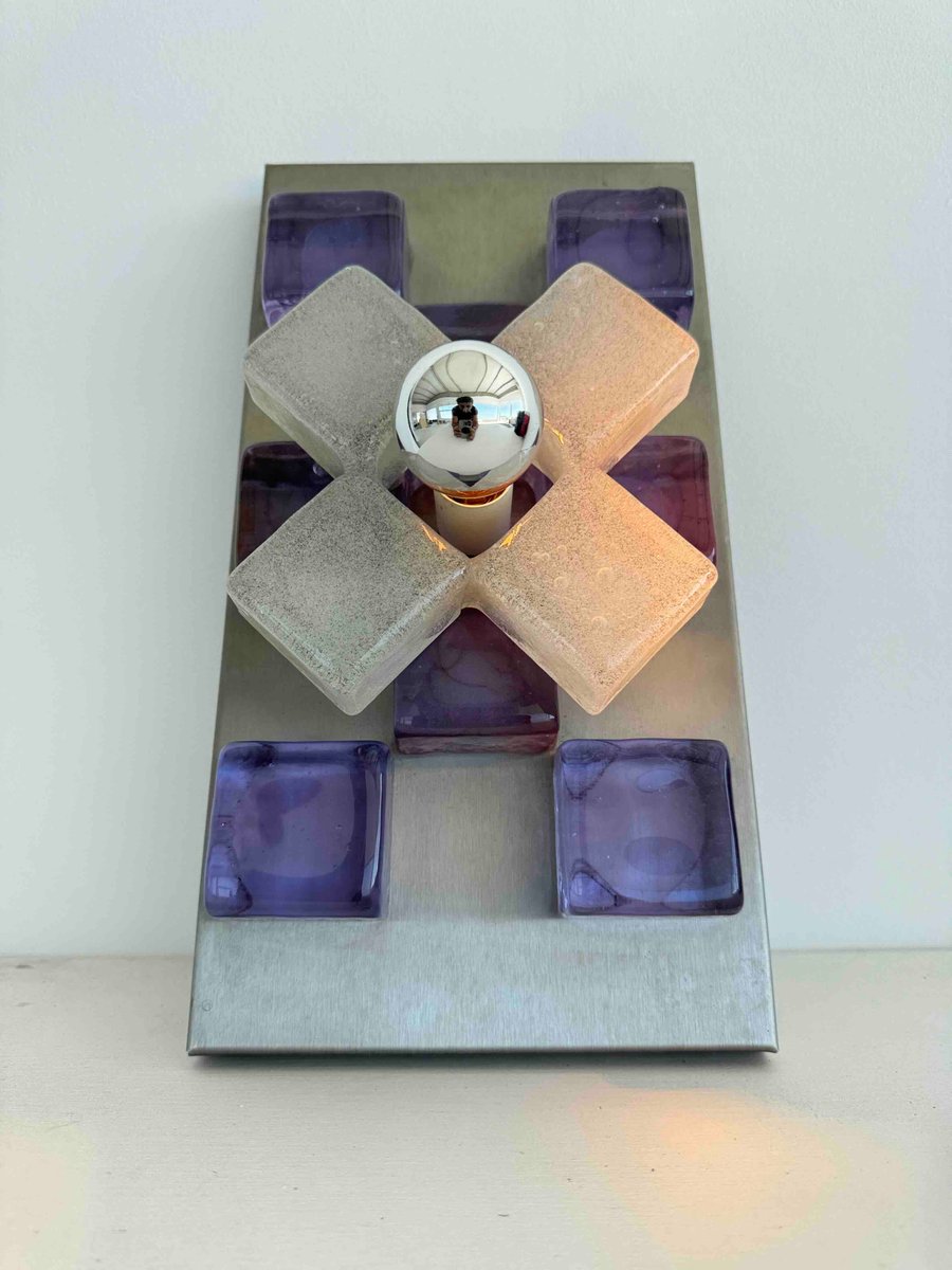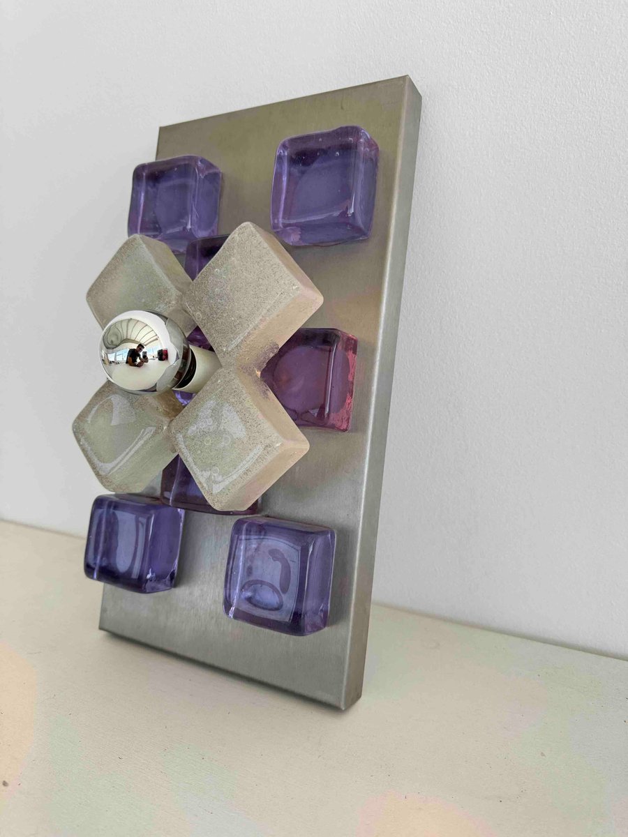 A sculptural wall sconce by Albano Poli for Poliarte, Italy, 1960s — a striking example of mid-century Italian lighting where art meets architecture. The design centers around a brushed aluminum backplate adorned with thick Murano glass cubes in vivid amethyst purple, arranged in perfect symmetry. At the core, a cross of textured frosted glass surrounds a mirrored chrome sphere that captures and distorts its environment, creating a dynamic interplay of light and reflection.