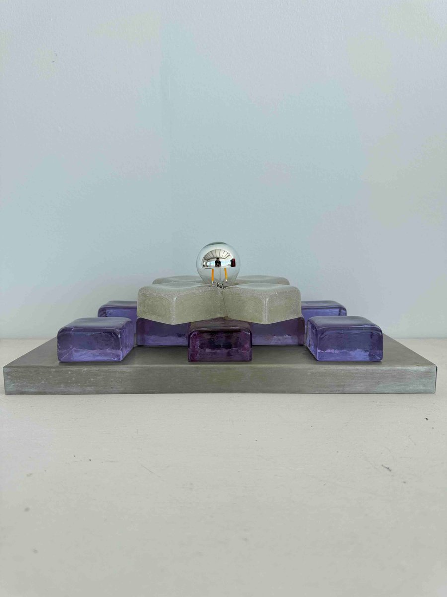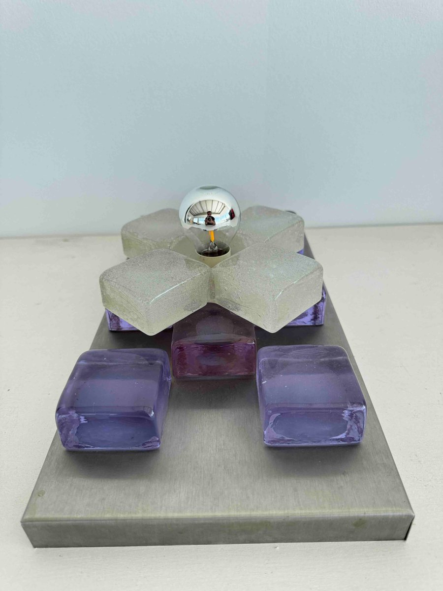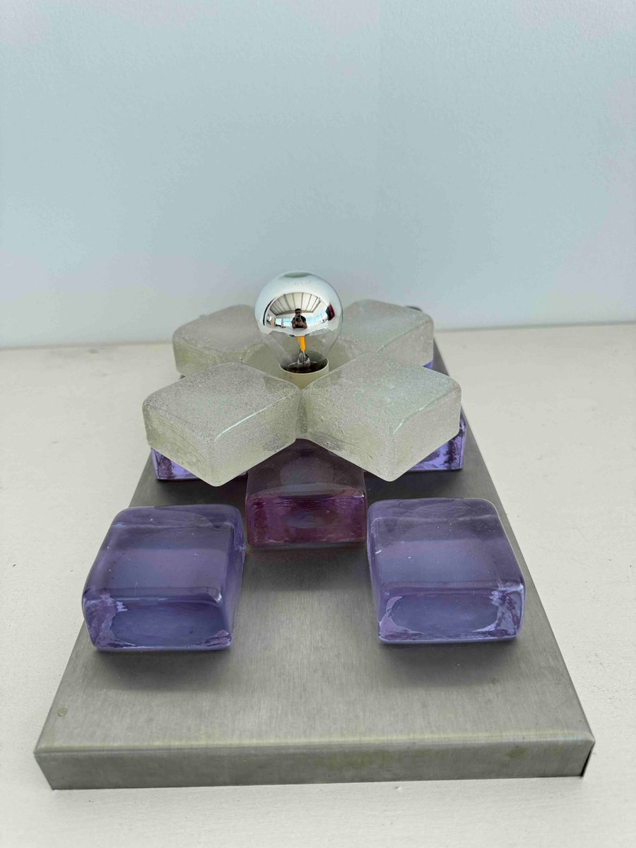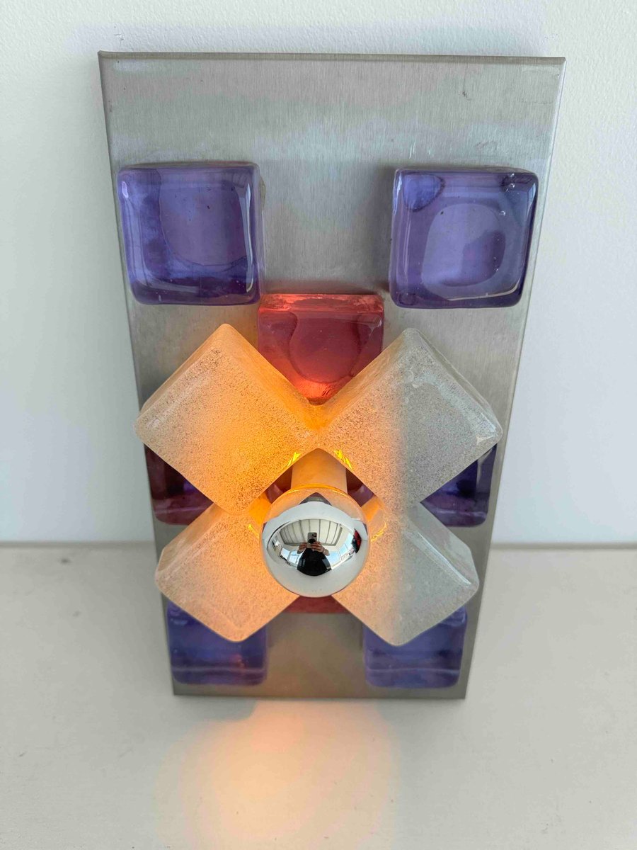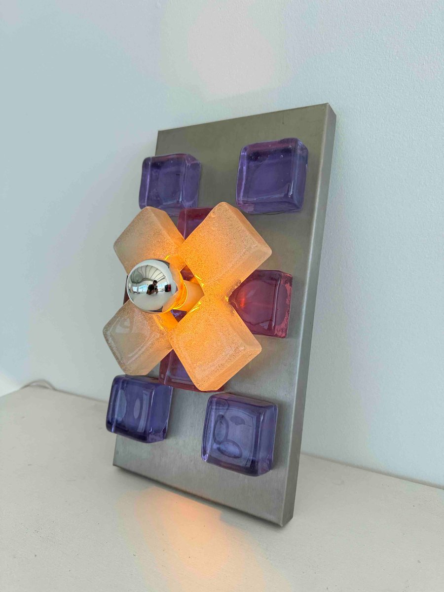 A sculptural wall sconce by Albano Poli for Poliarte, Italy, 1960s — a striking example of mid-century Italian lighting where art meets architecture. The design centers around a brushed aluminum backplate adorned with thick Murano glass cubes in vivid amethyst purple, arranged in perfect symmetry. At the core, a cross of textured frosted glass surrounds a mirrored chrome sphere that captures and distorts its environment, creating a dynamic interplay of light and reflection.