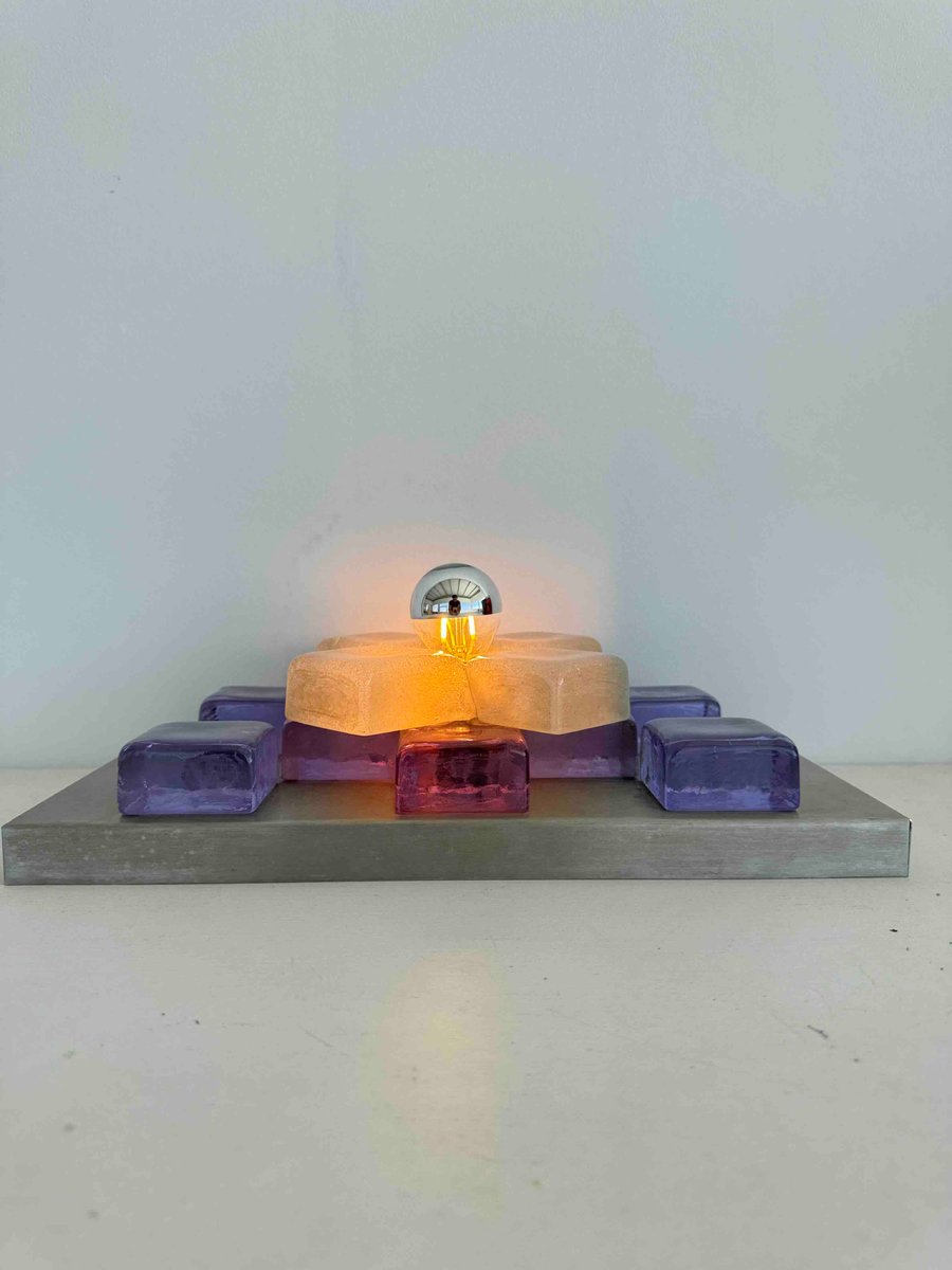 Wenn die Leuchte angezündet ist, strahlt sie ein sanftes, bernsteinfarbenes Licht aus, das durch das mattierte Zentrum hindurchscheint und die tiefen Violetttöne des umgebenden Glases sanft hervorhebt. Sie verwandelt sich von einem statischen Objekt in eine atmosphärische Präsenz, die sie sowohl funktional als auch skulptural macht.