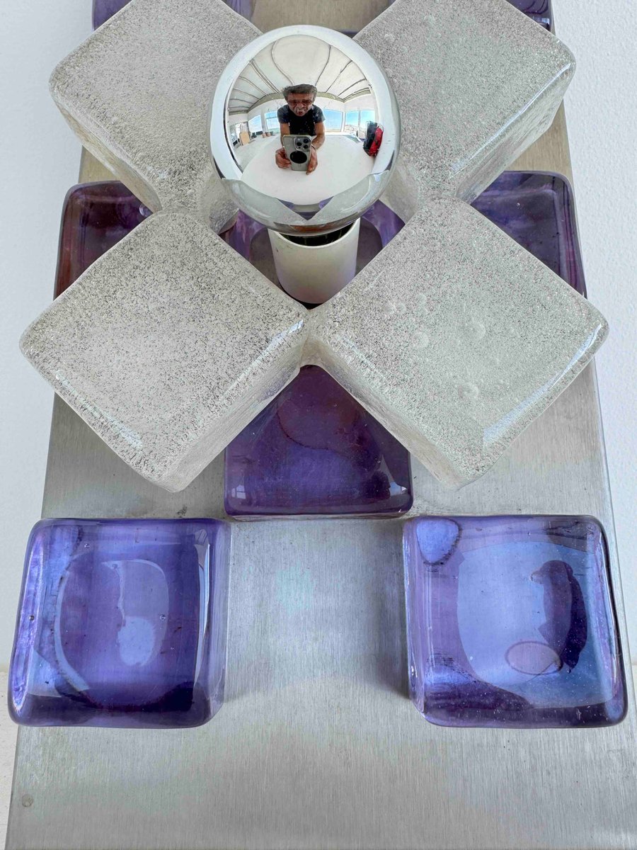 Eine skulpturale Wandleuchte von Albano Poli für Poliarte, Italien, 1960er Jahre - ein beeindruckendes Beispiel für italienische Beleuchtung aus der Mitte des Jahrhunderts, bei der Kunst und Architektur aufeinandertreffen. Im Mittelpunkt des Designs steht eine Rückwand aus gebürstetem Aluminium, die mit dicken Muranoglaswürfeln in lebhaftem Amethystviolett verziert ist, die in perfekter Symmetrie angeordnet sind. Das Herzstück, ein Kreuz aus strukturiertem Milchglas, umgibt eine verspiegelte Chromkugel, die ihre Umgebung einfängt und verzerrt und so ein dynamisches Wechselspiel von Licht und Reflexion erzeugt.