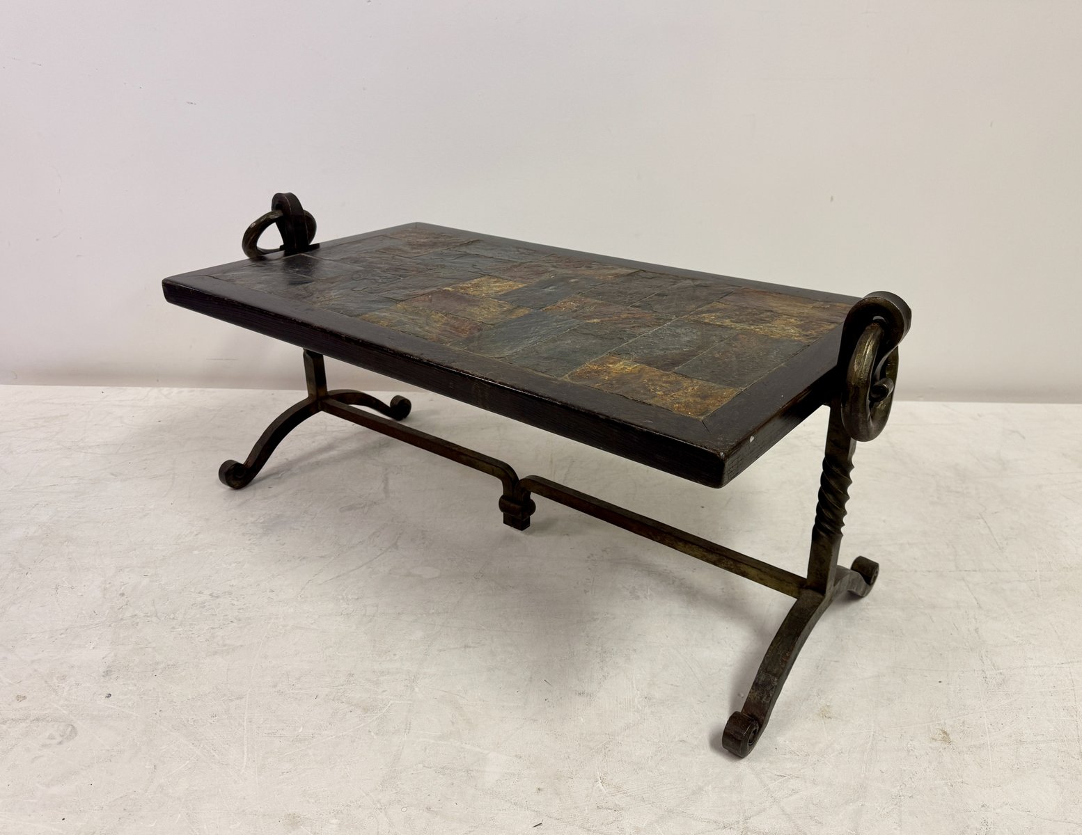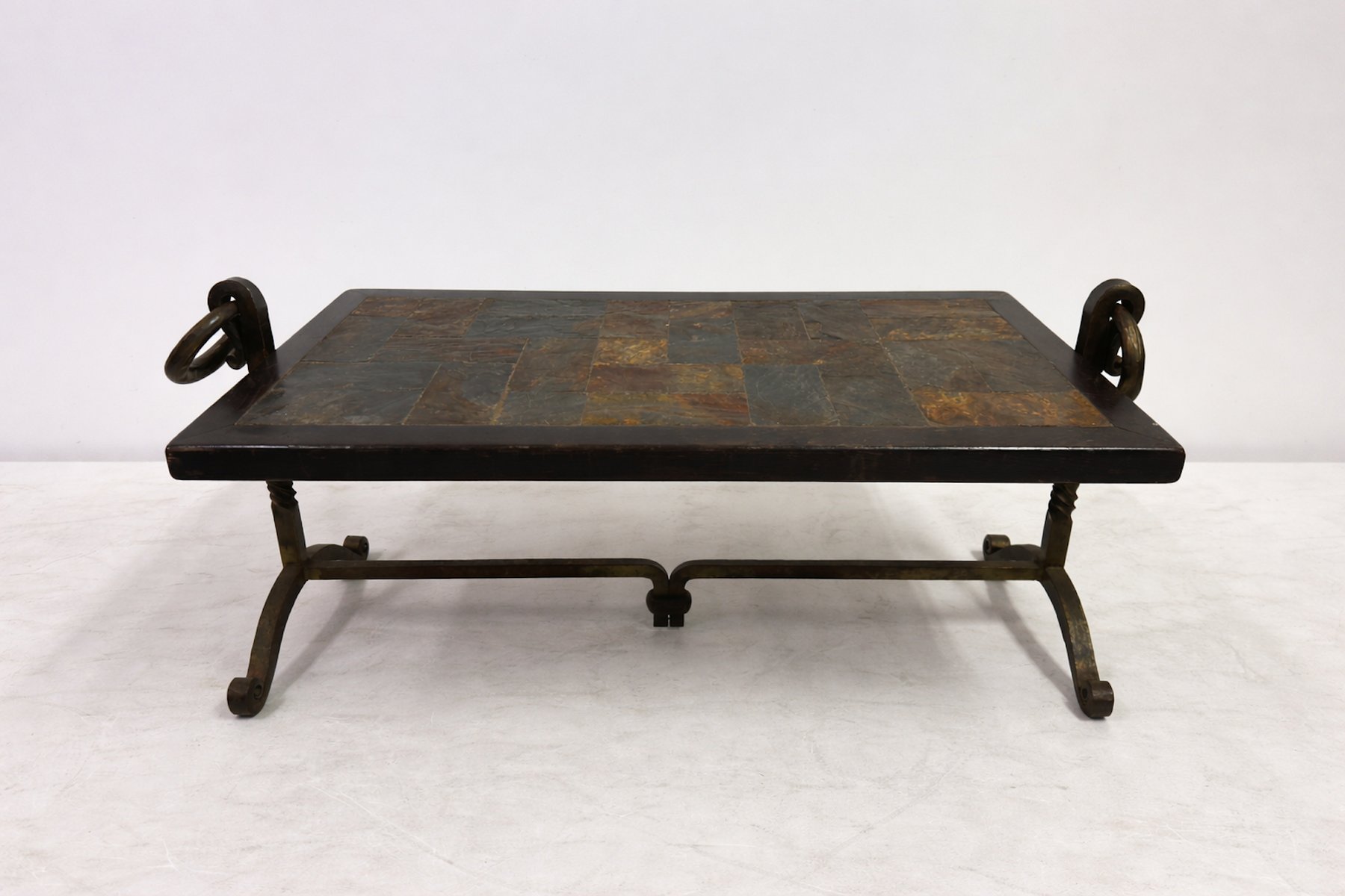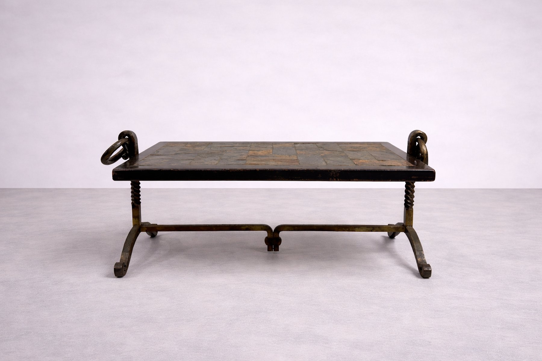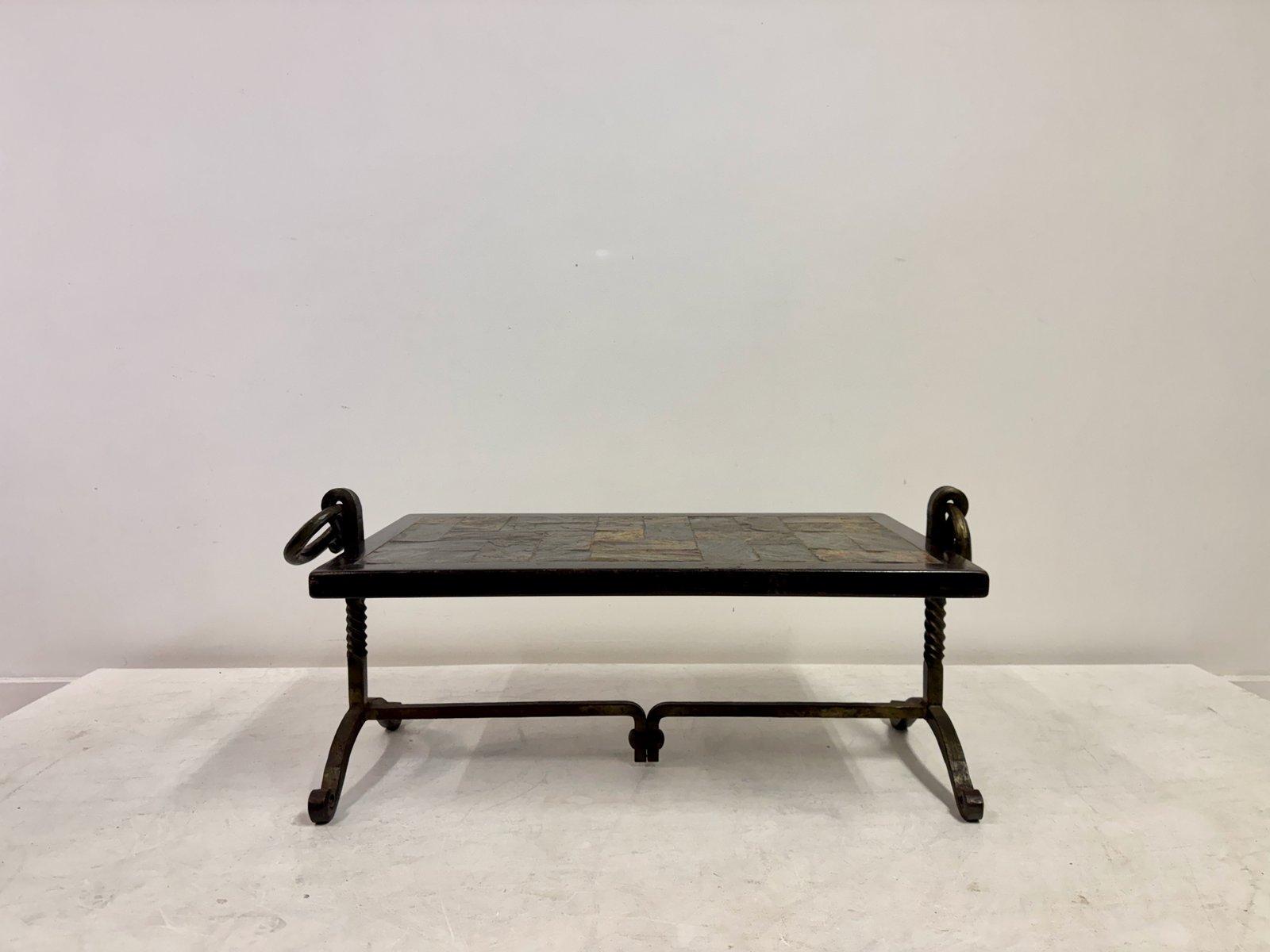 Ein niedriger rechteckiger Couchtisch mit einer dunklen Schieferplatte, die in einen schwarz gebeizten Holzrahmen eingelassen ist und auf einem schmiedeeisernen Untergestell ruht. Die Oberfläche besteht aus einzeln geschnittenen Steinfliesen mit natürlichen Farbvariationen, die dem Tisch einen subtilen brutalistischen Charakter und eine starke materielle Präsenz verleihen. Das Eisenuntergestell besteht aus sanft geschwungenen Beinen und einer zentralen Strebe, die dem Tisch optisches Gewicht verleihen und ihn gleichzeitig ausgewogen und gut proportioniert erscheinen lassen. Der Kontrast zwischen der strukturierten Steinoberfläche und der skulpturalen Eisenkonstruktion verleiht dem Möbelstück eine geerdete, architektonische Qualität. Der Tisch stammt wahrscheinlich aus den 1970er Jahren und passt gut in ein brutalistisches oder spätmodernes Interieur, eignet sich aber ebenso gut für Wohnräume wie für kuratierte Umgebungen im Galeriestil. Guter Vintage-Zustand mit alters- und gebrauchsbedingten Gebrauchsspuren.