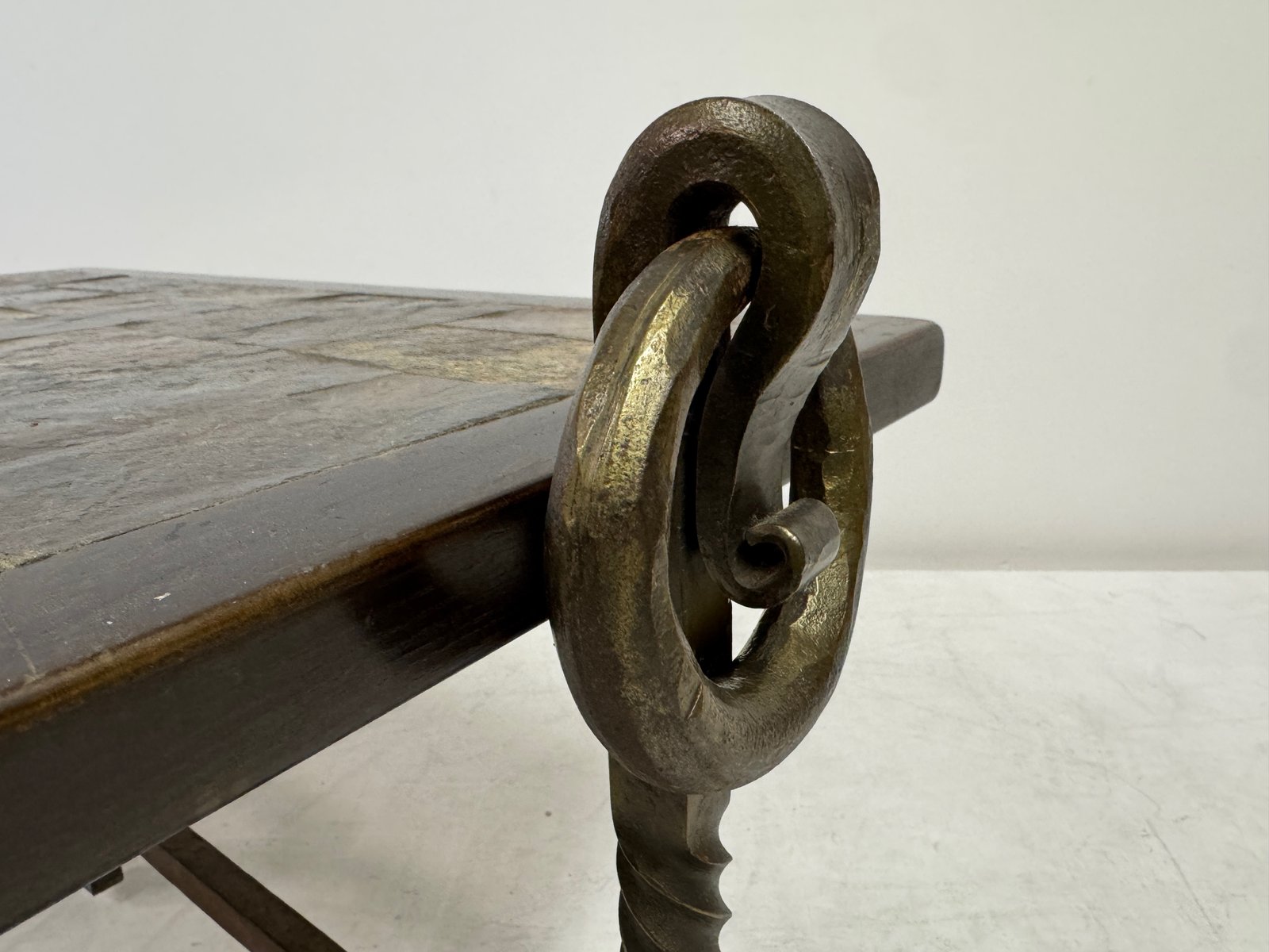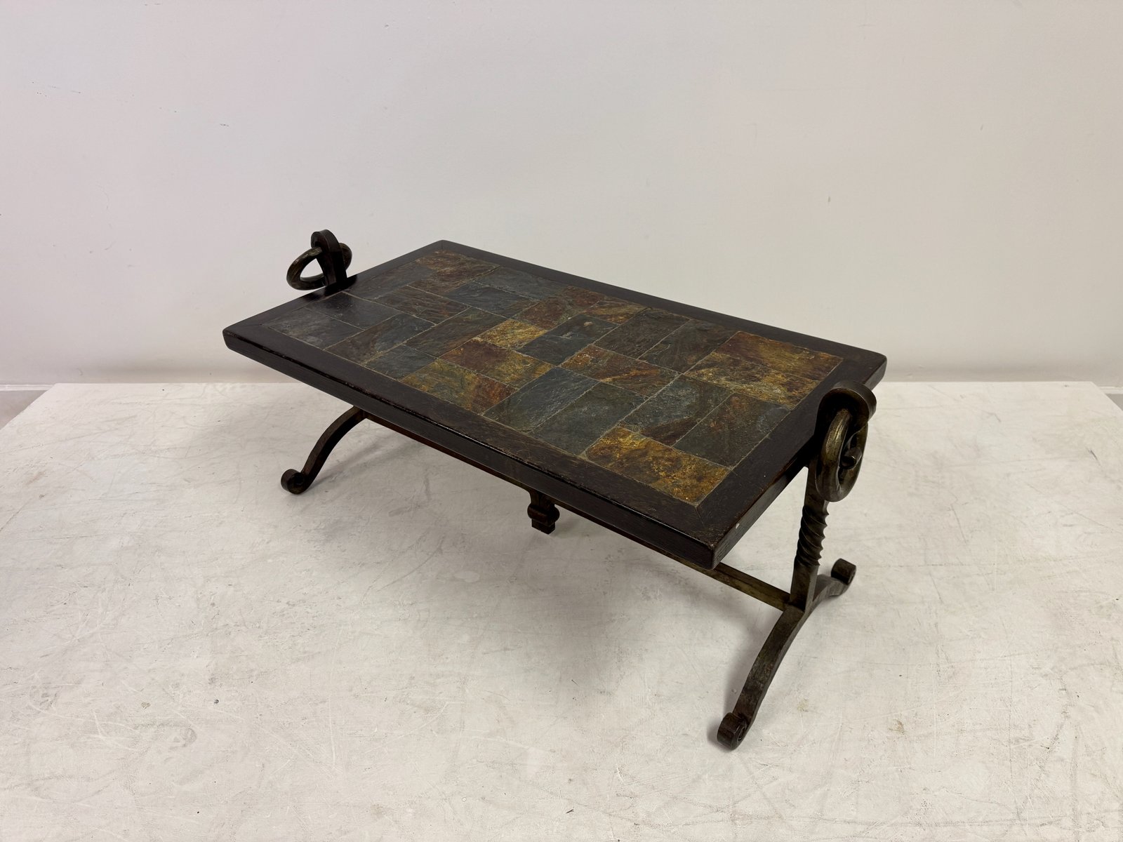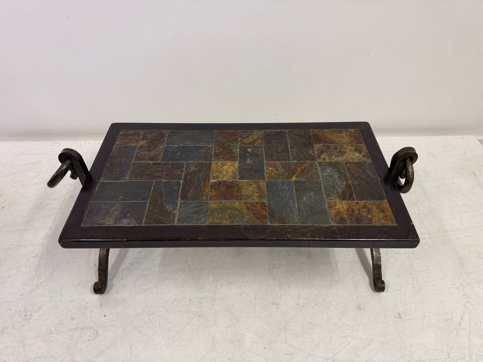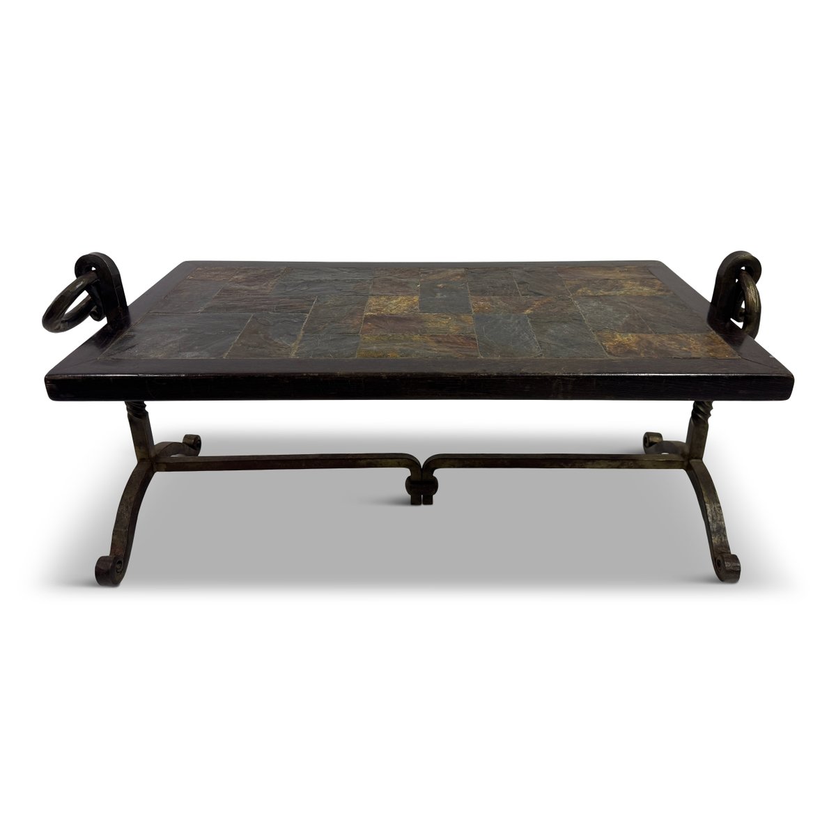 Ein niedriger rechteckiger Couchtisch mit einer dunklen Schieferplatte, die in einen schwarz gebeizten Holzrahmen eingelassen ist und auf einem schmiedeeisernen Untergestell ruht. Die Oberfläche besteht aus einzeln geschnittenen Steinfliesen mit natürlichen Farbvariationen, die dem Tisch einen subtilen brutalistischen Charakter und eine starke materielle Präsenz verleihen. Das Eisenuntergestell besteht aus sanft geschwungenen Beinen und einer zentralen Strebe, die dem Tisch optisches Gewicht verleihen und ihn gleichzeitig ausgewogen und gut proportioniert erscheinen lassen. Der Kontrast zwischen der strukturierten Steinoberfläche und der skulpturalen Eisenkonstruktion verleiht dem Möbelstück eine geerdete, architektonische Qualität. Der Tisch stammt wahrscheinlich aus den 1970er Jahren und passt gut in ein brutalistisches oder spätmodernes Interieur, eignet sich aber ebenso gut für Wohnräume wie für kuratierte Umgebungen im Galeriestil. Guter Vintage-Zustand mit alters- und gebrauchsbedingten Gebrauchsspuren.