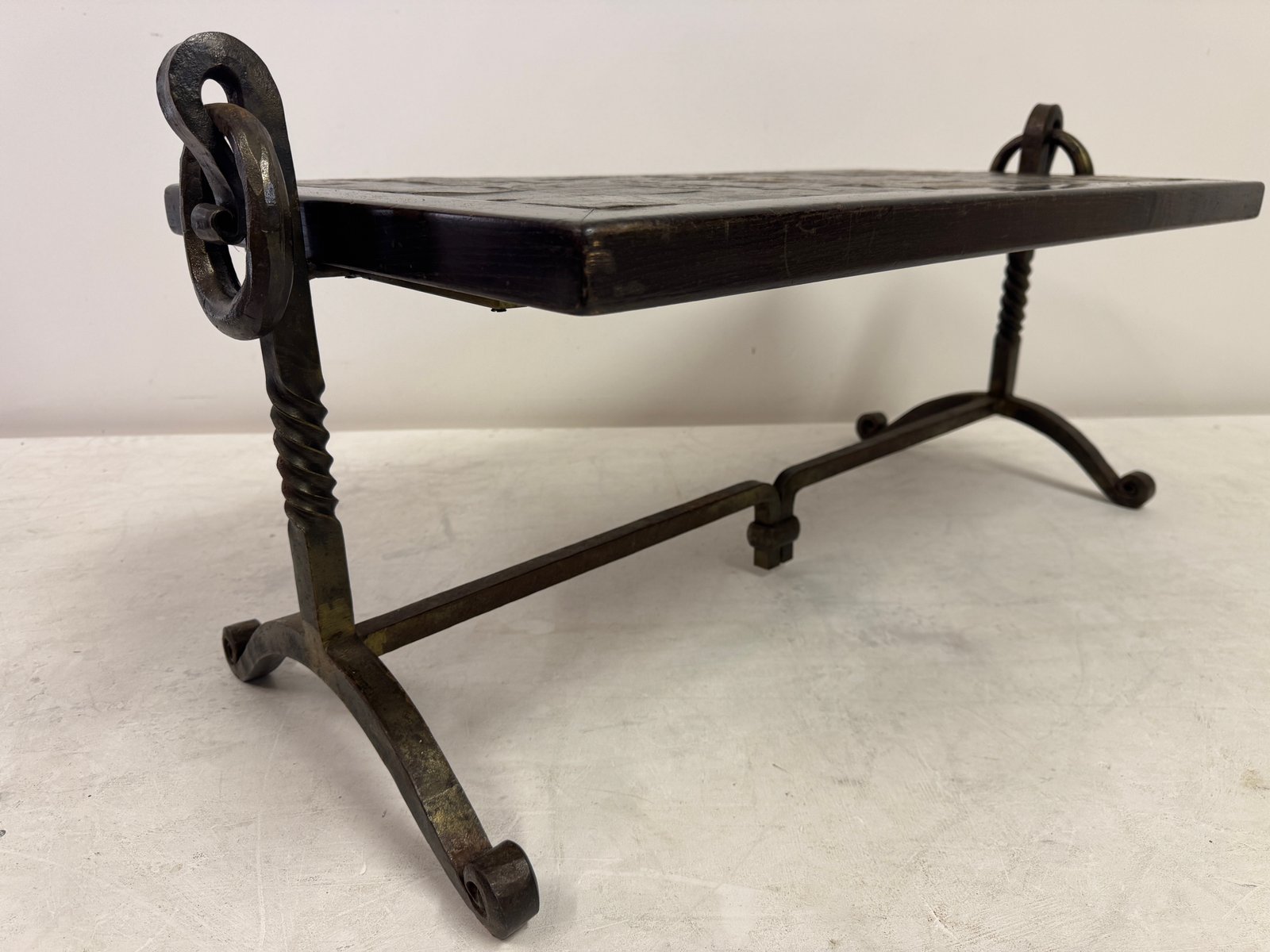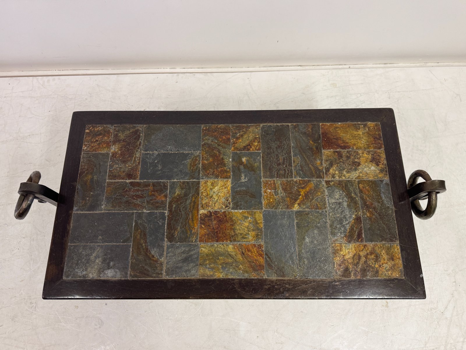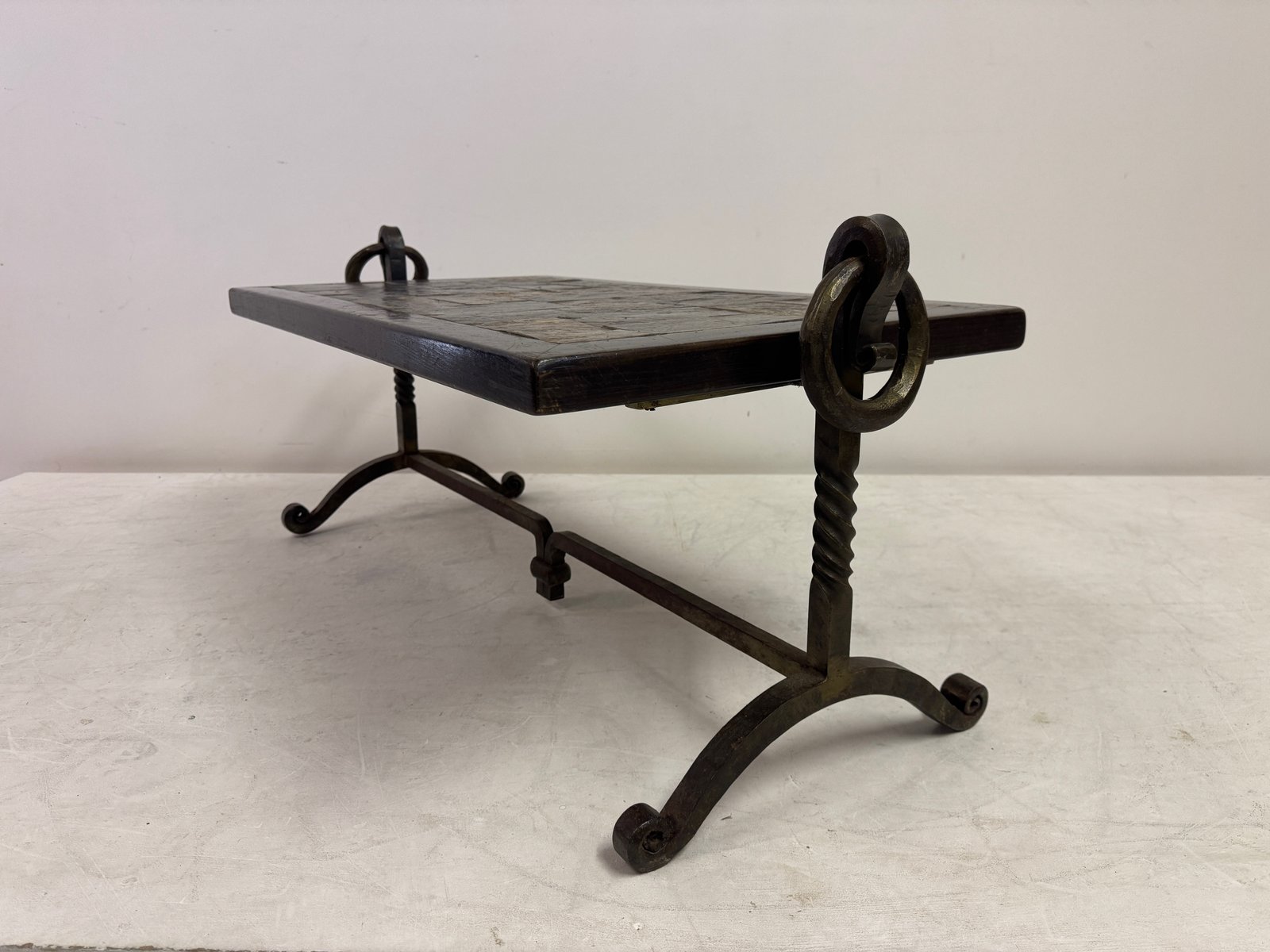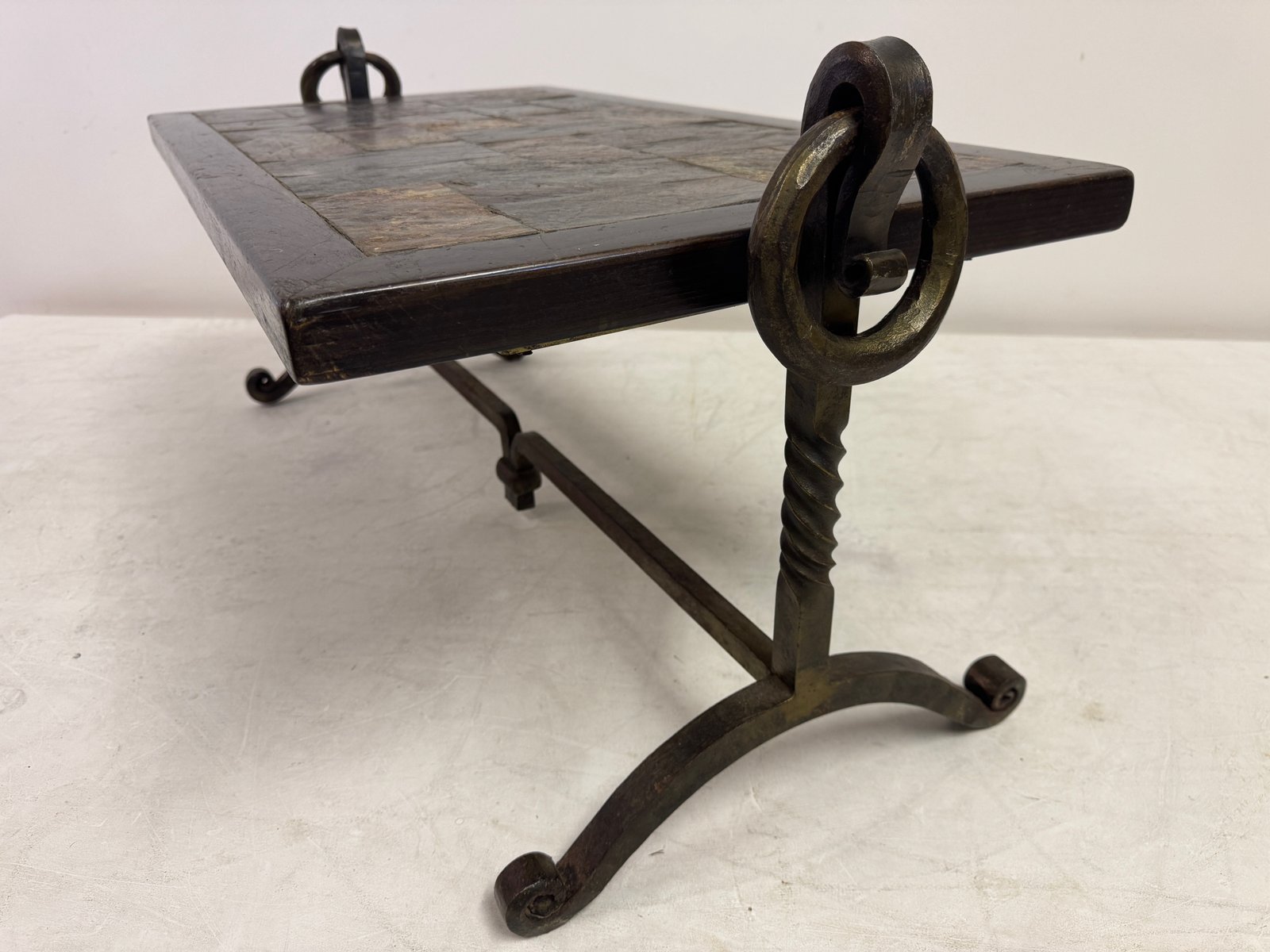 Ein niedriger rechteckiger Couchtisch mit einer dunklen Schieferplatte, die in einen schwarz gebeizten Holzrahmen eingelassen ist und auf einem schmiedeeisernen Untergestell ruht. Die Oberfläche besteht aus einzeln geschnittenen Steinfliesen mit natürlichen Farbvariationen, die dem Tisch einen subtilen brutalistischen Charakter und eine starke materielle Präsenz verleihen. Das Eisenuntergestell besteht aus sanft geschwungenen Beinen und einer zentralen Strebe, die dem Tisch optisches Gewicht verleihen und ihn gleichzeitig ausgewogen und gut proportioniert erscheinen lassen. Der Kontrast zwischen der strukturierten Steinoberfläche und der skulpturalen Eisenkonstruktion verleiht dem Möbelstück eine geerdete, architektonische Qualität. Der Tisch stammt wahrscheinlich aus den 1970er Jahren und passt gut in ein brutalistisches oder spätmodernes Interieur, eignet sich aber ebenso gut für Wohnräume wie für kuratierte Umgebungen im Galeriestil. Guter Vintage-Zustand mit alters- und gebrauchsbedingten Gebrauchsspuren.