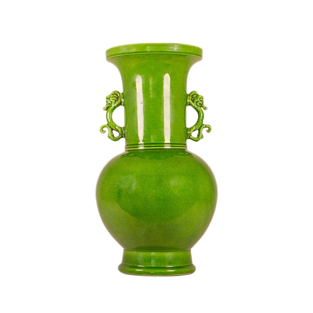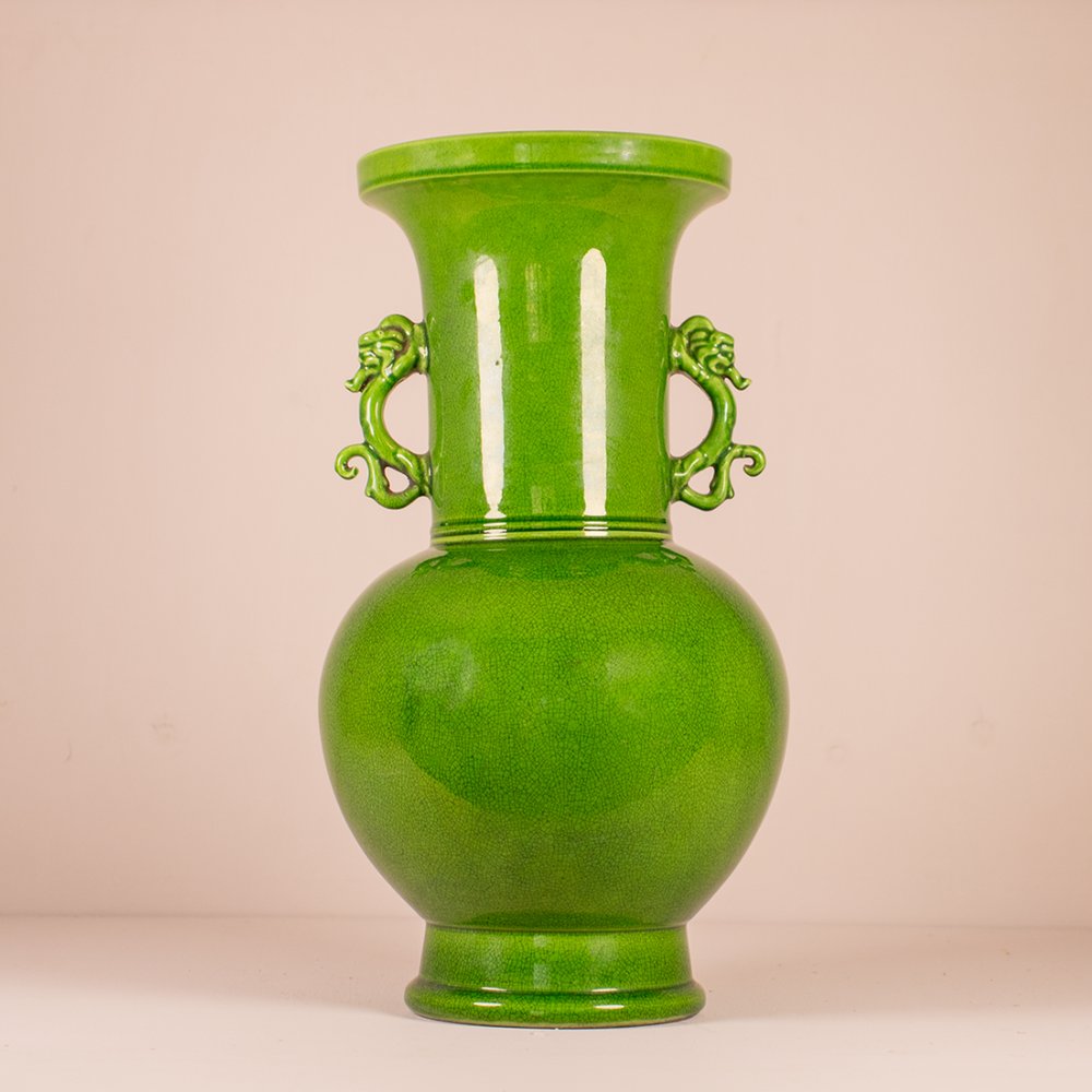 This Chinese green glaze dragon ear vase is a striking piece of Chinese porcelain. The vase is characterised by its intense green glaze and distinctive dragon ear handles. These handles, with their detailed design, are a typical element of Chinese porcelain from certain periods.