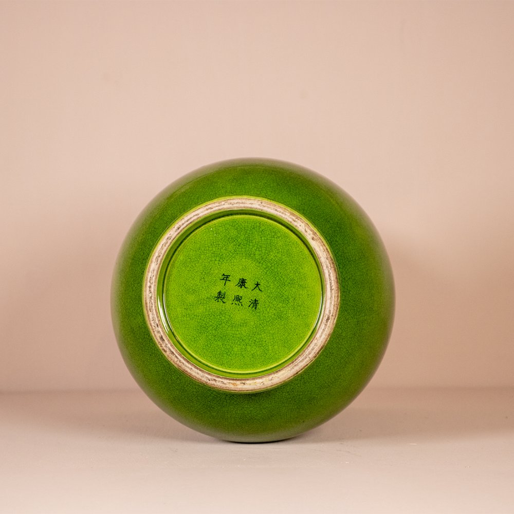 This vase is handmade and has a fine crackle in the glaze. This crackle, small cracks in the glaze, adds to the character of this unique piece. The bright, even green glaze is a striking feature of this vase.