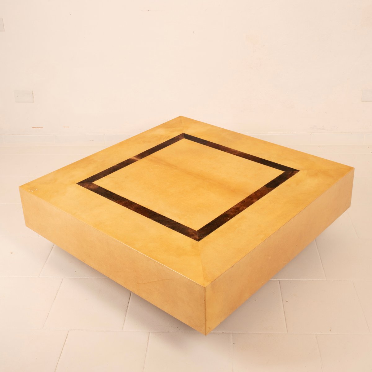 Niedriger Tisch, entworfen von Aldo Tura in den 1960er Jahren, aus Pergament oder Ziegenleder, handgefärbt in zwei verschiedenen Farbtönen: ein helles, warmes und leuchtendes Finish für die Hauptoberfläche und ein dunkleres, fast verbranntes Pergament für das zentrale, vertiefte geometrische Detail.