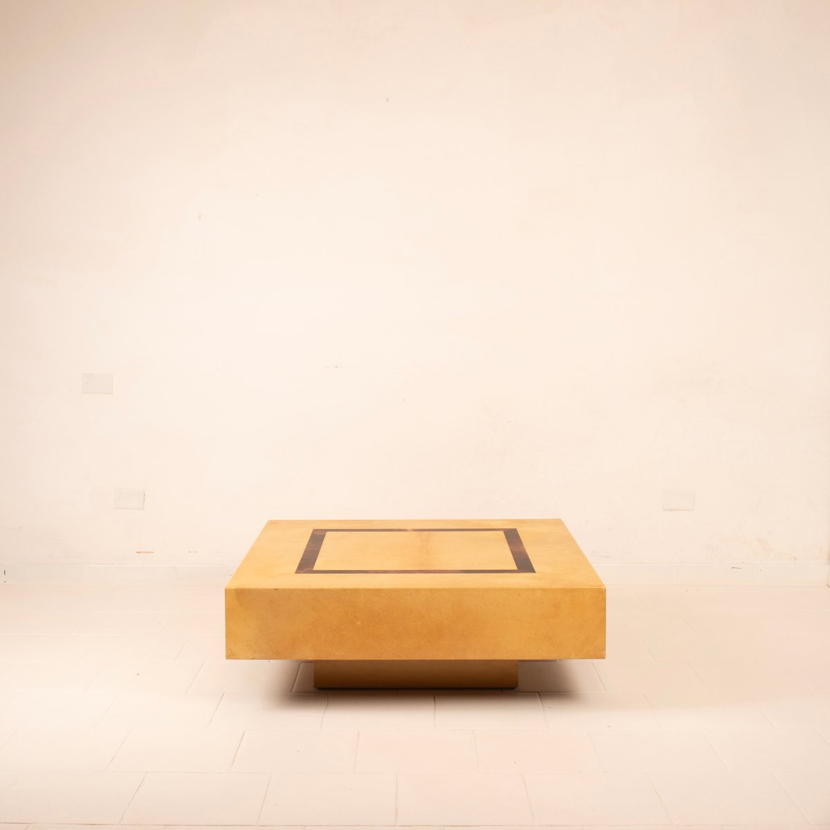 Unverwechselbares Design: Helle Pergamentoberfläche mit zentraler geometrischer Einlage aus dunklem Pergament, zurückgesetzter Sockel, der das Volumen optisch erhöht und seine Präsenz auflockert; maßvolle und grafische Farbkontraste