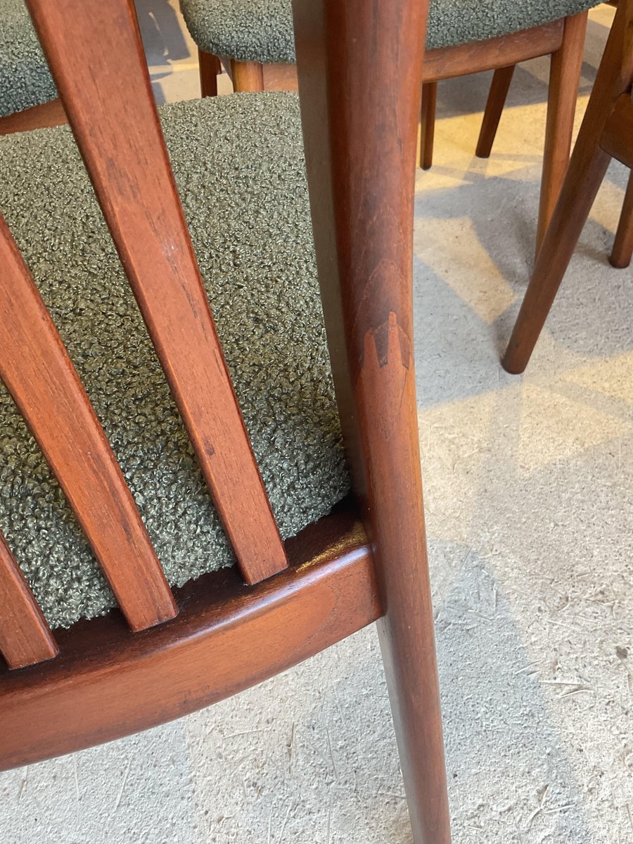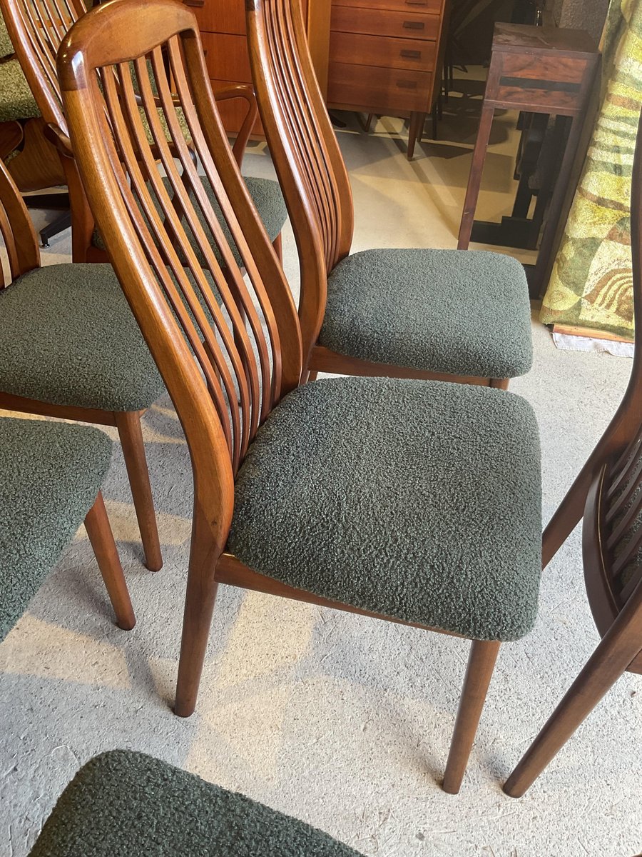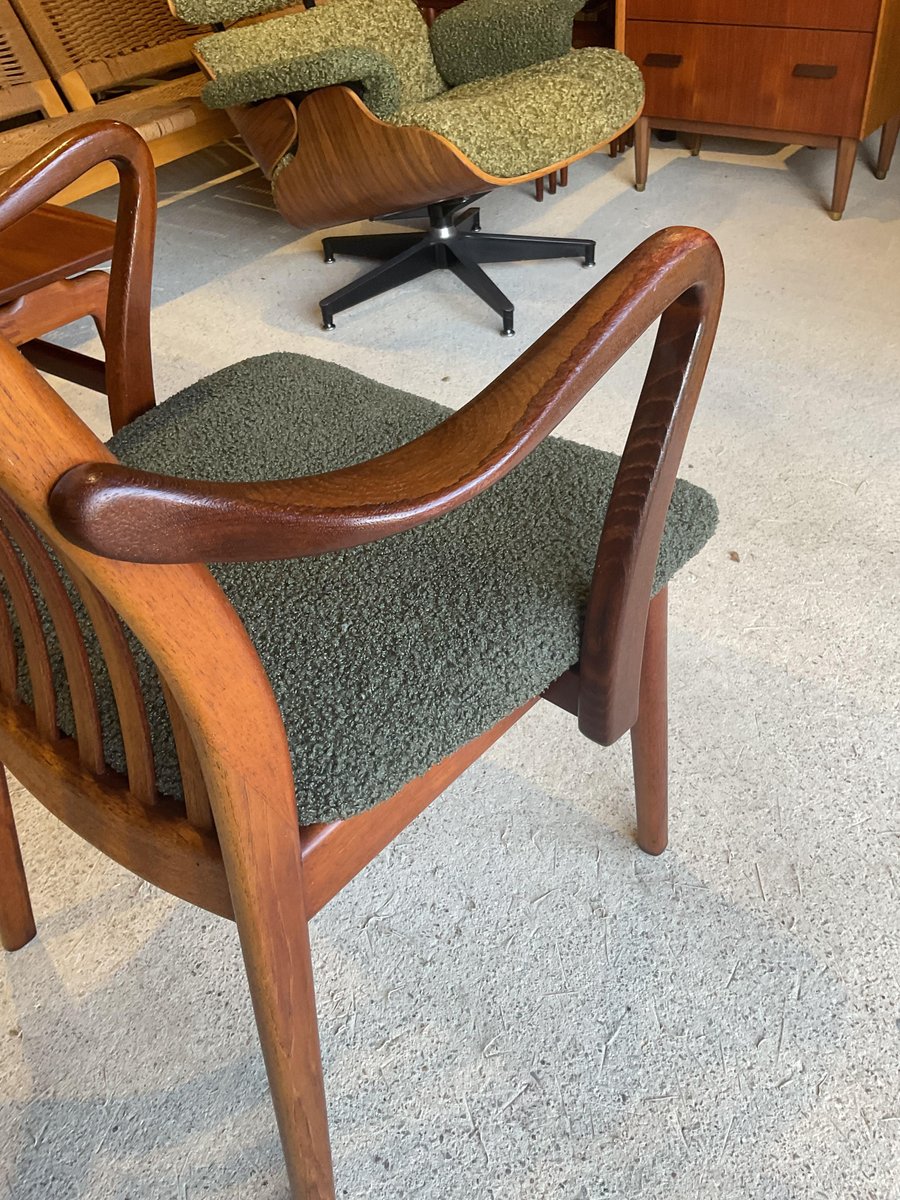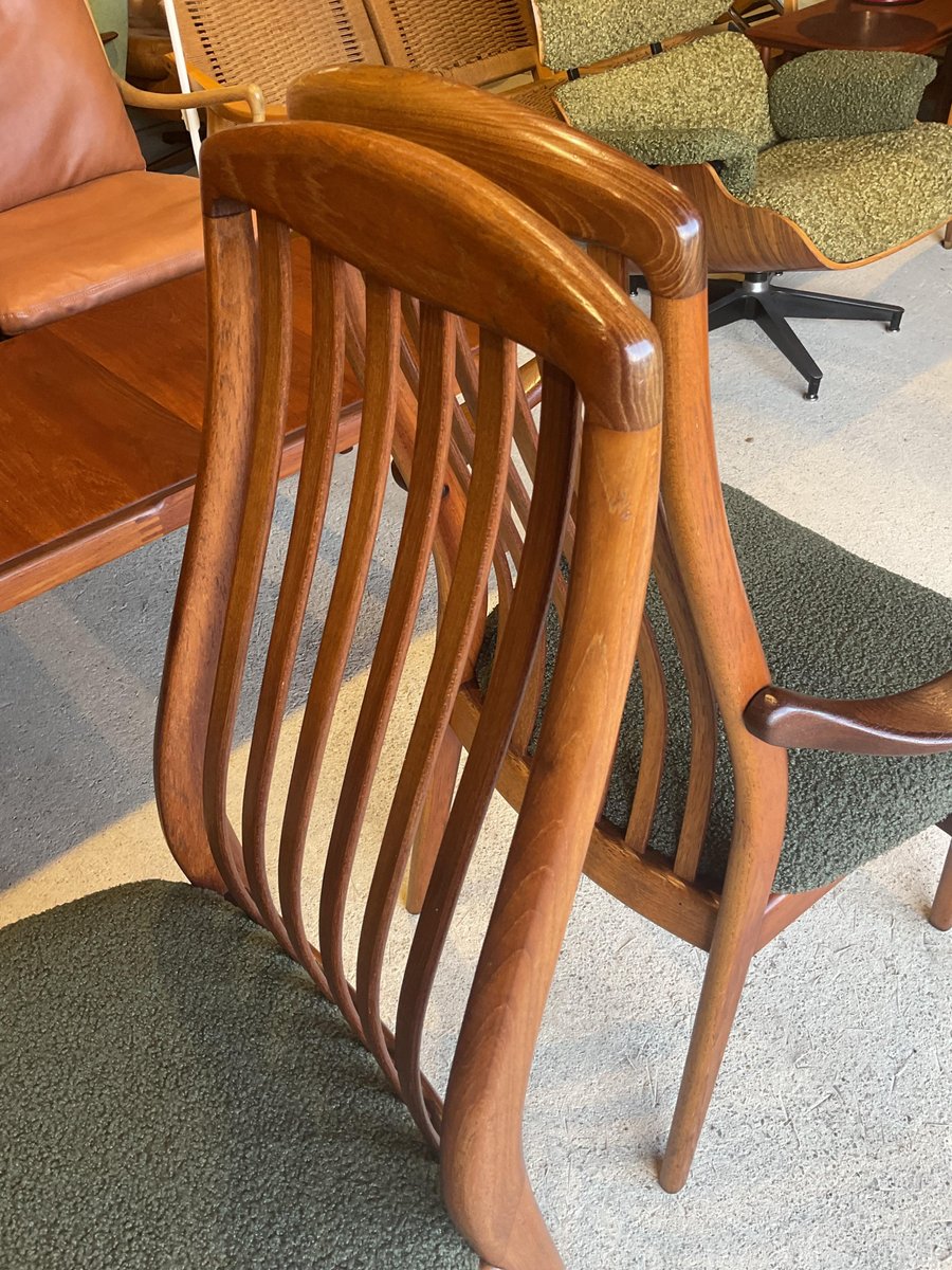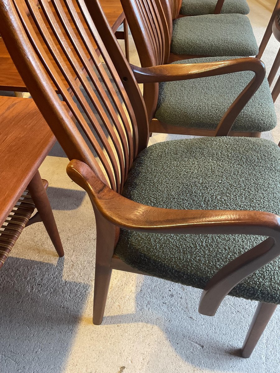In gutem gebrauchten Zustand, stabil und solide gebaut. Kleine altersbedingte Gebrauchsspuren am Gestell. Die aus Teakholz gefertigten Stühle haben hohe, geschwungene Rückenlehnen, die ihr elegantes Profil betonen, wobei zwei Exemplare mit sanft geformten Armlehnen ausgestattet sind. Die Sitze wurden mit einem grünen Bouclé-Stoff neu gepolstert, der Komfort bietet und gleichzeitig ihr klares, modernistisches Aussehen bewahrt. Die wohlproportionierte und fein gearbeitete Garnitur spiegelt die Qualität und Handwerkskunst wider, die man mit dem dänischen Design dieser Zeit verbindet. Ideal für einen großen Essbereich.