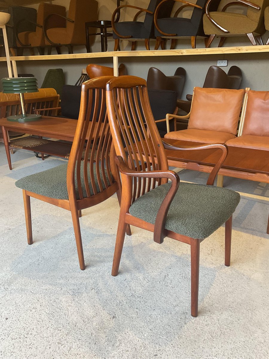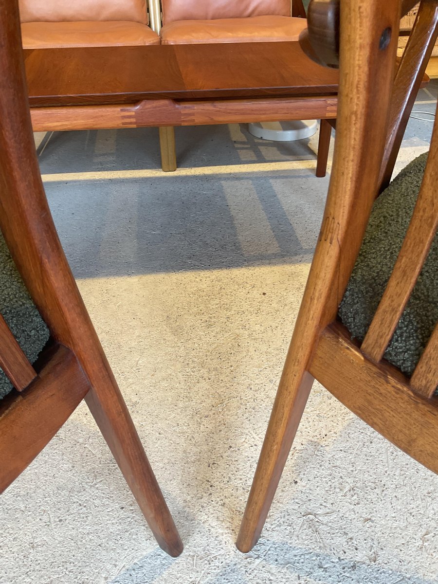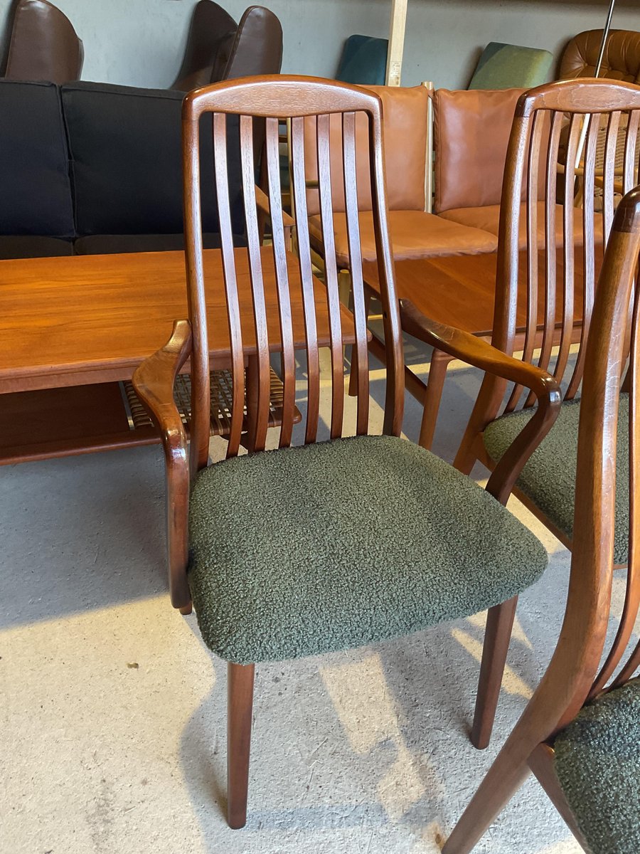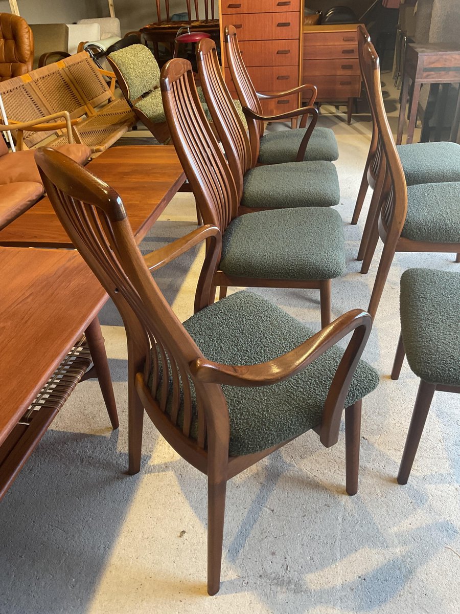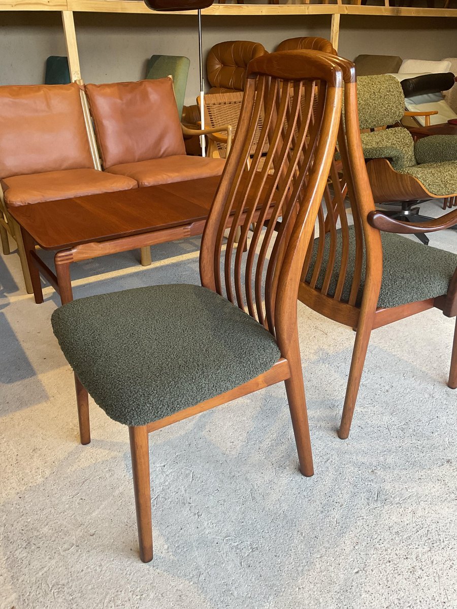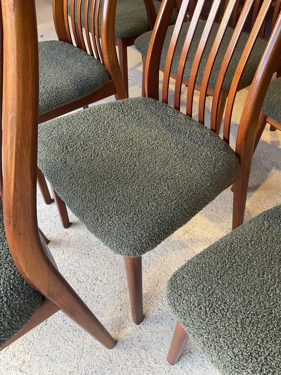 In gutem gebrauchten Zustand, stabil und solide gebaut. Kleine altersbedingte Gebrauchsspuren am Gestell. Die aus Teakholz gefertigten Stühle haben hohe, geschwungene Rückenlehnen, die ihr elegantes Profil betonen, wobei zwei Exemplare mit sanft geformten Armlehnen ausgestattet sind. Die Sitze wurden mit einem grünen Bouclé-Stoff neu gepolstert, der Komfort bietet und gleichzeitig ihr klares, modernistisches Aussehen bewahrt. Die wohlproportionierte und fein gearbeitete Garnitur spiegelt die Qualität und Handwerkskunst wider, die man mit dem dänischen Design dieser Zeit verbindet. Ideal für einen großen Essbereich.