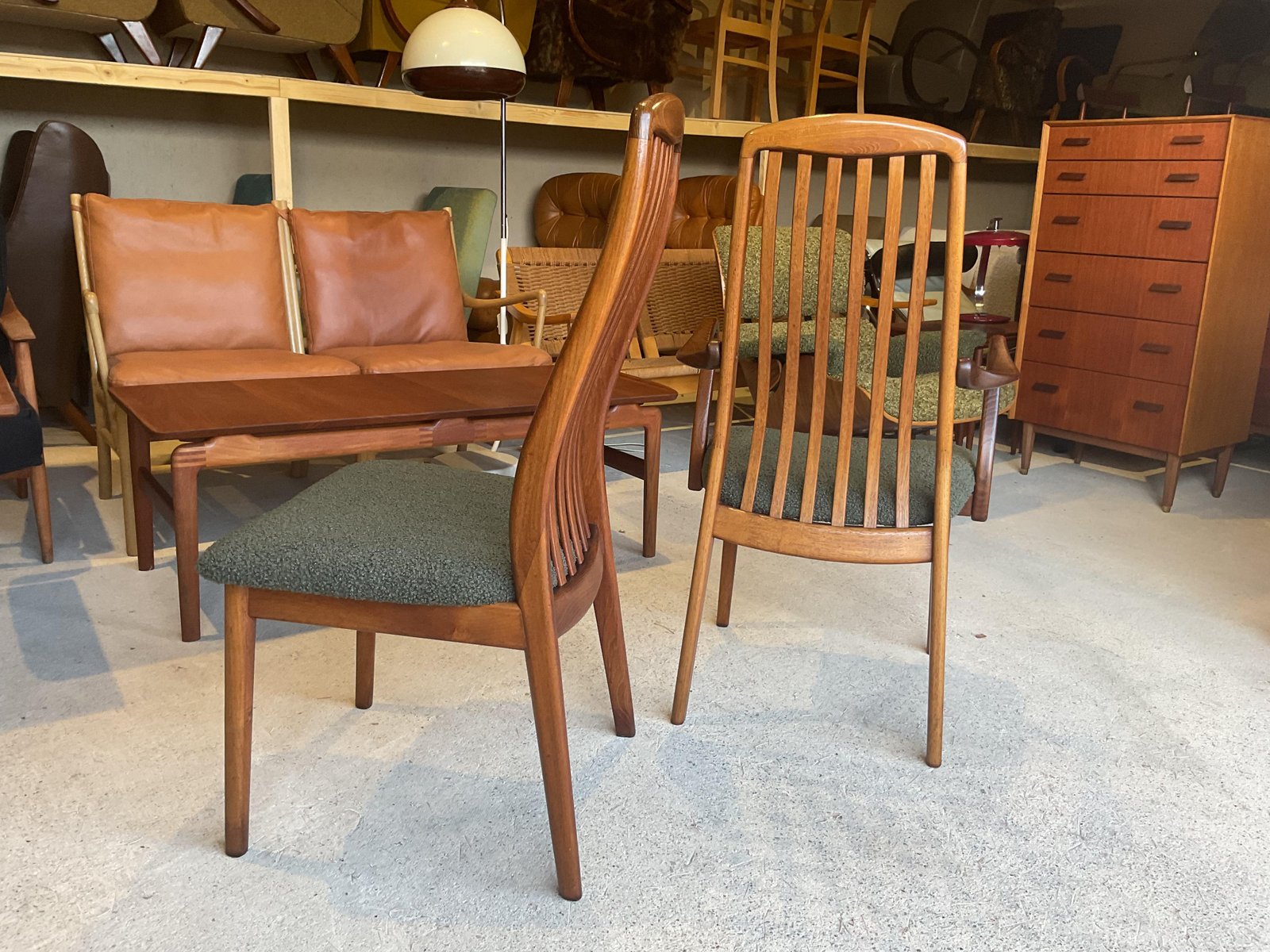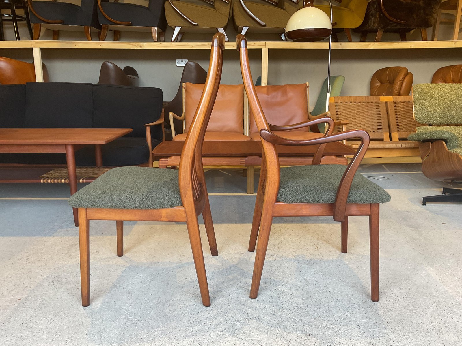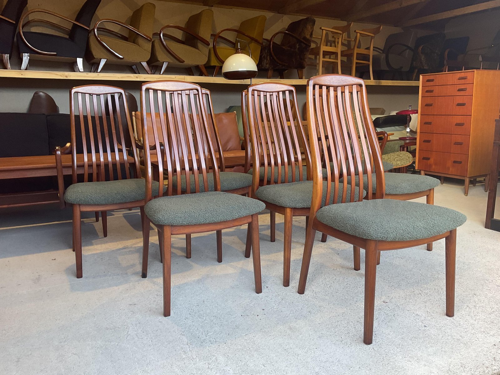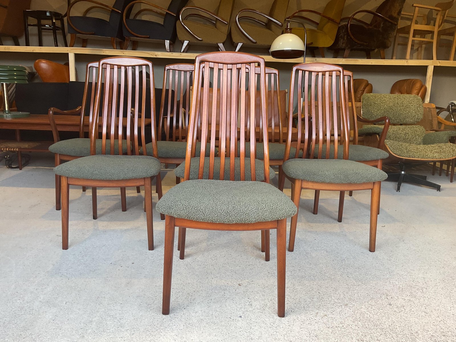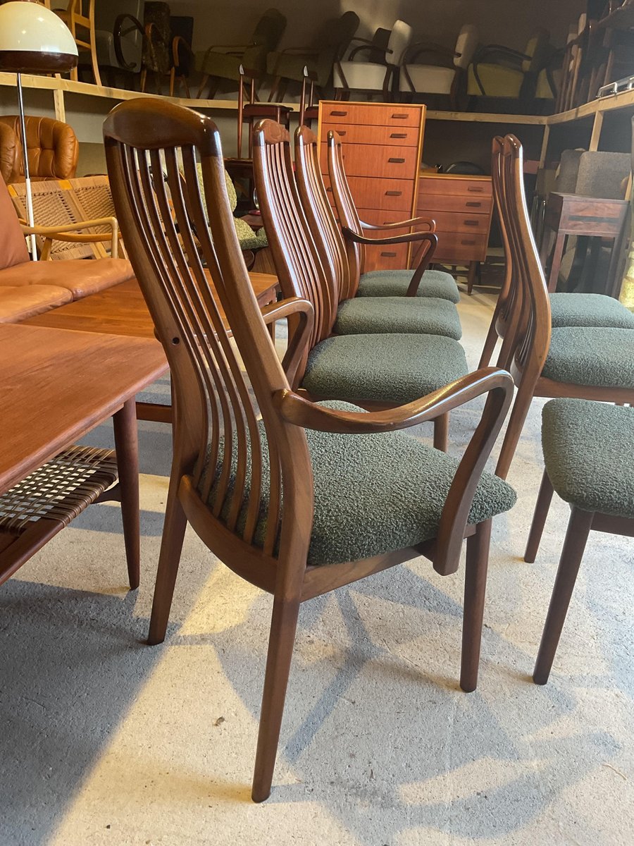 In gutem gebrauchten Zustand, stabil und solide gebaut. Kleine altersbedingte Gebrauchsspuren am Gestell. Die aus Teakholz gefertigten Stühle haben hohe, geschwungene Rückenlehnen, die ihr elegantes Profil betonen, wobei zwei Exemplare mit sanft geformten Armlehnen ausgestattet sind. Die Sitze wurden mit einem grünen Bouclé-Stoff neu gepolstert, der Komfort bietet und gleichzeitig ihr klares, modernistisches Aussehen bewahrt. Die wohlproportionierte und fein gearbeitete Garnitur spiegelt die Qualität und Handwerkskunst wider, die man mit dem dänischen Design dieser Zeit verbindet. Ideal für einen großen Essbereich.