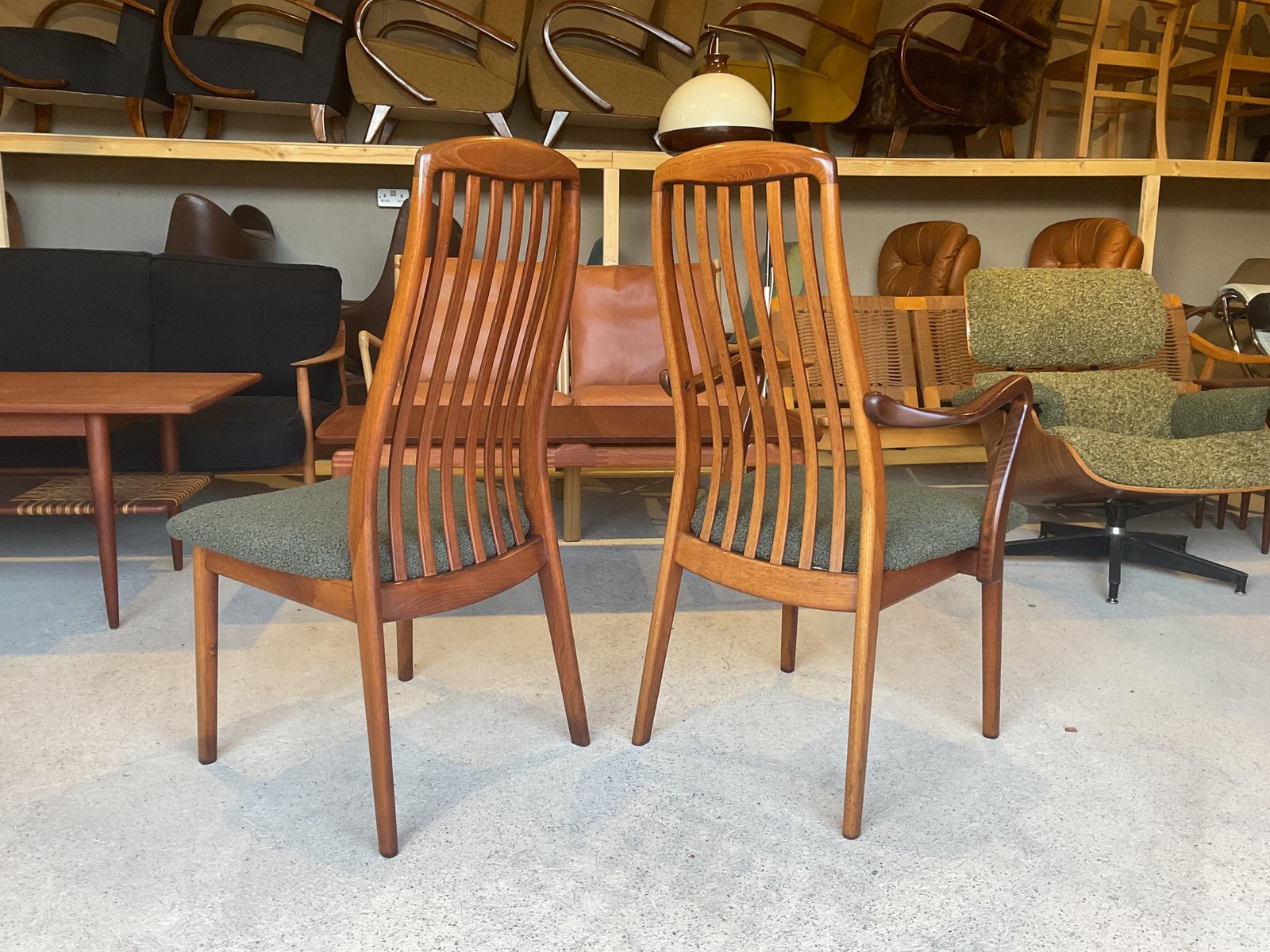 In good used condition, stable and sound in construction. Small age related signs of use on frame. Crafted in teak, the chairs feature tall, curved slatted backs that emphasise their elegant profile, with two examples incorporating gently shaped armrests. The seats have been reupholstered in a green boucle fabric, offering comfort while retaining their clean modernist look. Well-proportioned and finely constructed, this set reflects the quality and craftsmanship associated with Danish design of the period. Ideal for a large dining setting.