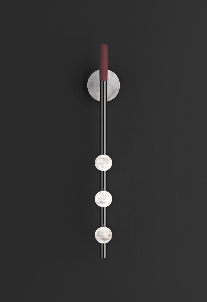 Demetra Shiny Black Metal Wall Lamp by Alabastro Italiano Dimensions: D 9 x W 10 x H 60 cm. Materials: White alabaster, metal and leather. Available in different finishes: Shiny Silver, Bronze, Brushed Brass, Ruggine of Florence, Brushed Burnished, Shiny Gold, Brushed Black, Freedom Green, Shiny Black and Copper. Please contact us. All our lamps can be wired according to each country. If sold to the USA it will be wired for the USA for instance. The name Demetra, goddess of flora, sister of Zeus, fully reflects the particular shape of this series by Alabastro Italiano. The spheres, of pure hand-turned alabaster, look like fruits hanging from the branches of a hypothetical tree of light. These brilliant elements stand out between heaven and earth and symbolize the richness that only Mother Nature can offer us. After years of experience in the family business, which specializes in design and lighting, Riccardo and Alberto Ongarato found the brand Alabastro Italiano. Each project is conceived and designed to give a strong sign of recognizability and uniqueness. The use of precious materials such as alabaster, brass, leather and blown glass, worked by the skilful hands of our craftsmen, are combined to create “timeless” objects. from the depths of the earth to the light of the sun. ALABASTRO ITALIANO care about these extremes and transcends them in a creative dynamic that emphasizes simplicity and clean-cut lines. The company has created an entirely new project MADE IN ITALY, revolutionizing the previously existing collections into eternal and evergreen lighting elements. By designing clean-cut and original lines, built-in with the latest technology and continuously innovating, ALABASTRO ITALIANO has never lost sight of its goal: perfection. The result of this work is an extraordinary collection of alabaster lightings. Alabaster needs human hands to come to life. The charm of these stone objects comes from their uniqueness, from the fact that they come from the hand of those who has left a mark and a memory with their work, each grain makes each piece unique. Alabaster needs human hands to come to life. The charm of these stone objects comes from their uniqueness, from the fact that they come from the hand of those who has left a mark and a memory with their work, each grain makes each piece unique. Alabaster is a Material that leaves little traces of magic all around it. It is difficult to identify the exact point where the Material ends and its reflection begins. It is impossible to understand how far the light sinks in its soft transparency. It changes according to the positions in which it is placed, depending on the point of view. Alabaster is a compact and rare stone that lays down very precise laws requires a familiarity that only Italian craftsmen possess. Alabastro Italiano collaborates with each client to create a unique project. Starting from the advice for better architectural lighting, it brings its know-how, materials, design and creative inspiration to interior architects and interior designers.