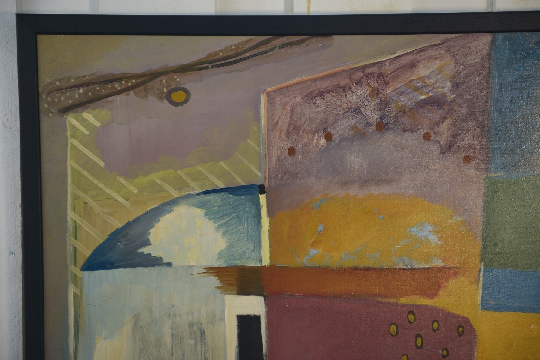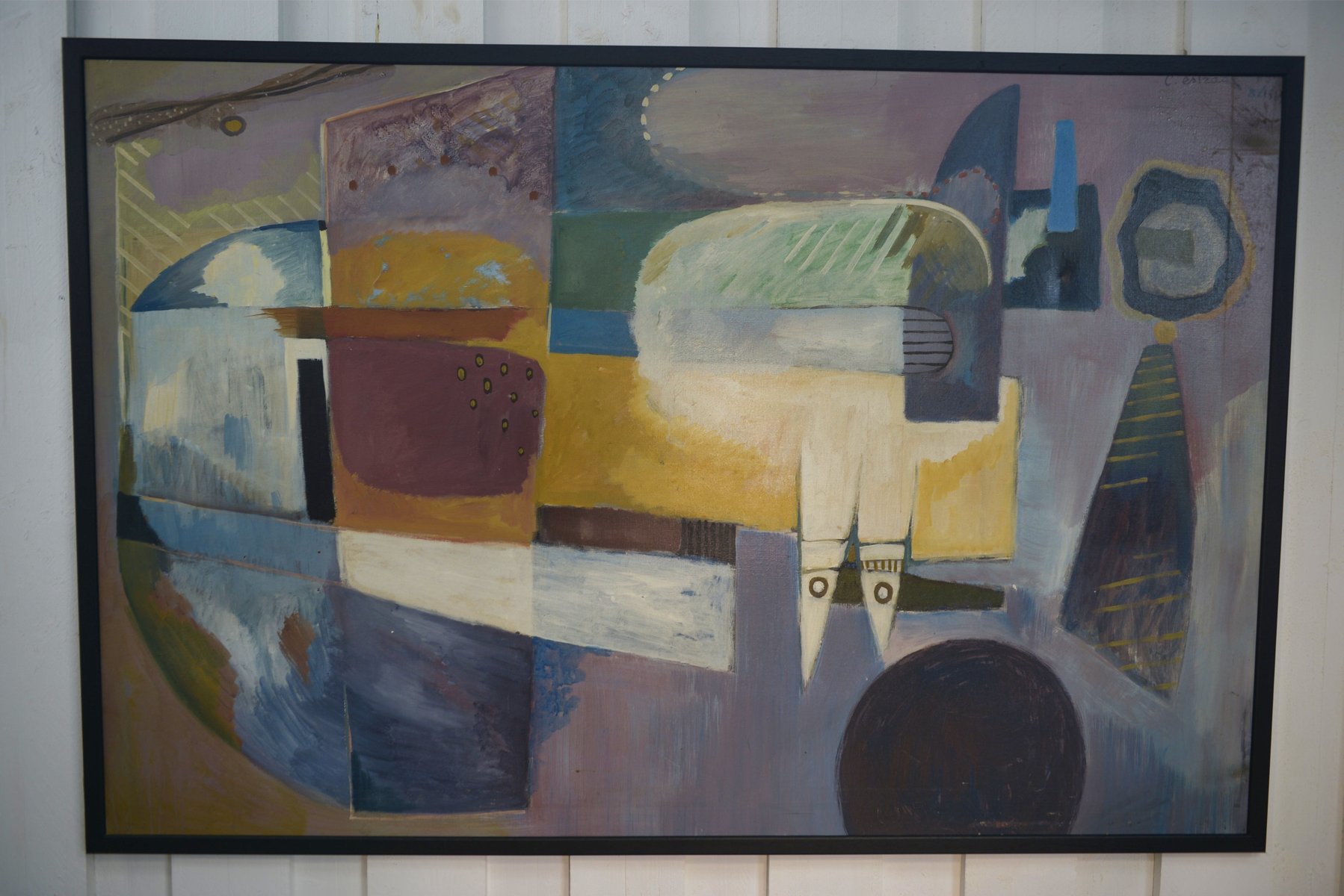Dieses abstrakte Gemälde mit der Jahreszahl 1969 (signiert "C. Elizaga") ist ein einzigartiges und äußerst dekoratives Werk, das eine architektonische Komposition entfaltet, in der sich farbige Flächen und grafische Symbole mit Präzision zusammenfügen.