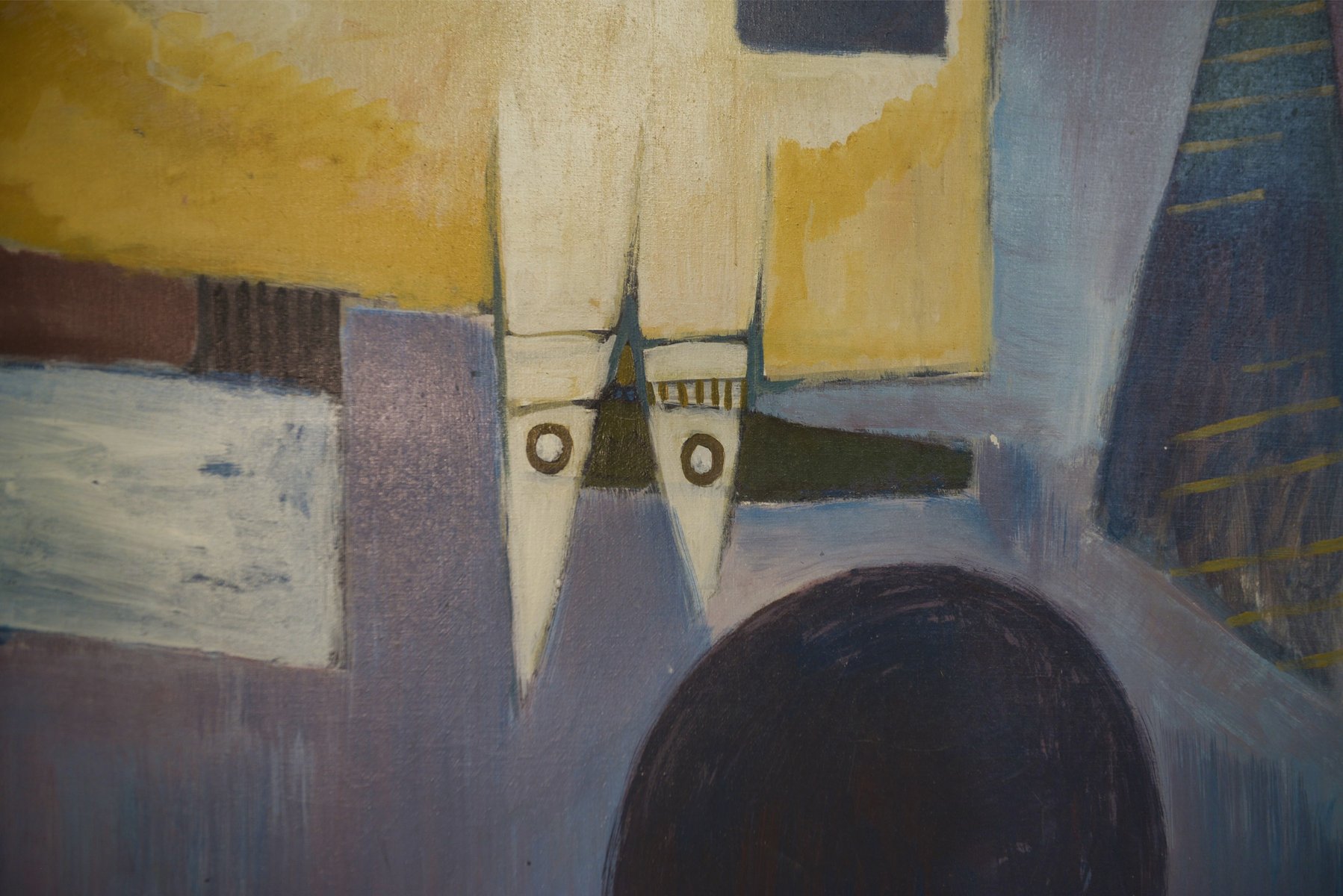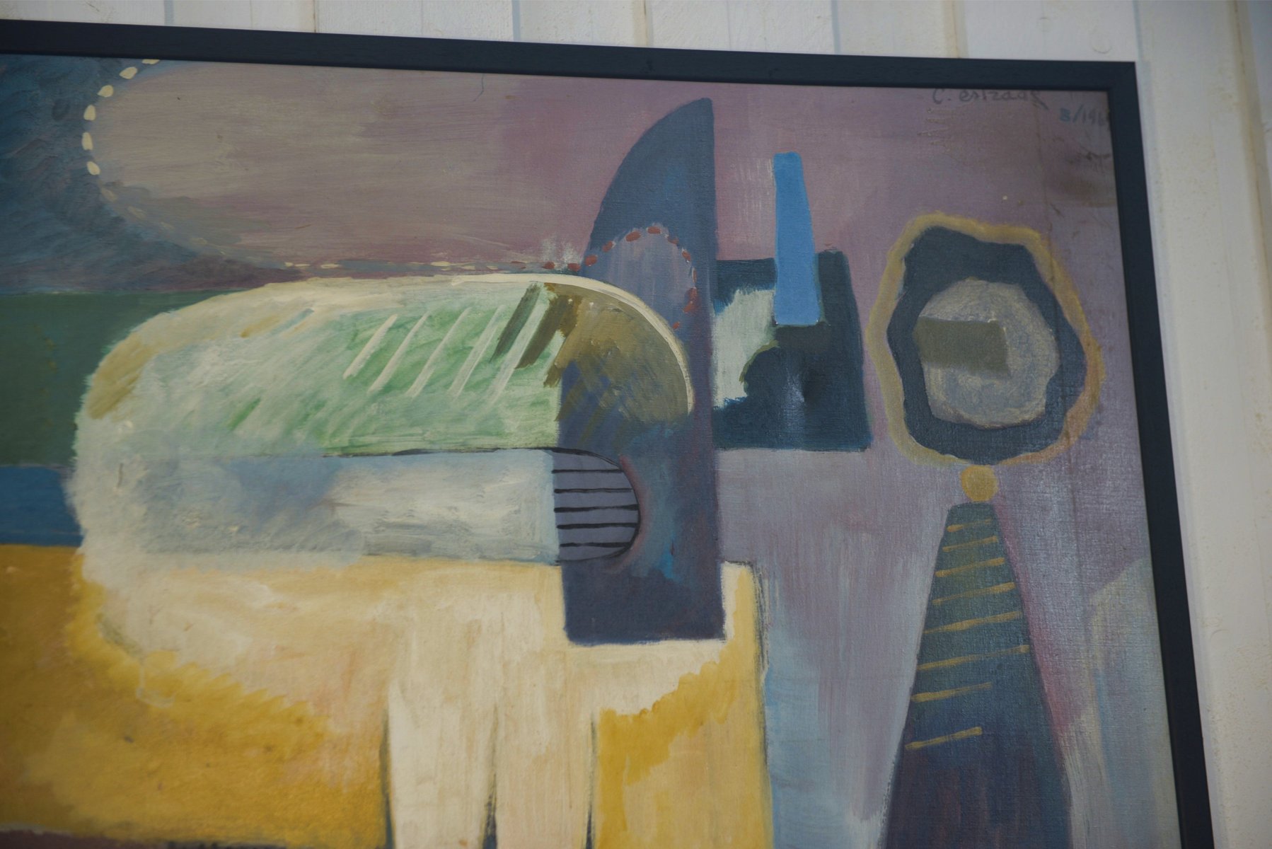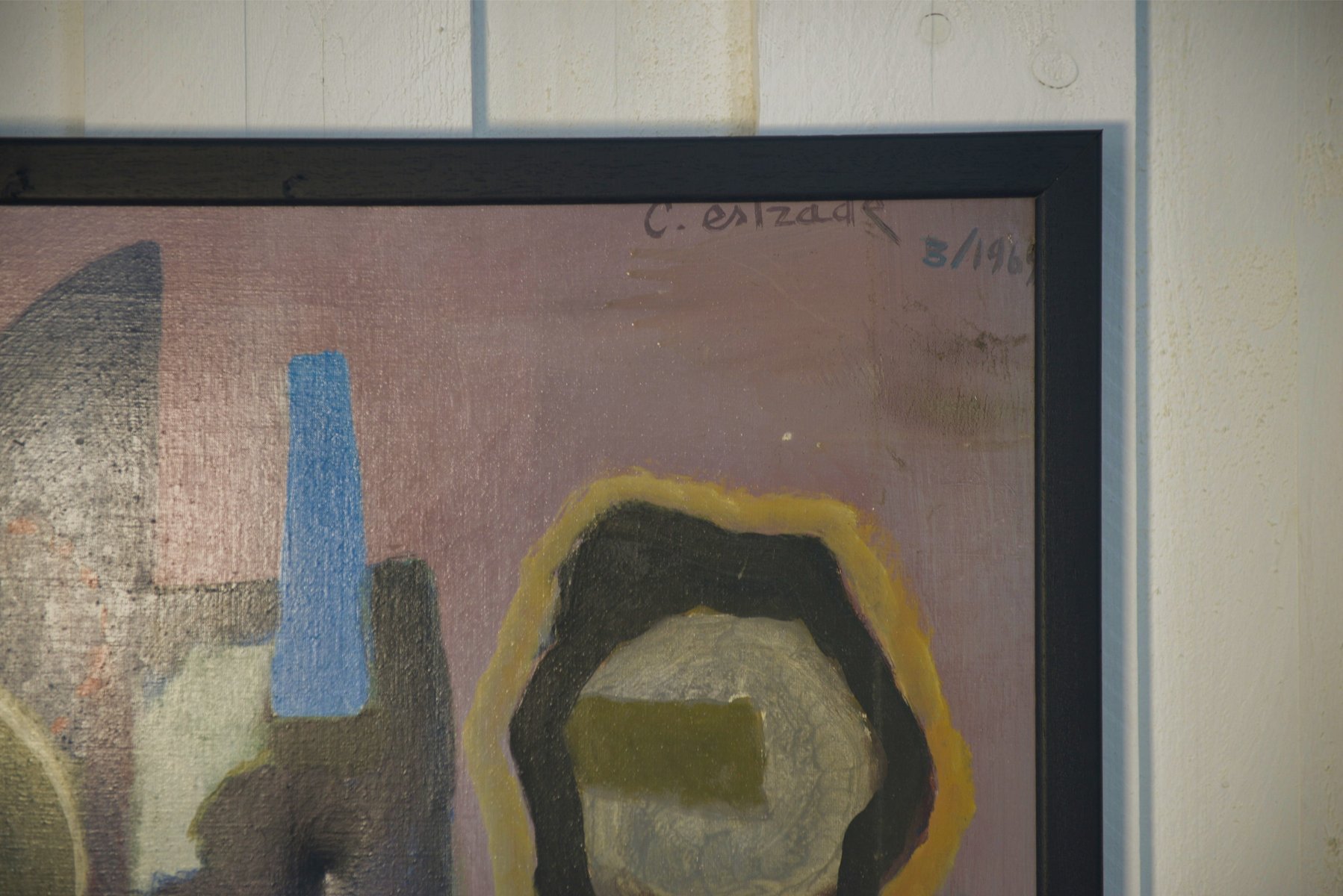 A unique and highly decorative piece, this abstract painting, dated 1969 (signed “C. Elizaga”), unfolds an architectural composition where colored planes and graphic symbols fit together with precision.