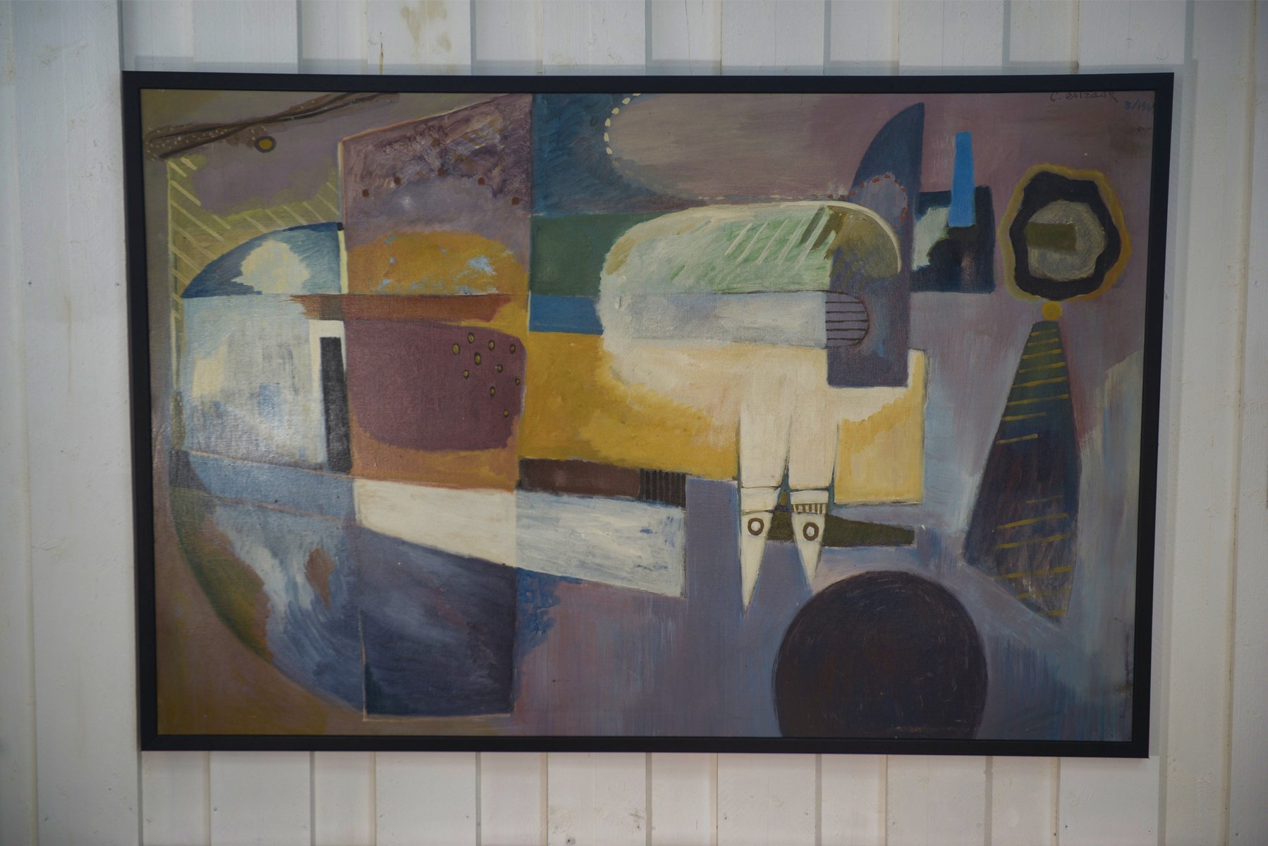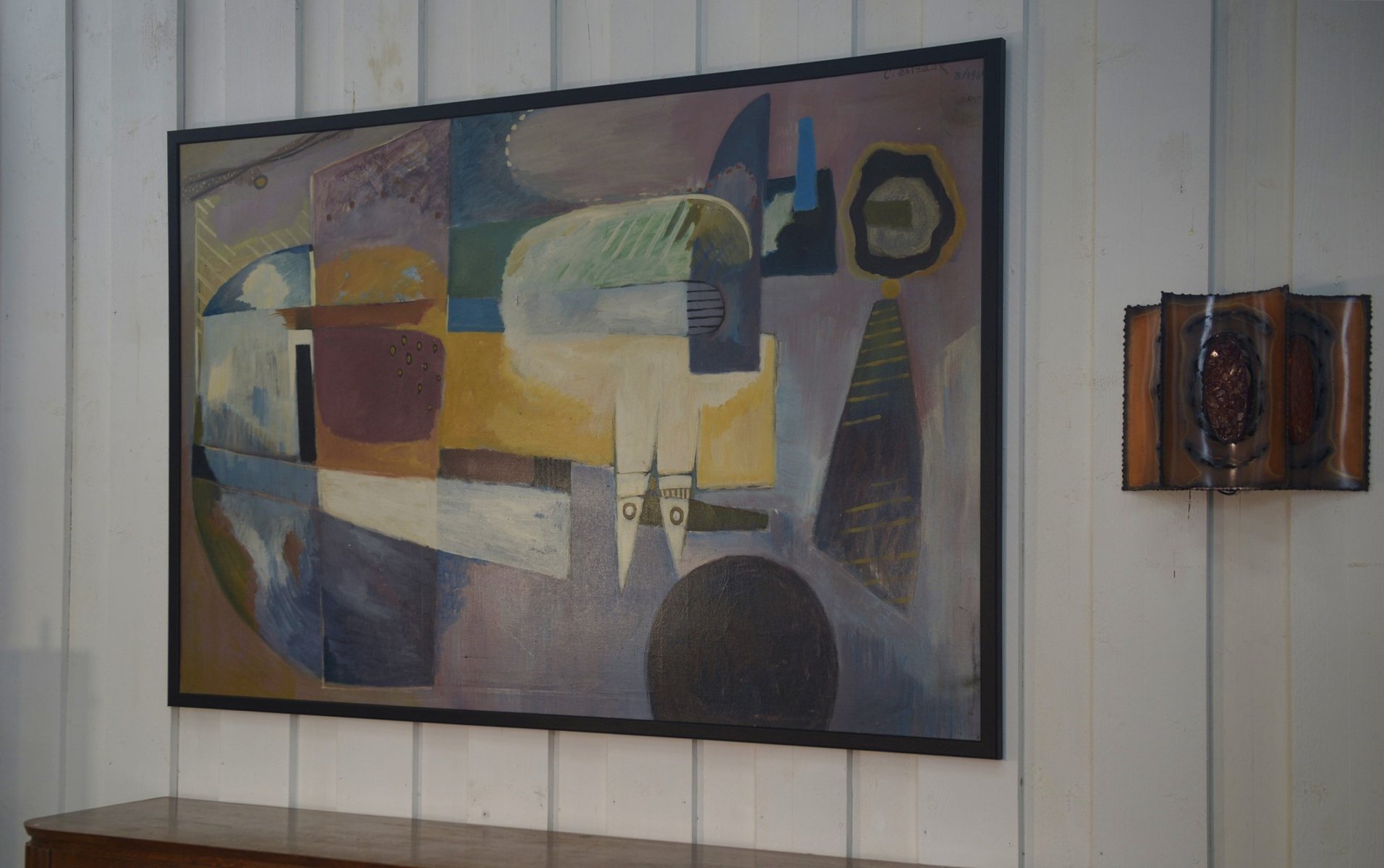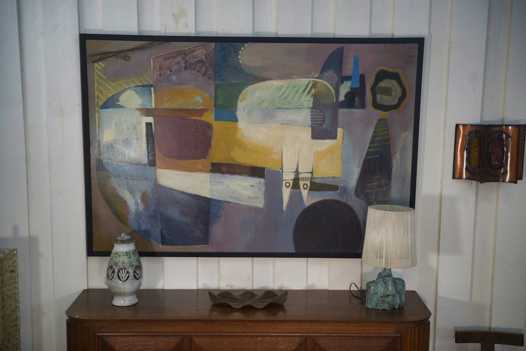 A unique and highly decorative piece, this abstract painting, dated 1969 (signed “C. Elizaga”), unfolds an architectural composition where colored planes and graphic symbols fit together with precision.