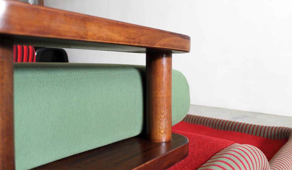 The Flying Rug or Tappeto Volante armchair is an iconic seat with a base and an armrest in beech wood, the seat, and the back are made with polyurethane foam padding with multicolored fabric, velvet, and carpeting.