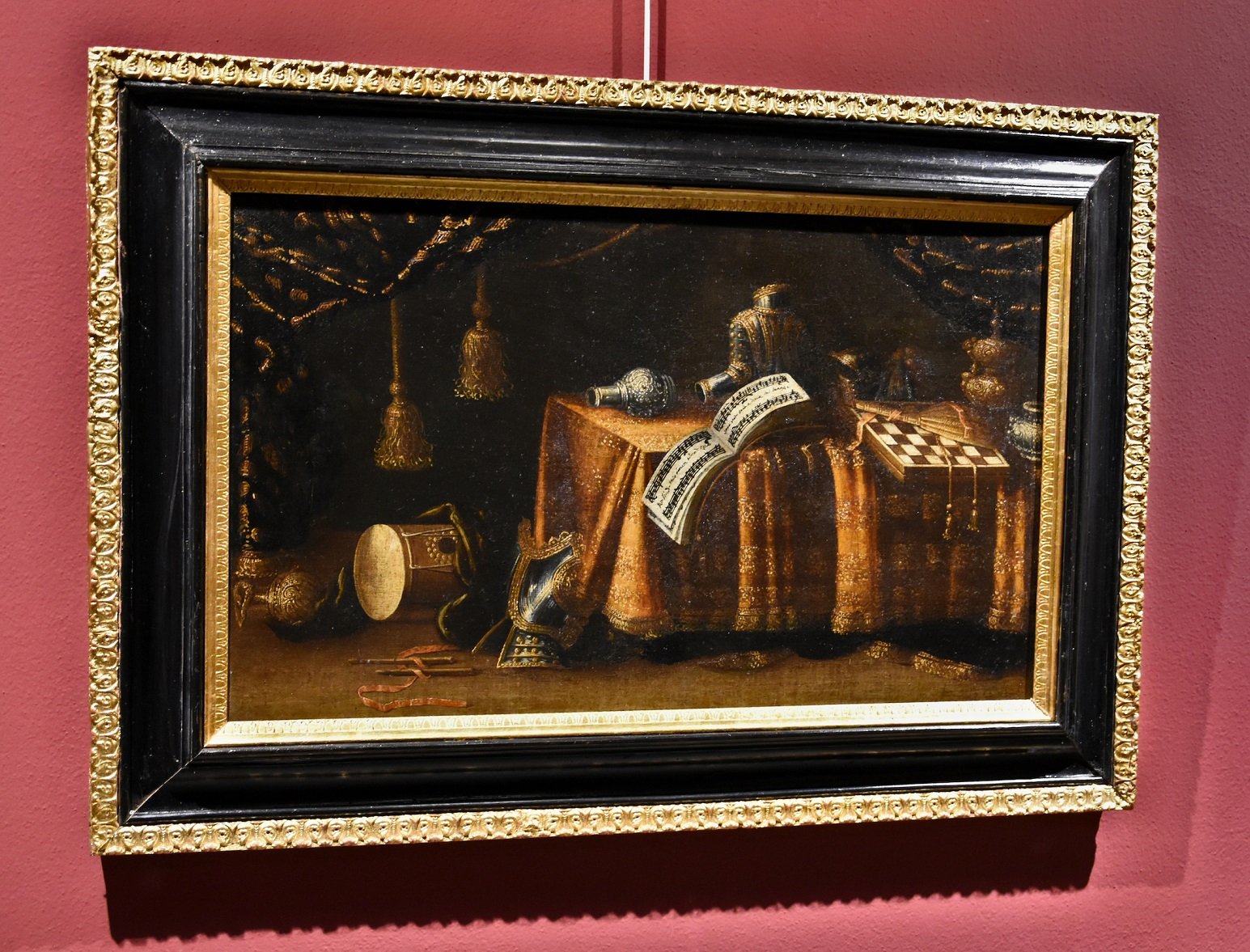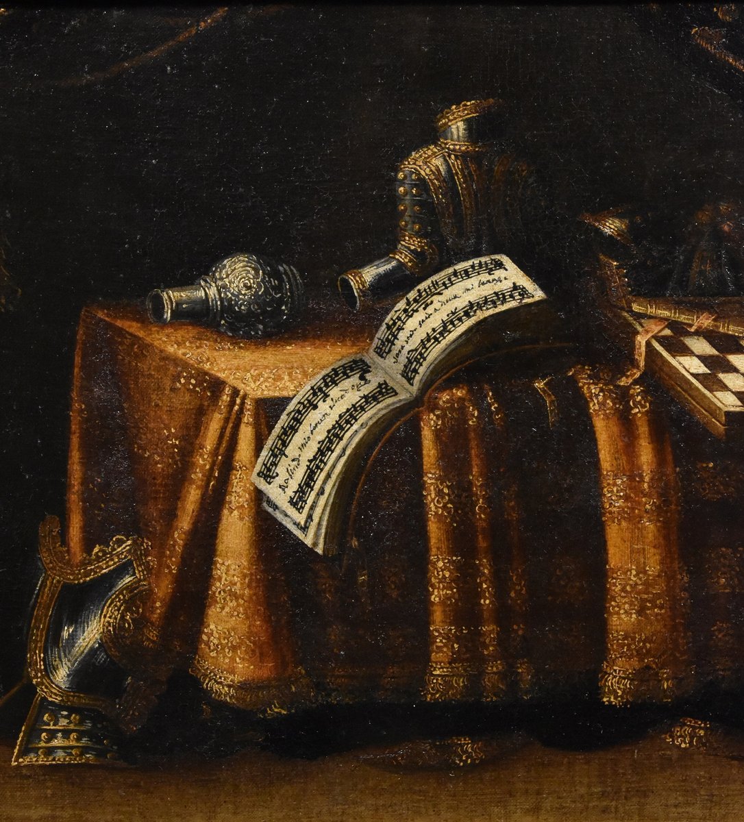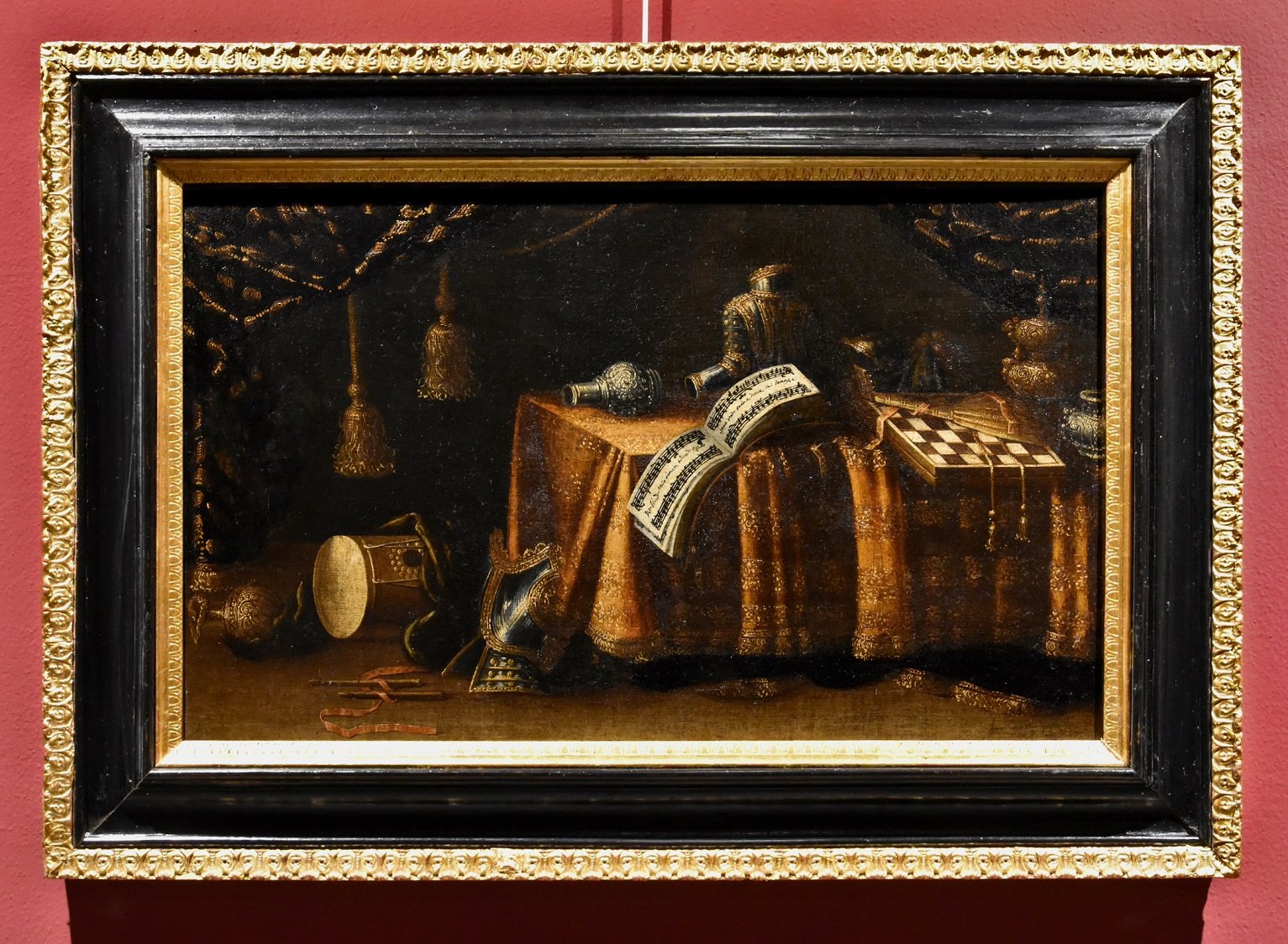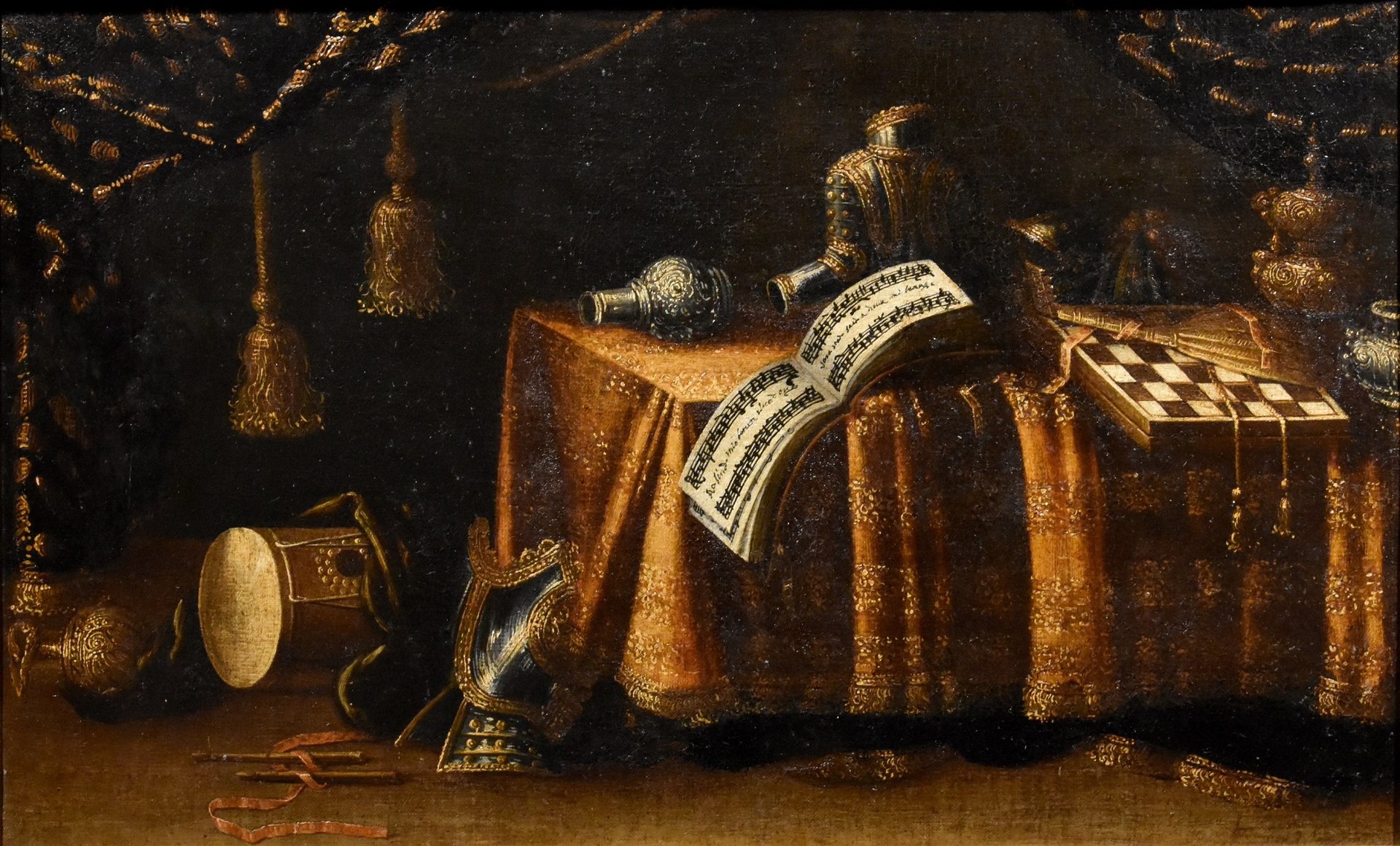 Among the objects our artist has reproduced, we can see parts of a suit of ceremonial armor with gold trim, jugs and plates made of precious metals, musical instruments including a tambourine with its sticks and a stringed instrument, a lute, and a sheet of music. The singular composition is completed by precious, finely chiseled, embossed, and gilded metal vessels and a chessboard.