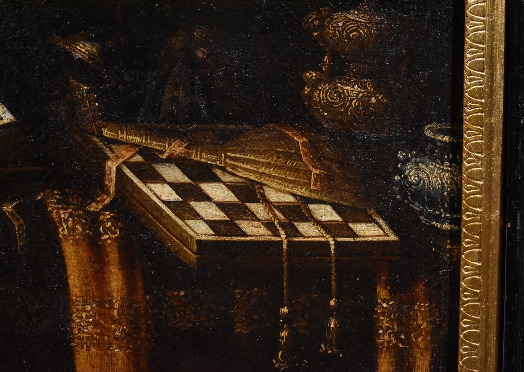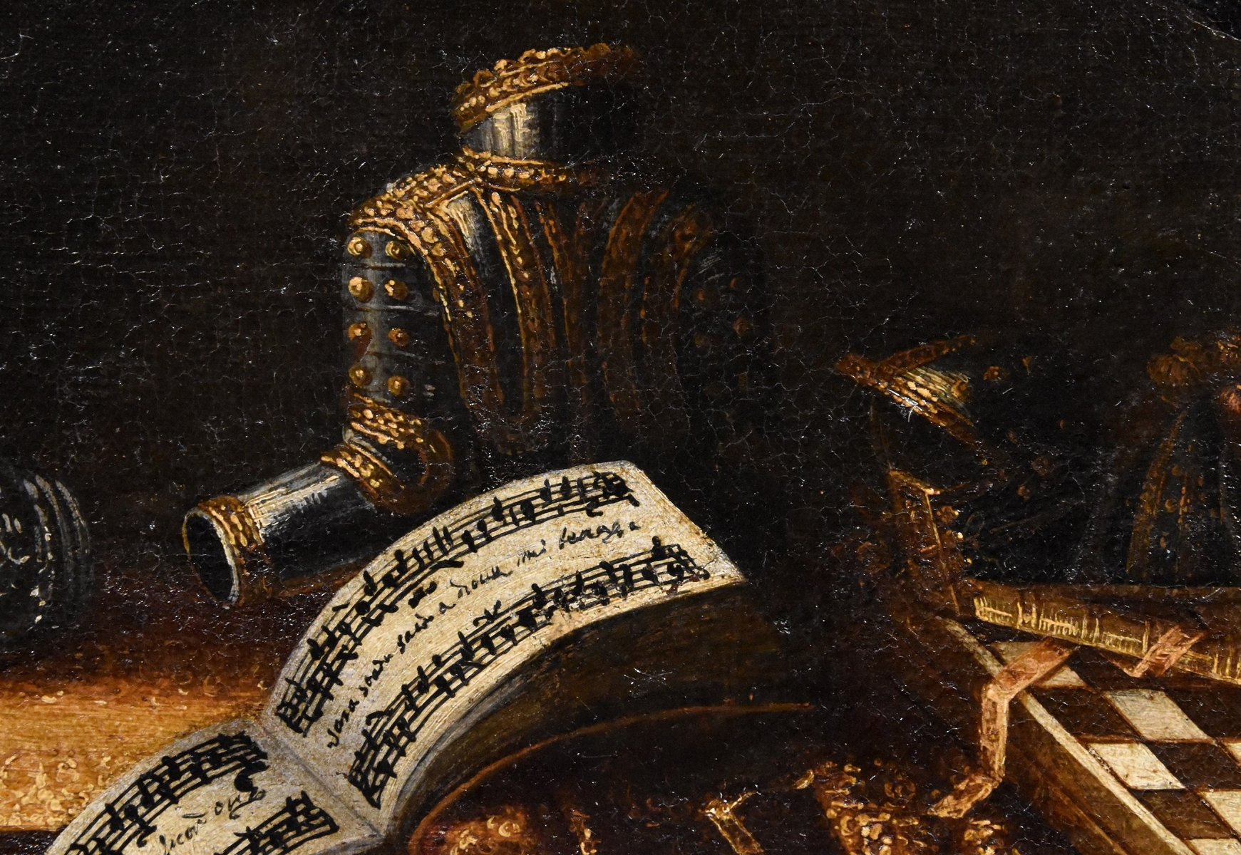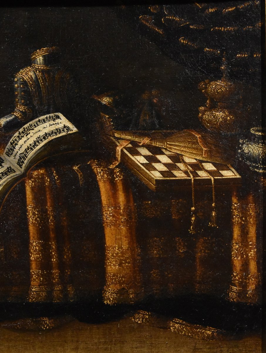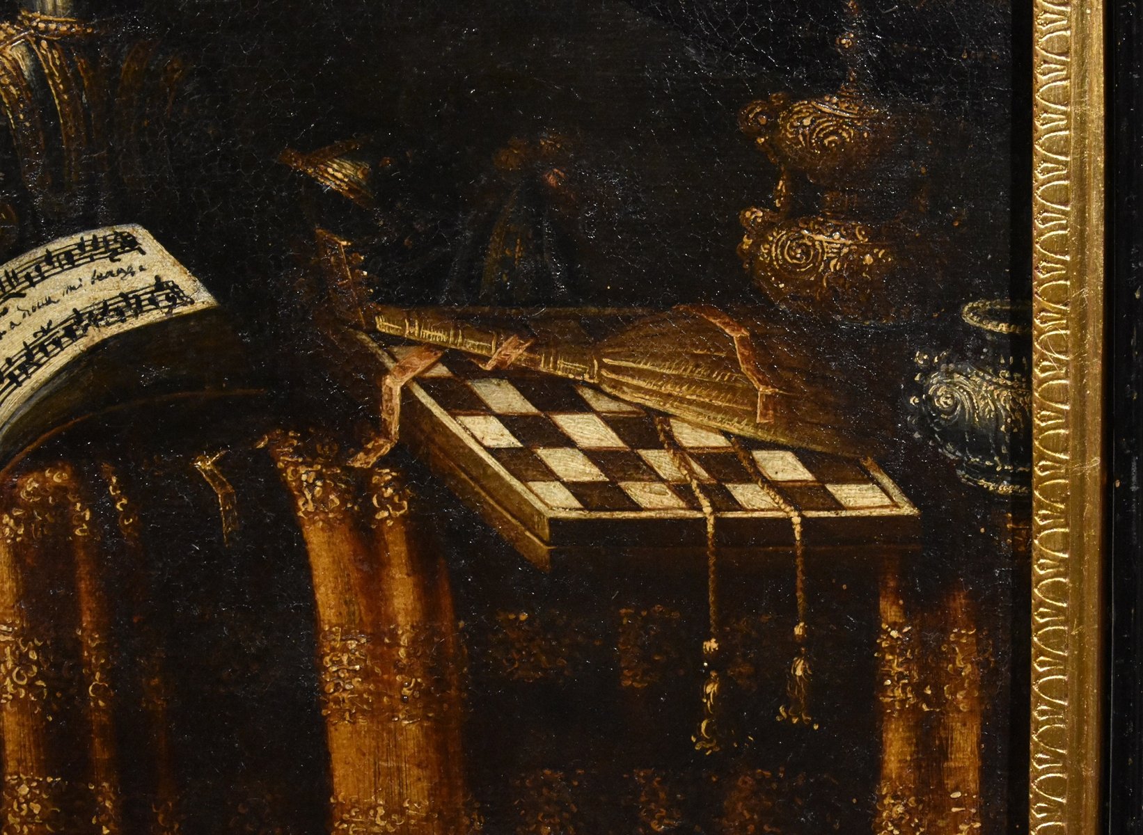 Among the objects our artist has reproduced, we can see parts of a suit of ceremonial armor with gold trim, jugs and plates made of precious metals, musical instruments including a tambourine with its sticks and a stringed instrument, a lute, and a sheet of music. The singular composition is completed by precious, finely chiseled, embossed, and gilded metal vessels and a chessboard.