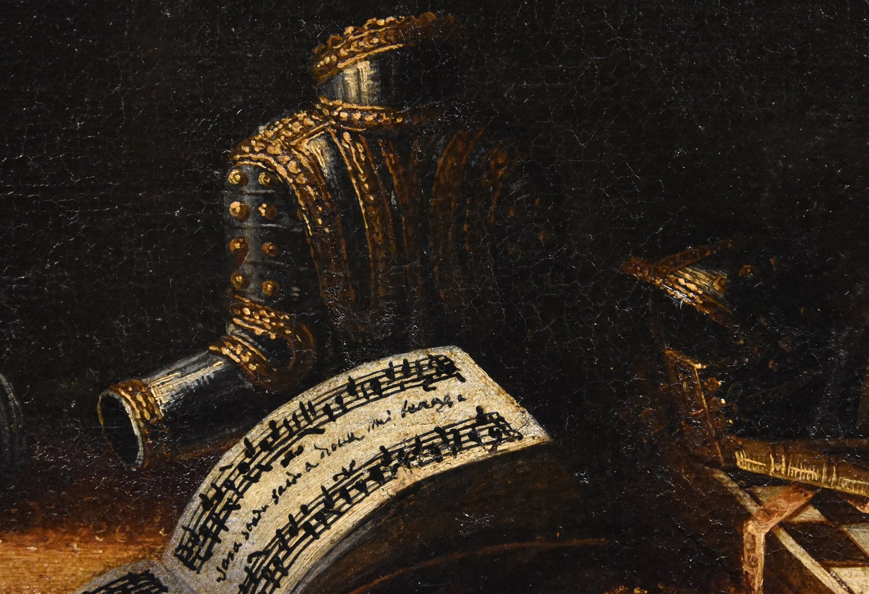 Es ist von entscheidender Bedeutung, die Bedeutung dieser Bilder zu erfassen, die über die Ästhetik der Dekoration hinaus von einer allegorischen Bedeutung durchdrungen sind, so dass sie als raffinierte Vanitas-Gemälde interpretiert werden können. Diese Darstellung lädt zum Nachdenken über die Vergeblichkeit des Eitels (hier symbolisiert durch die Waffen), der Vergnügungen (die Musikinstrumente) und der irdischen Reichtümer (die kostbaren Gegenstände) ein.