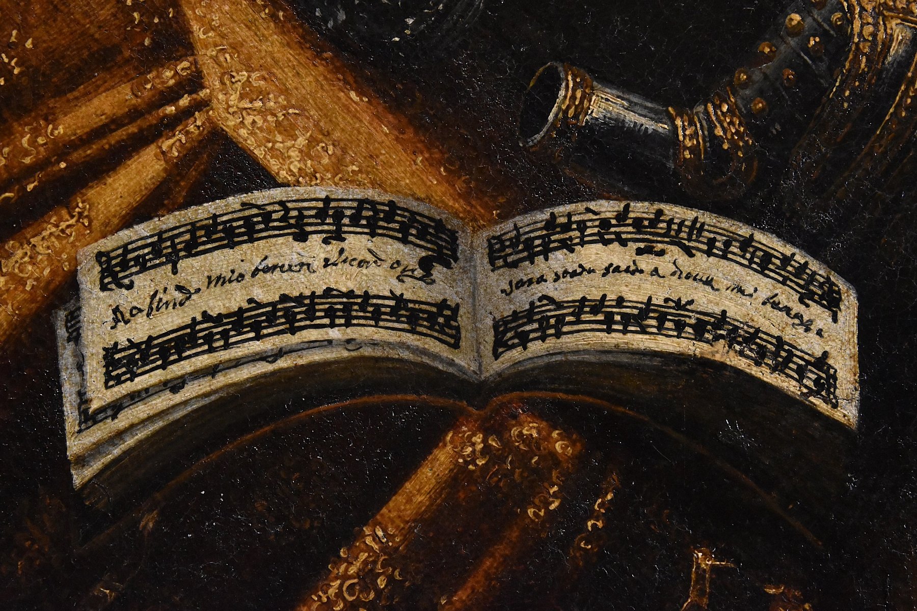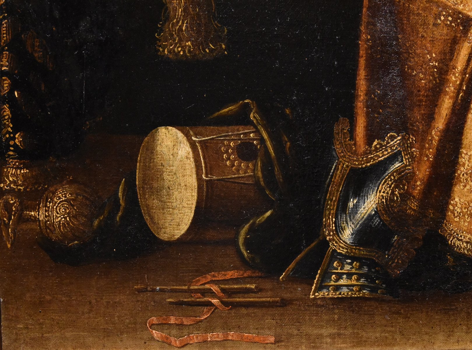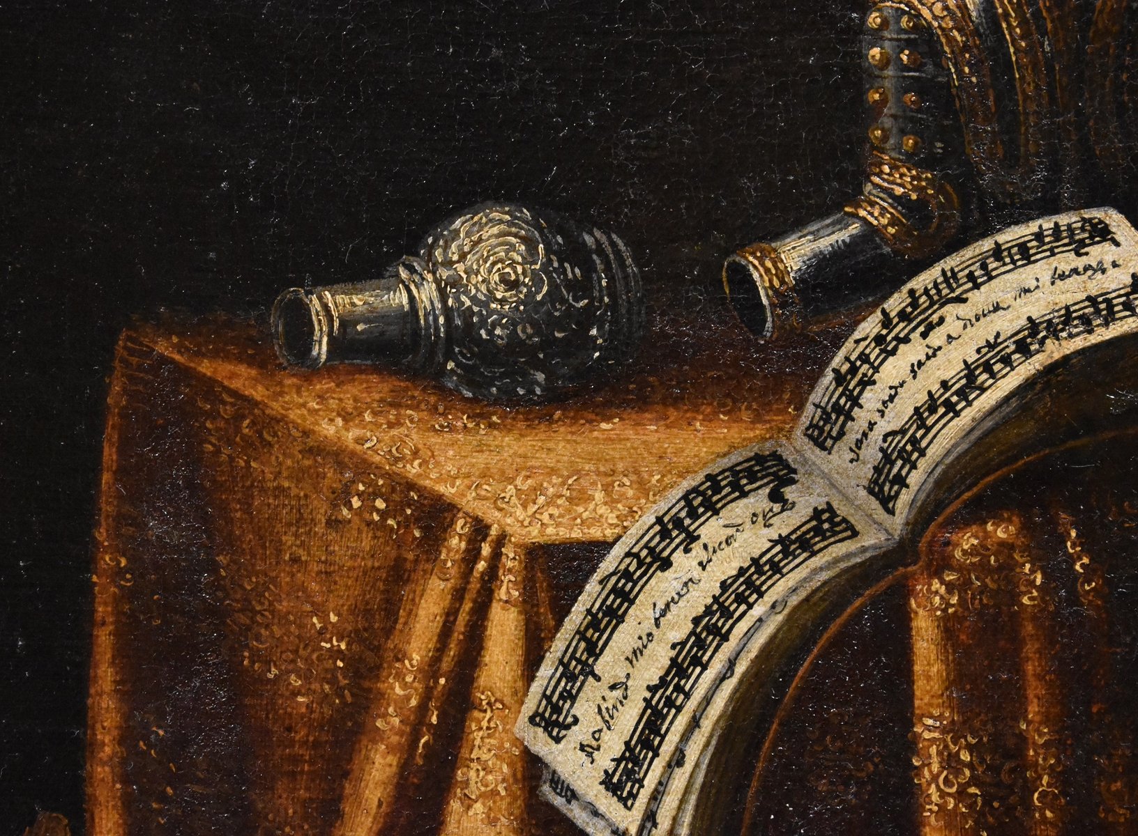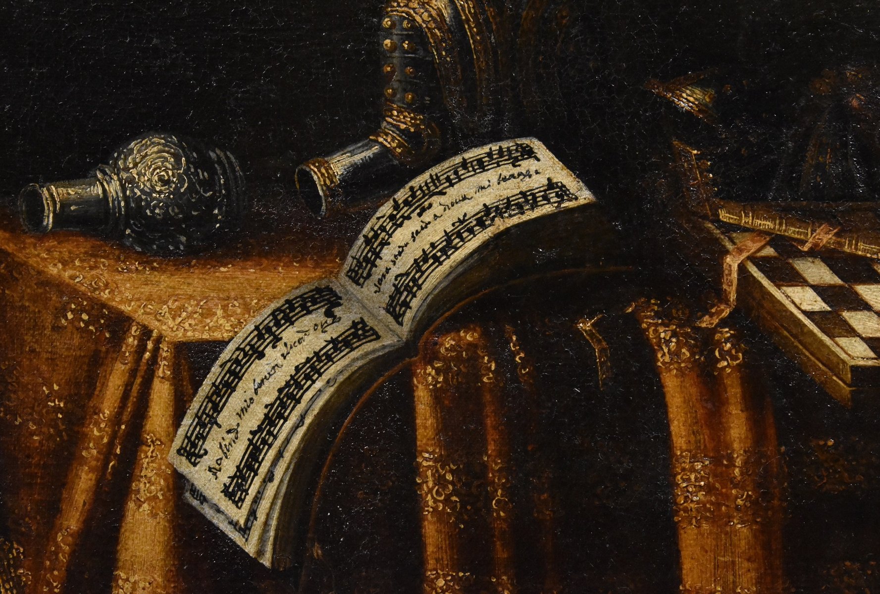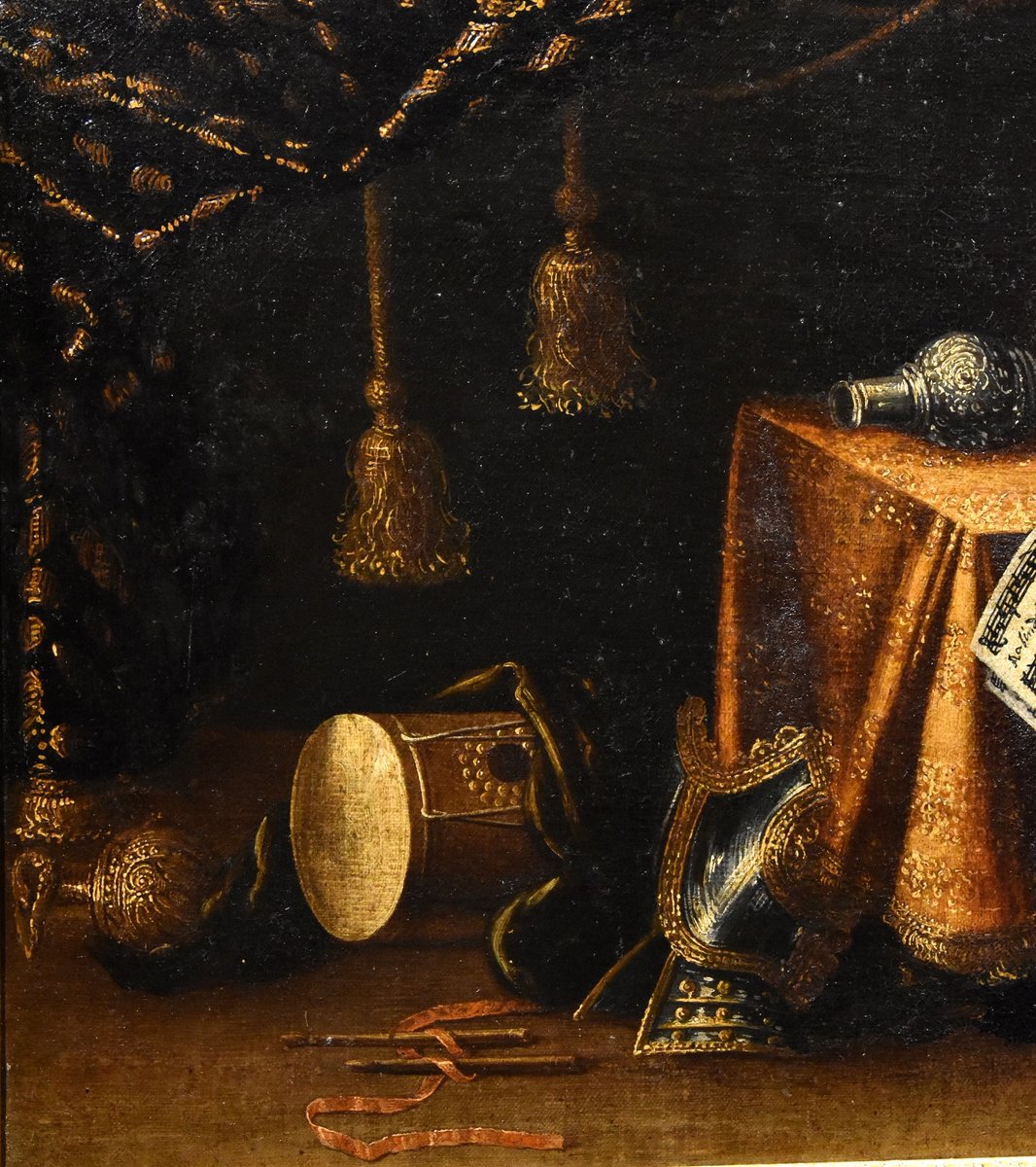 Unter den Gegenständen, die unser Künstler wiedergegeben hat, befinden sich Teile einer zeremoniellen Rüstung mit Goldbesatz, Krüge und Teller aus Edelmetall, Musikinstrumente, darunter ein Tamburin mit seinen Stöcken und ein Saiteninstrument, eine Laute und ein Notenblatt. Die einzigartige Komposition wird durch kostbare, fein ziselierte, geprägte und vergoldete Metallgefäße und ein Schachbrett ergänzt.