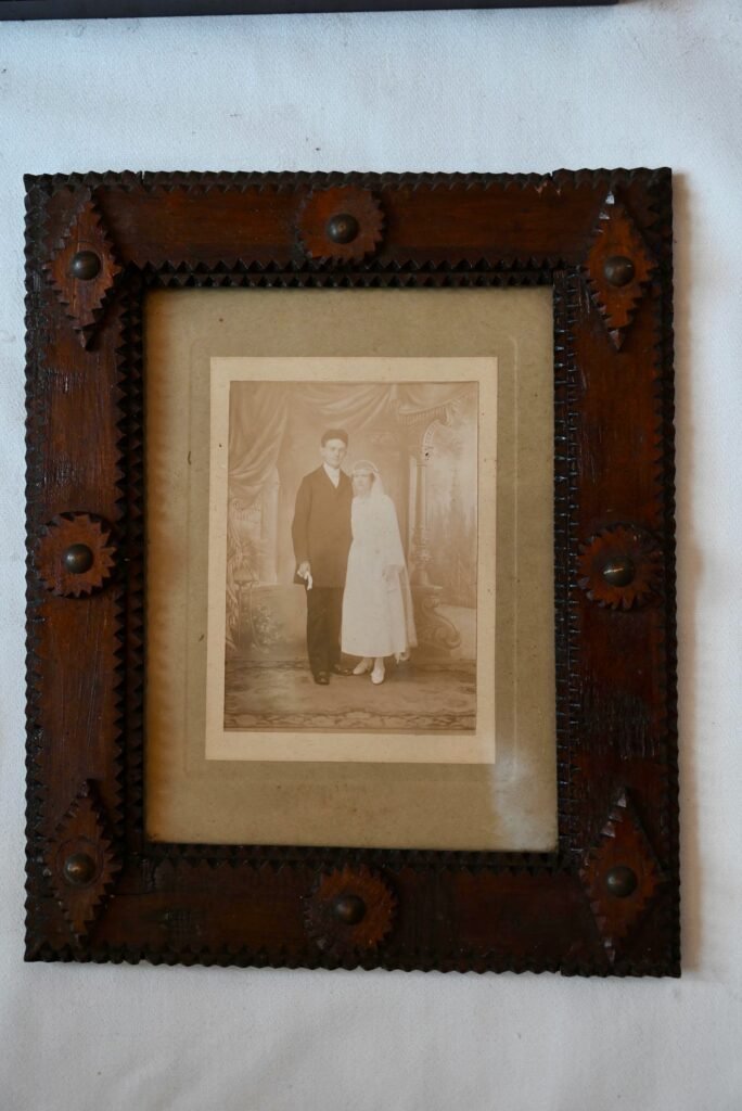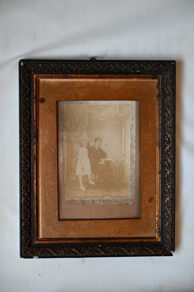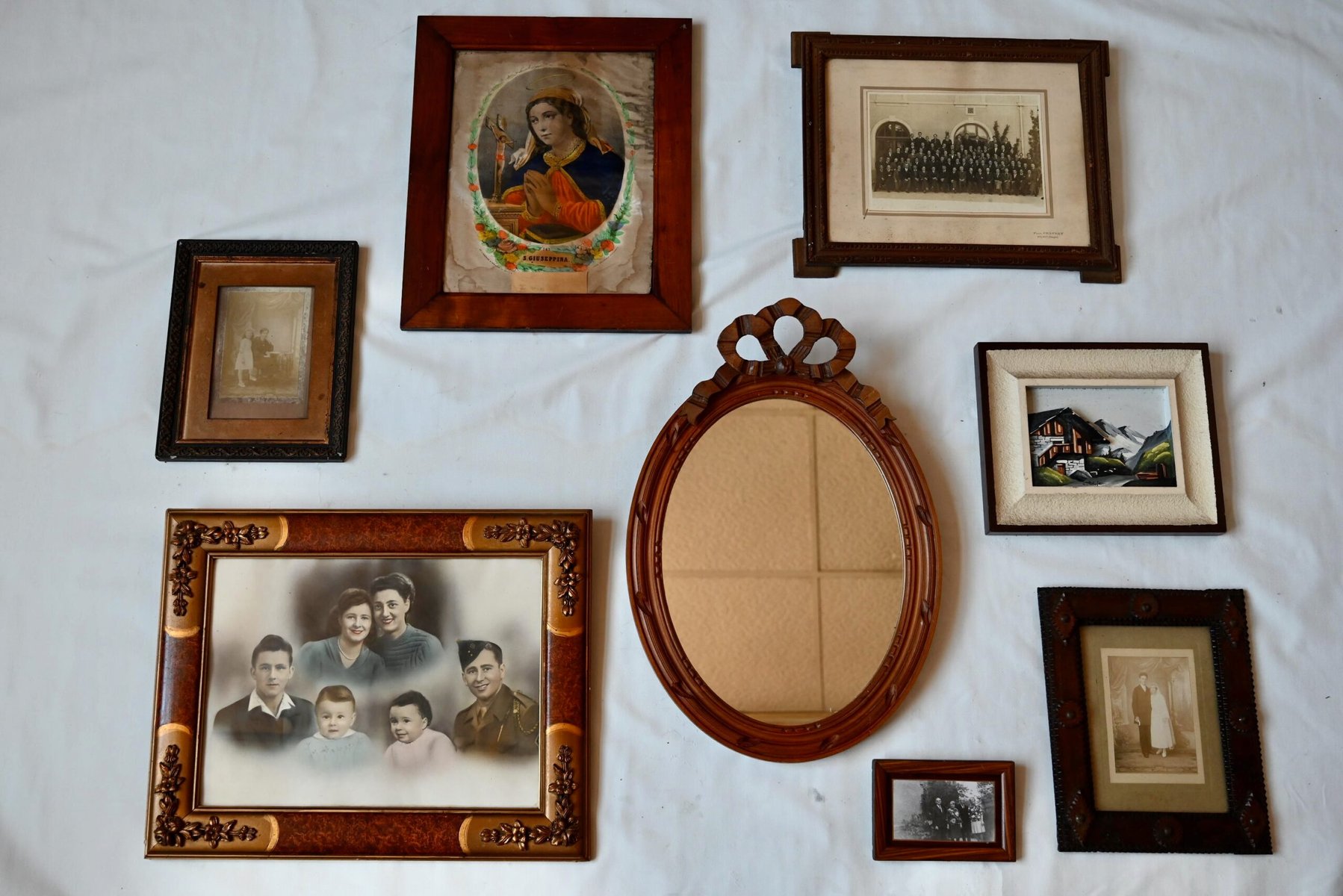 Alte Fotografie, Lithografie, Gravur, kleines Gemälde unter Glas, alte Reproduktion... Jedes Element dieser Komposition hat sein eigenes Medium! Das Durcheinander bringt die Stücke zusammen, manchmal kitschig, manchmal klassisch, oft veraltet und immer berührend. Die Anhäufung erzeugt den dekorativen Effekt, die Vielfalt der Formen, Materialien und Träger bringt Tiefe. Diese Wandkomposition mit authentischem und böhmischem Charme erzählt eine Geschichte, eine, die wir je nach unserer Sensibilität und unserer inneren Poesie anhören wollen...