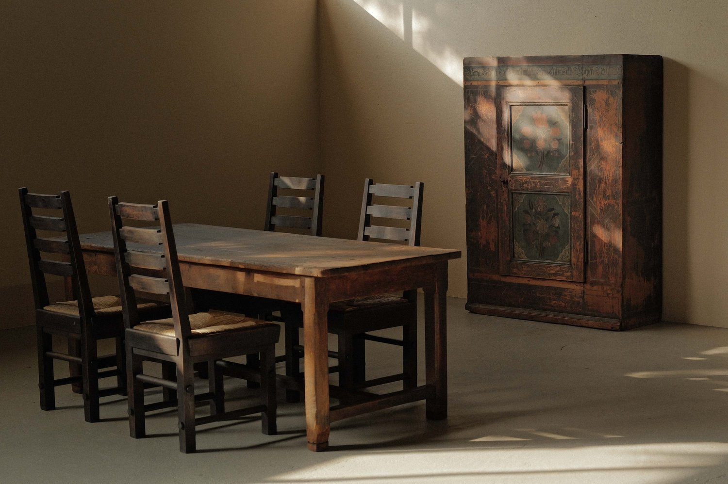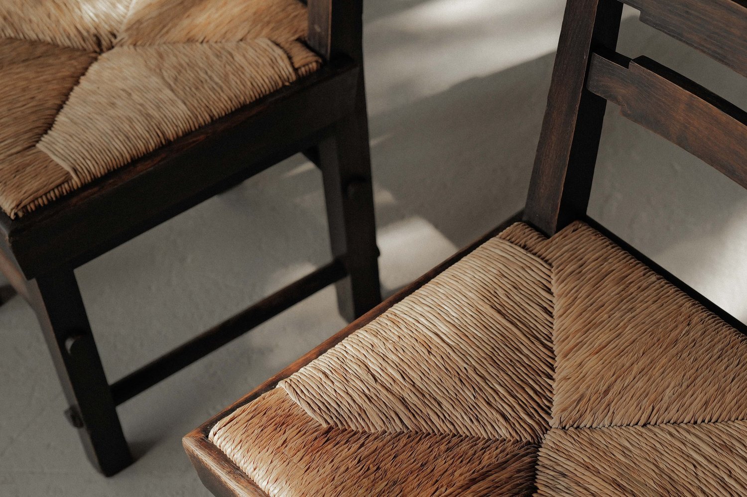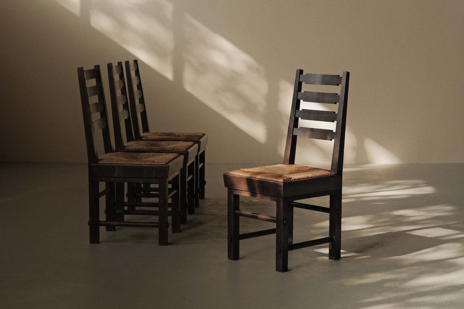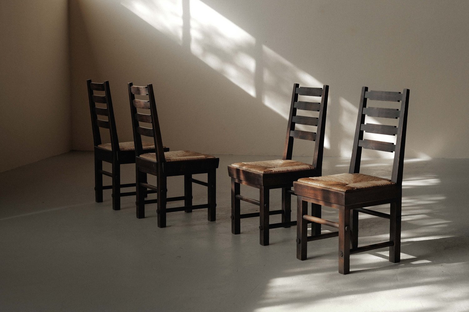 Crafted from solid oak with handwoven rye straw seats, these chairs embody the honest, architectural aesthetic of postwar French design.