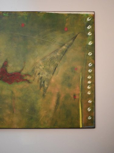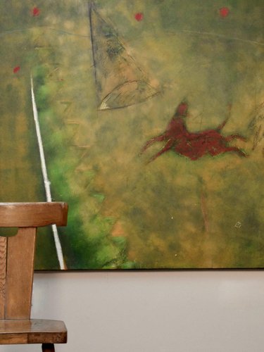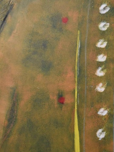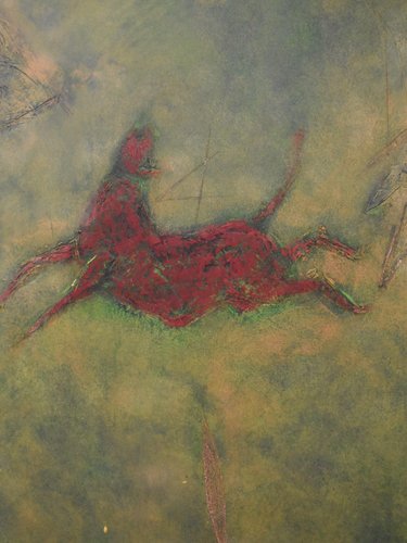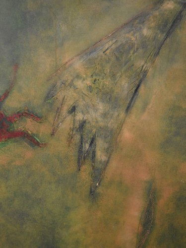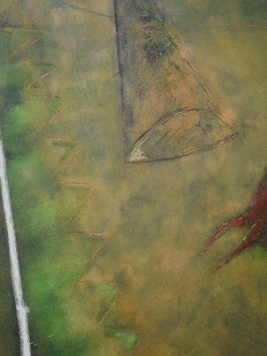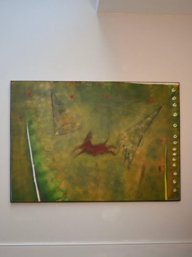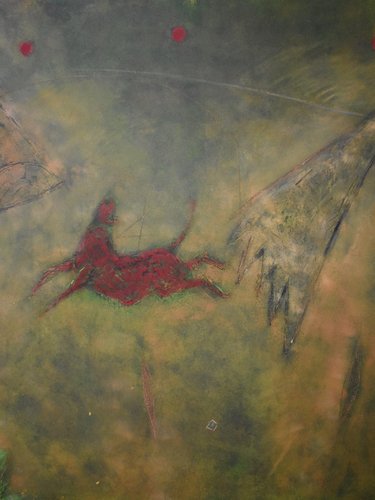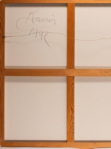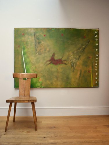 Reminiscent of prehistoric wall paintings, this substantially large work by Gérard Bouvier commands attention with its expressive presence. Across its 114 × 162 cm canvas, the outline of a galloping animal—perhaps a deer—emerges through layers of gestural marks and scored geometric lines. The composition carries a sense of ancient symbolism translated through modern abstraction. Painted in oil on canvas and signed on the reverse, the piece captures both movement and memory with tactile surface energy and rich colour. Framed in stained wood and ready to hang. Artist Gérard Bouvier (born 1942, Caen, France) is a painter and sculptor known for his experimental approach to materials and form. Working in both painting and assemblage, his art often bridges the figurative and the abstract. He began exhibiting in France in the 1960s and has continued to develop a distinctive personal style that draws on primitive and organic imagery. While his work is not widely represented in public collections, Bouvier’s paintings and sculptures appear periodically in European art auctions, admired for their tactile energy and imaginative construction. Key details Medium: Oil on canvas Dimensions (unframed): 114 × 162 cm Dimensions (framed): 115 × 163 cm Signed: Signed on the reverse and dated 1992 Condition: Excellent Frame: Stained wooden frame, ready to hang