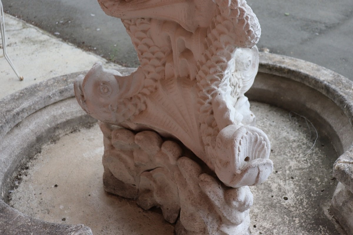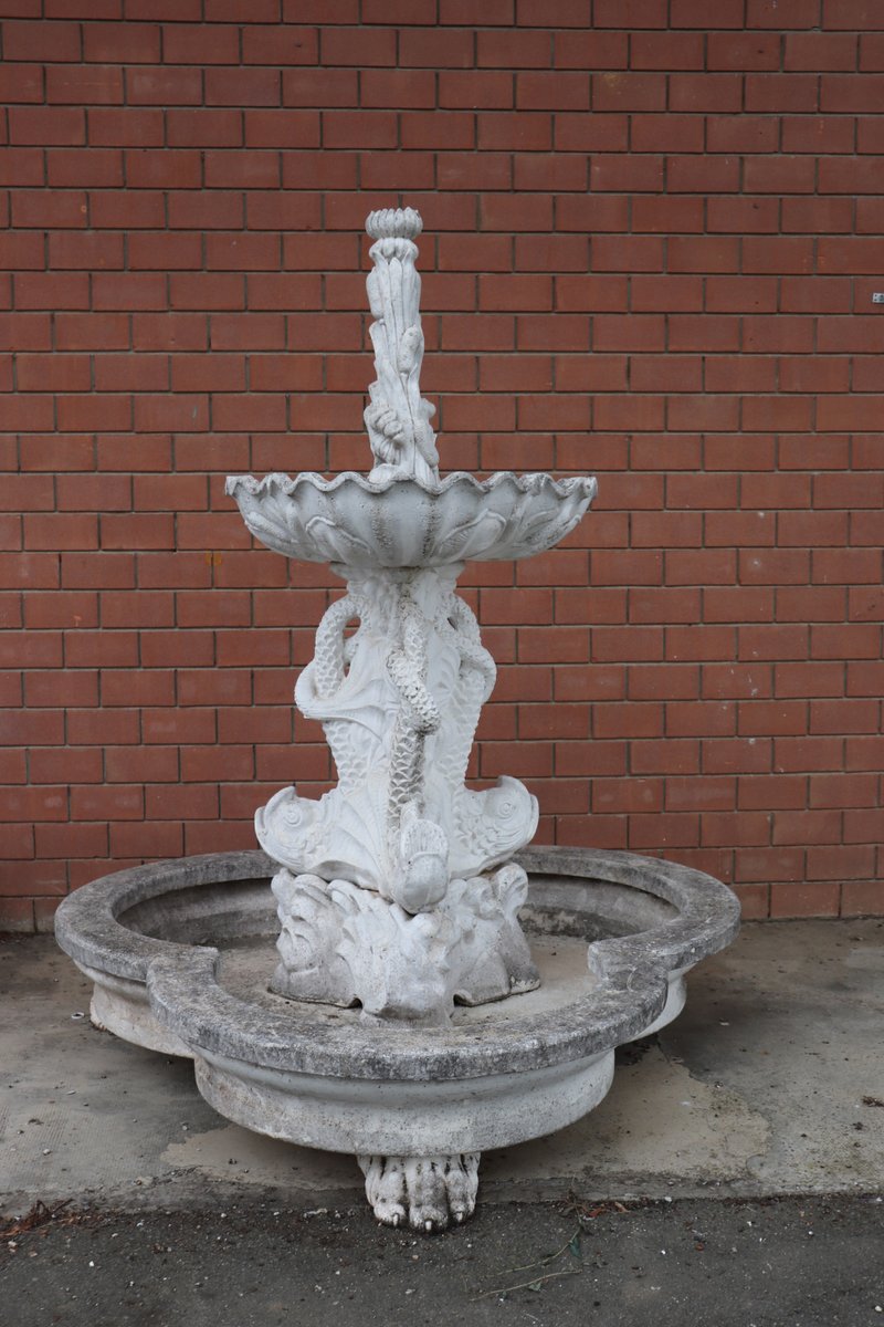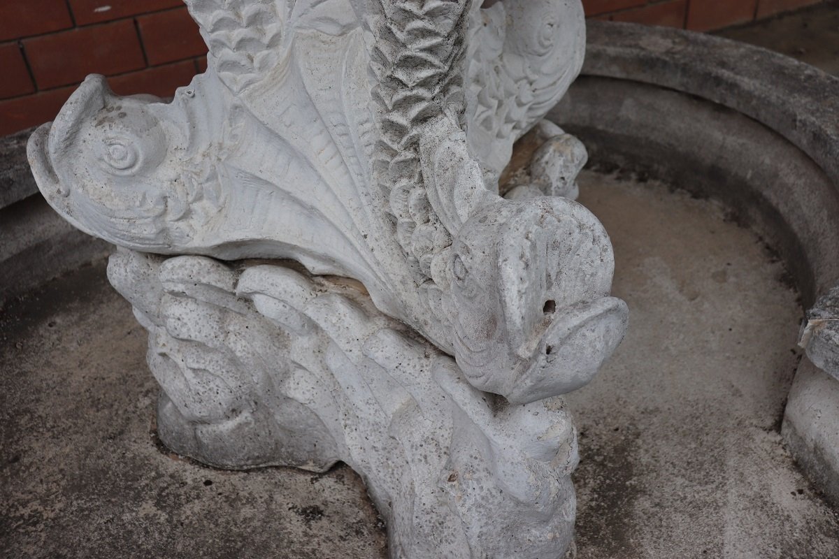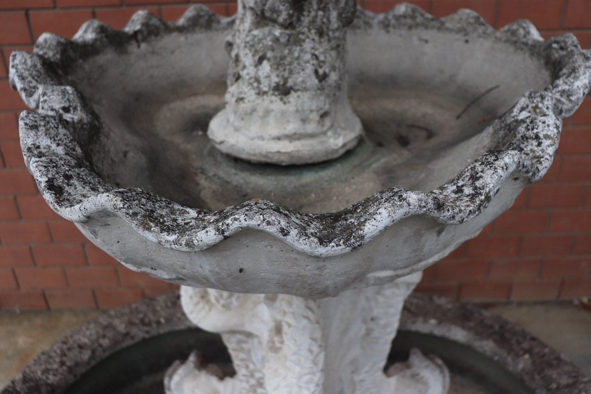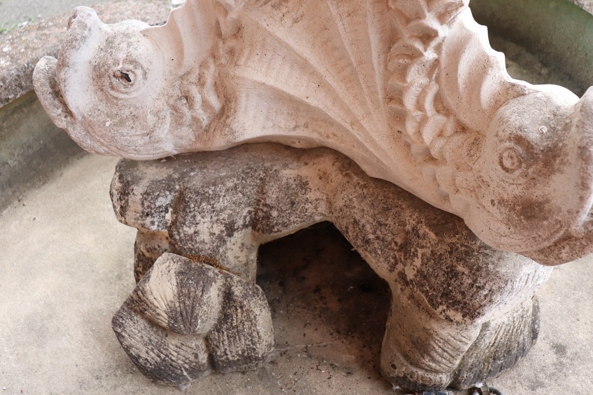 Die beiden Springbrunnen sind in einem ausgezeichneten Zustand, da sie natürliche Altersspuren aufweisen und im Freien benutzt wurden. Wie Sie auf den Fotos auf der Rückseite des großen Beckens sehen können, befindet sich hinter den Fischen ein verstecktes Fach für den Motor, der für den Betrieb des Wassers benötigt wird.