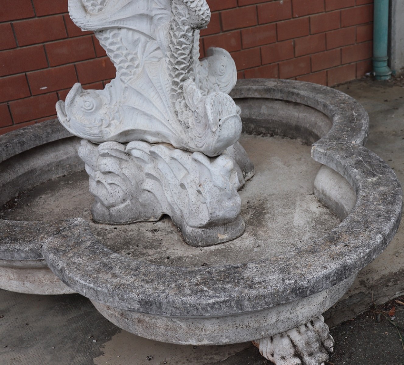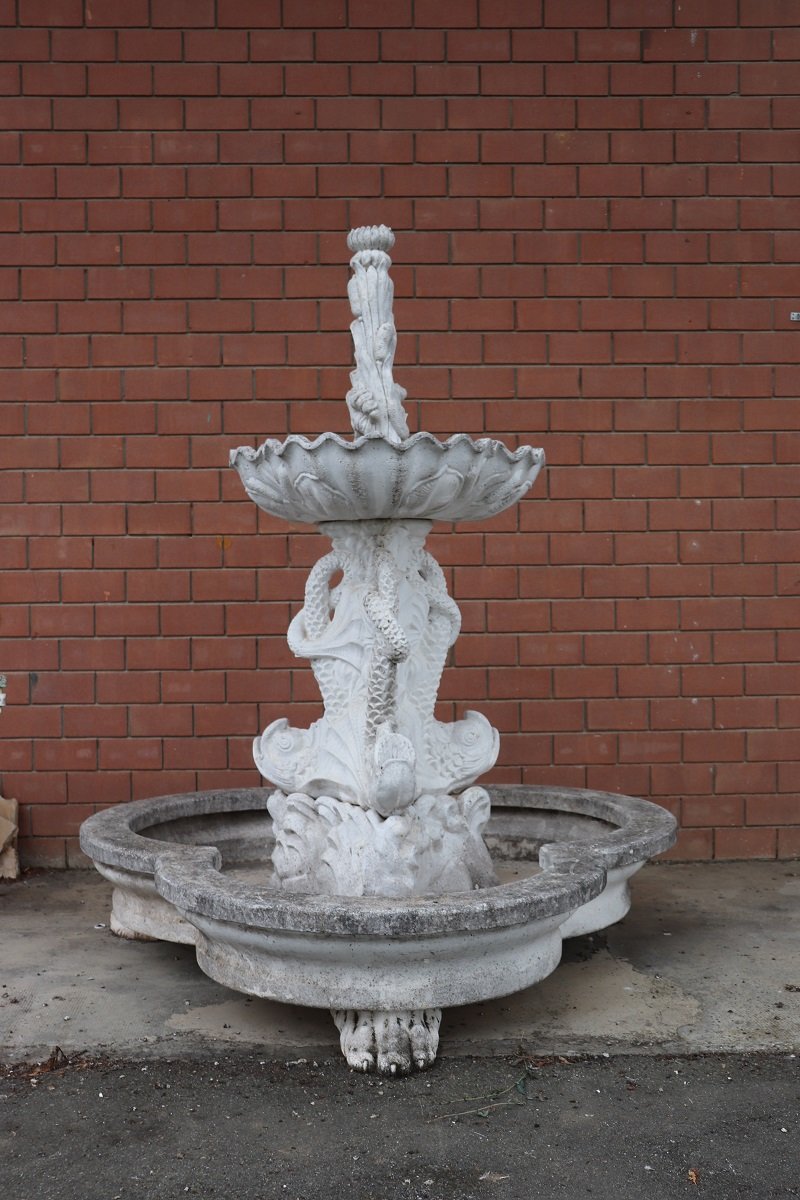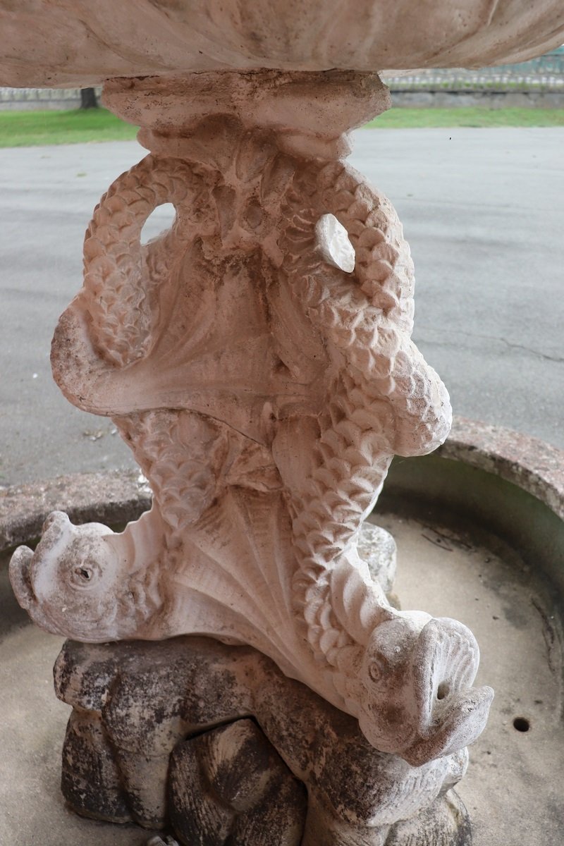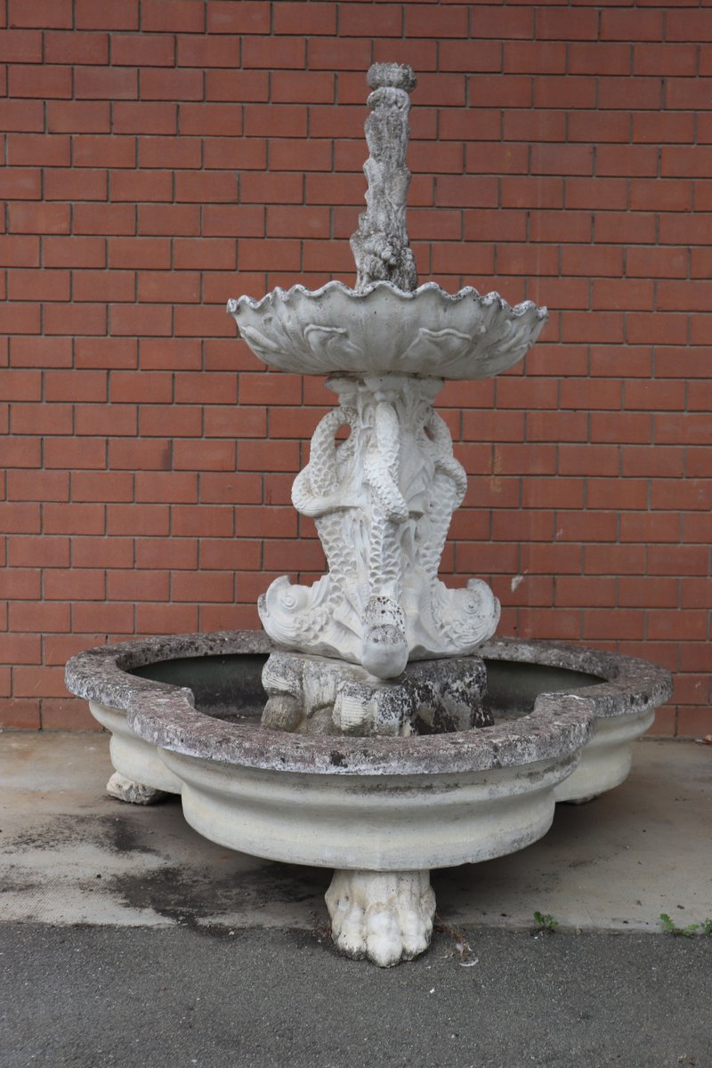 Die beiden Springbrunnen sind in einem ausgezeichneten Zustand, da sie natürliche Altersspuren aufweisen und im Freien benutzt wurden. Wie Sie auf den Fotos auf der Rückseite des großen Beckens sehen können, befindet sich hinter den Fischen ein verstecktes Fach für den Motor, der für den Betrieb des Wassers benötigt wird.