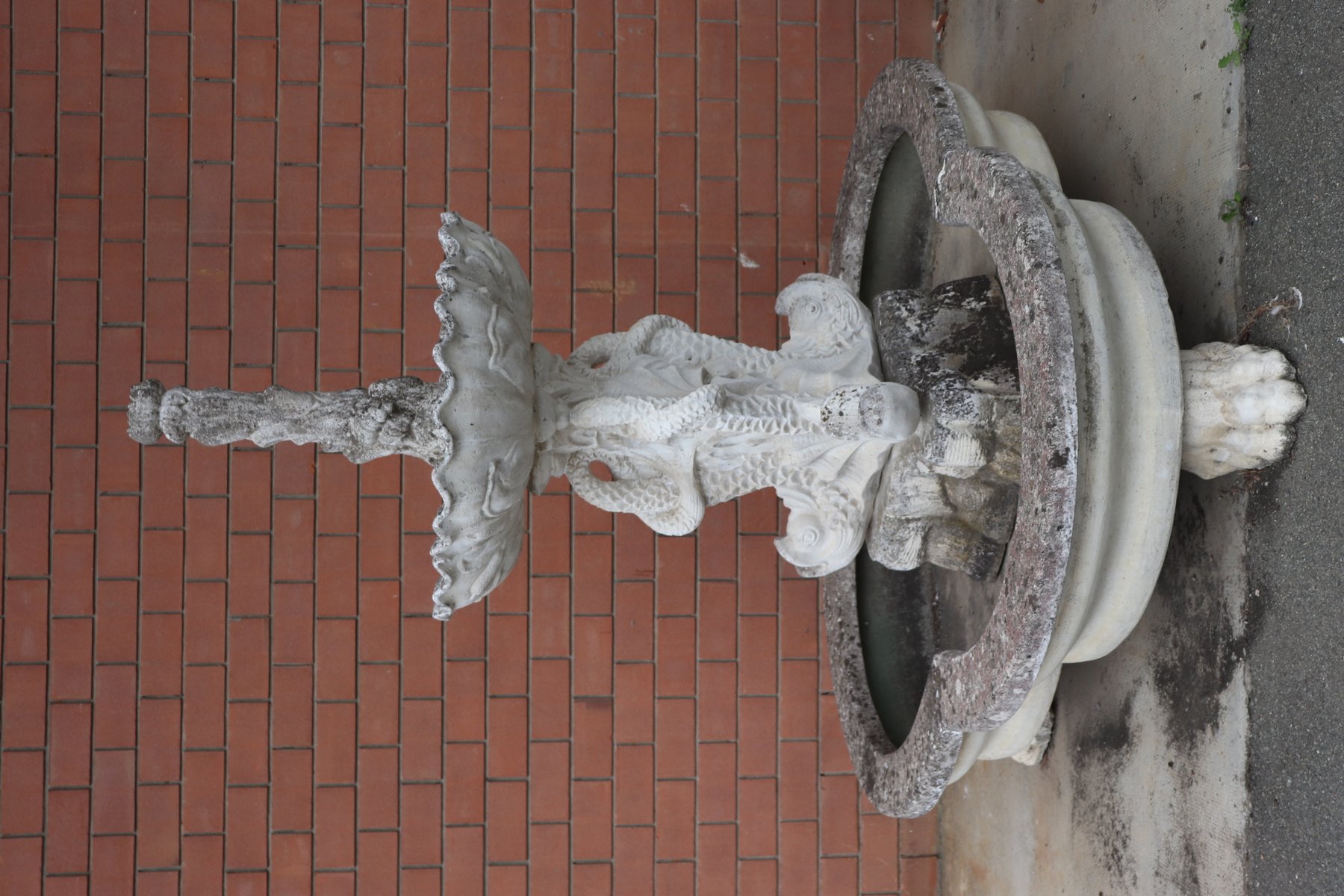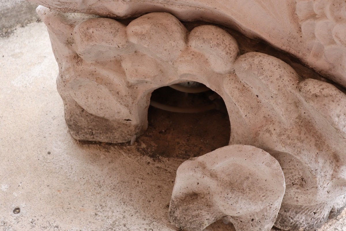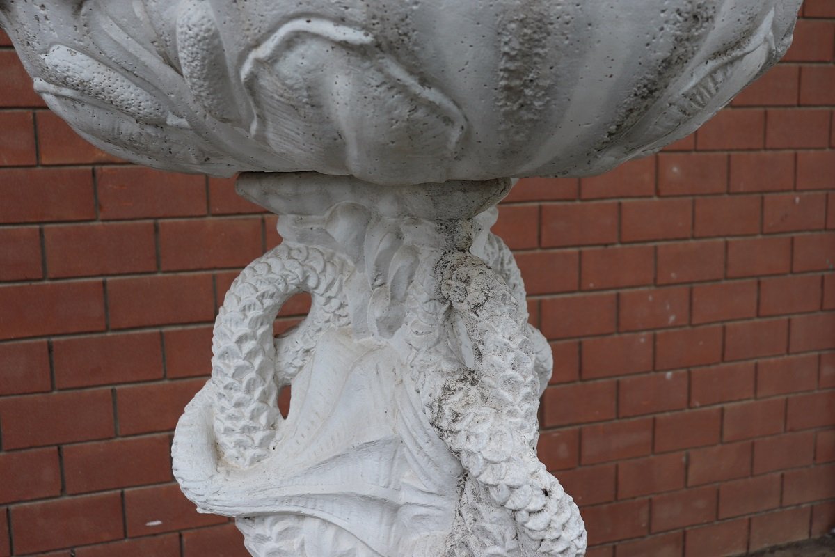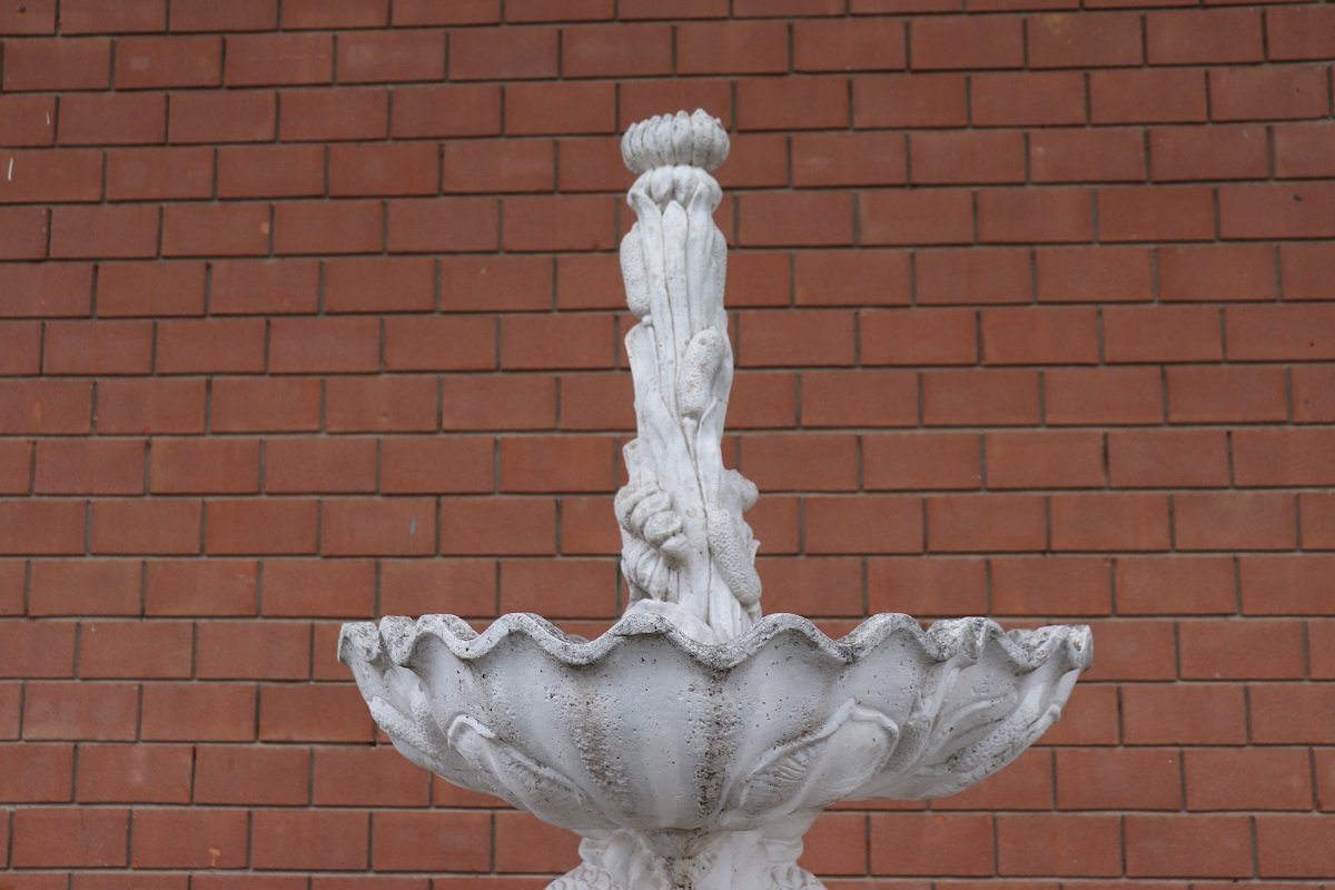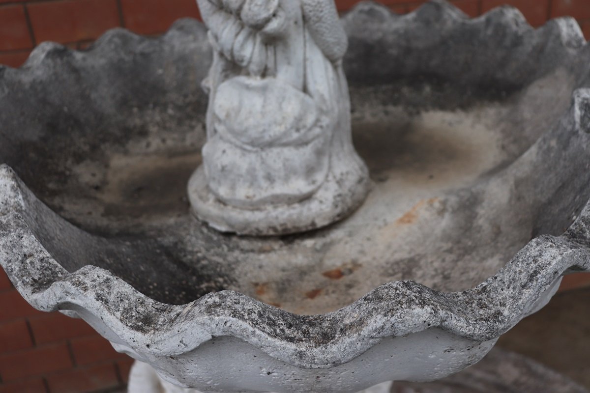 Die beiden Springbrunnen sind in einem ausgezeichneten Zustand, da sie natürliche Altersspuren aufweisen und im Freien benutzt wurden. Wie Sie auf den Fotos auf der Rückseite des großen Beckens sehen können, befindet sich hinter den Fischen ein verstecktes Fach für den Motor, der für den Betrieb des Wassers benötigt wird.