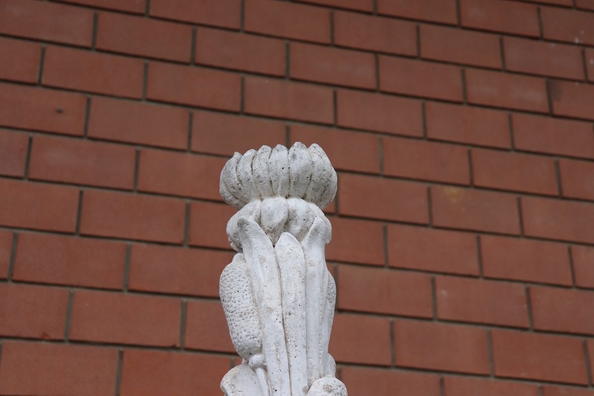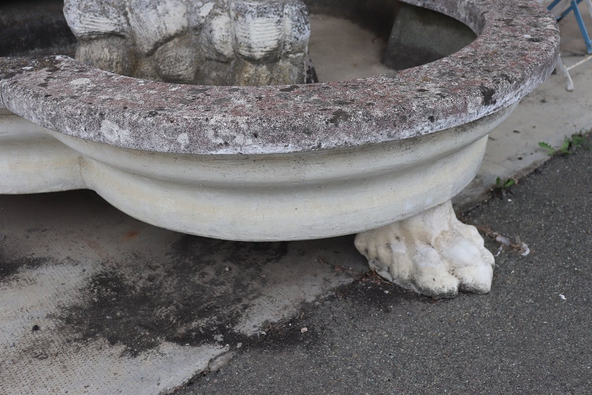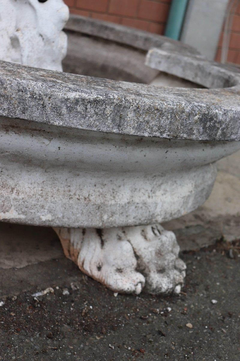 Dieses majestätische italienische Brunnenpaar wurde in den ersten Jahrzehnten des 20. Jahrhunderts aus gemischten Materialien geschaffen: Beton, Kies (kleine Steine) und Marmorstaub. Sie weisen eine reiche, vom neoklassischen Stil inspirierte Dekoration auf.