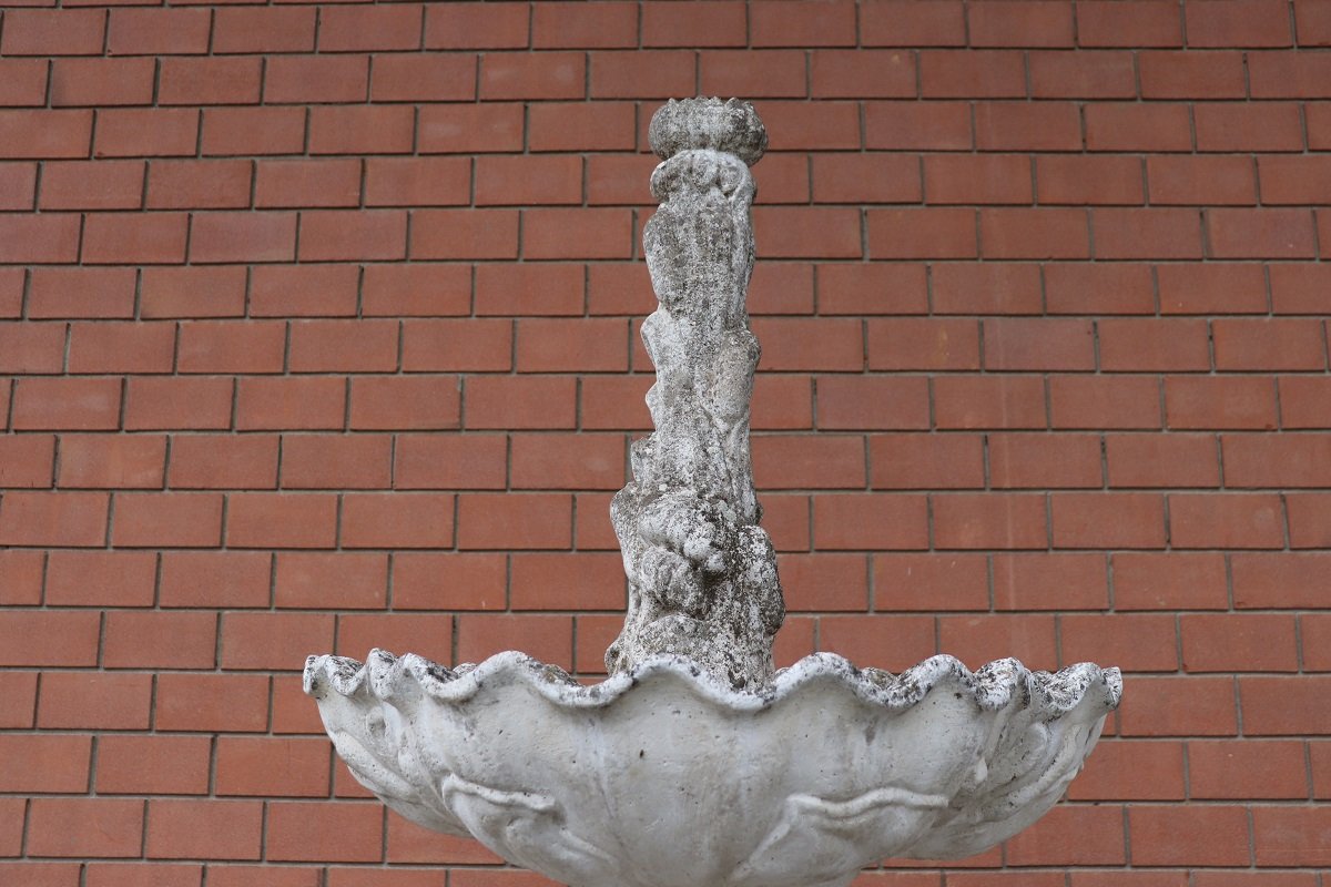This pair of majestic Italian fountains was created in the early decades of the 20th century using mixed materials: concrete, gravel (small stones), and marble dust. They feature rich decoration inspired by a neoclassical style.
