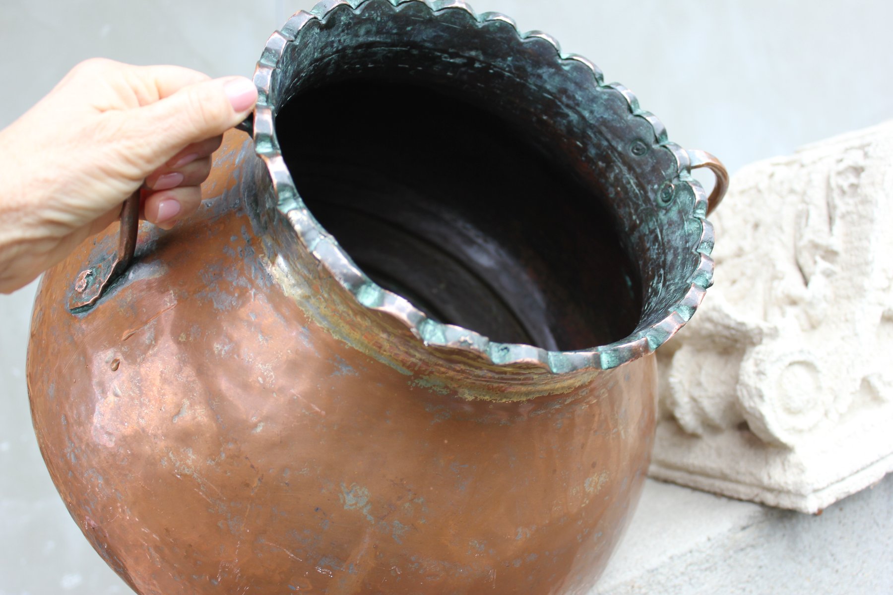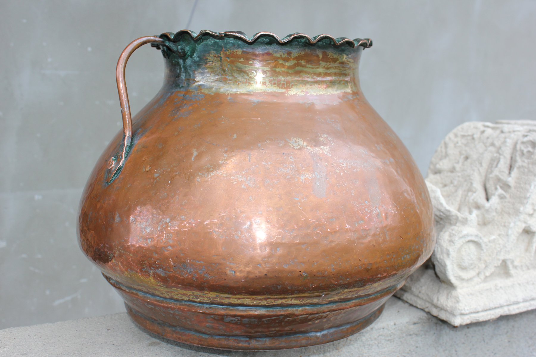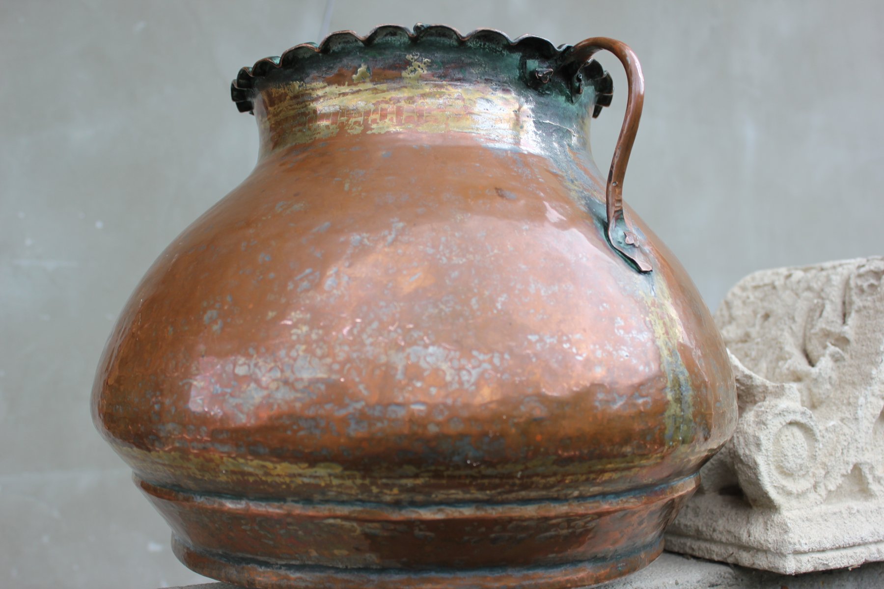 Die Oberfläche weist eine natürlich gealterte Patina mit tiefen Oxidationstönen auf, die von warmem Kupfer bis zu grünlichem Grünspan reichen und an jahrhundertelangen Gebrauch und anmutigen Verfall erinnern.