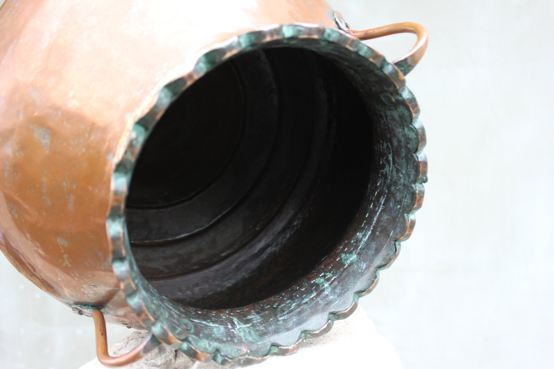 Das vollständig von Hand aus einem einzigen Kupferblech gehämmerte Stück weist einen breiten, abgerundeten Körper, einen gewellten Rand und geschmiedete Seitengriffe auf - alles mit bemerkenswertem Geschick und taktiler Präsenz ausgeführt.