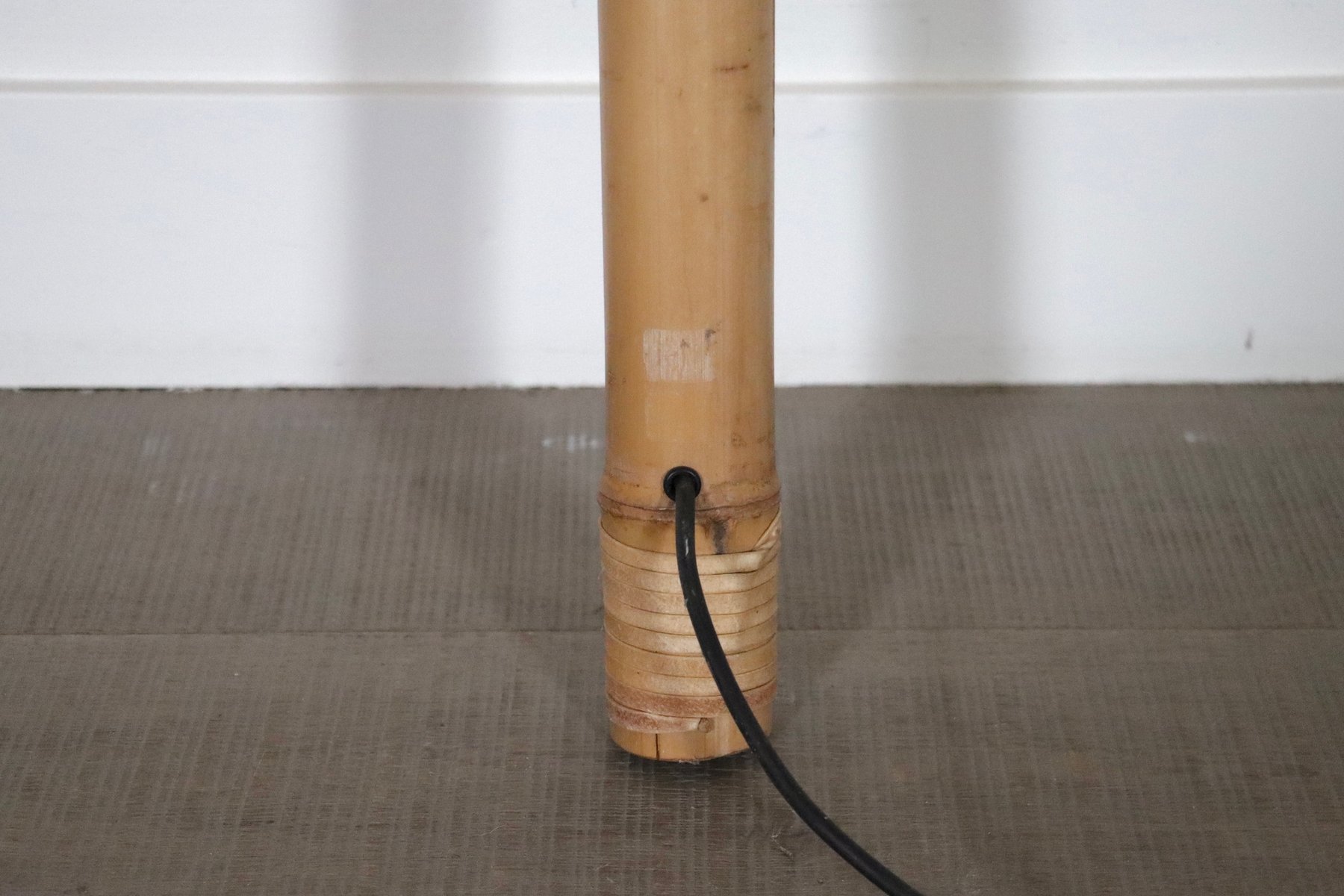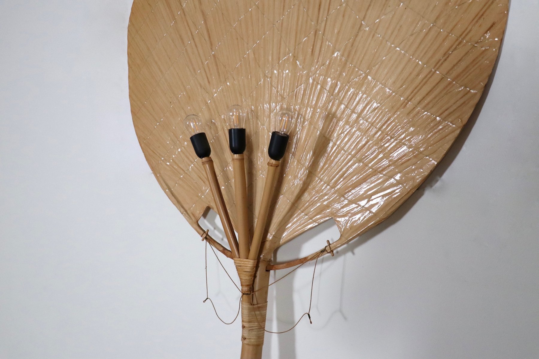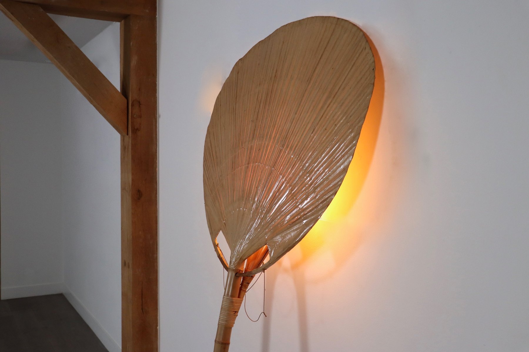 Ein atemberaubendes Design, das aus Bambus, Reispapier und Metall handgefertigt ist. Die wunderschöne große Stehleuchte aus der kultigen Uchiwa-Serie ist ein echtes Sammlerstück und ein Highlight in jedem Interieur. Das Reispapier ist aufgrund seiner Größe mit verdeckten Metalldrähten anmutig verstärkt. Die Leuchte lehnt an der Wand und kann mit zwei Seilen an der Wand befestigt werden, um die Stabilität zu erhöhen. Auf der Rückseite befinden sich drei Lichtsteckdosen, die den Reispapierfächer beleuchten. Einmal eingeschaltet, erzeugt der Schirm eine bezaubernde Silhouette, wenn er beleuchtet wird. Das Licht dringt anmutig durch das Reispapier und wirft einen sanften, diffusen Glanz, während die Bambuselemente faszinierende Schatten werfen und so ein faszinierendes Lichterlebnis schaffen. Ob ein- oder ausgeschaltet, diese Leuchte wertet jeden Raum durch ihr auffälliges Erscheinungsbild auf.
