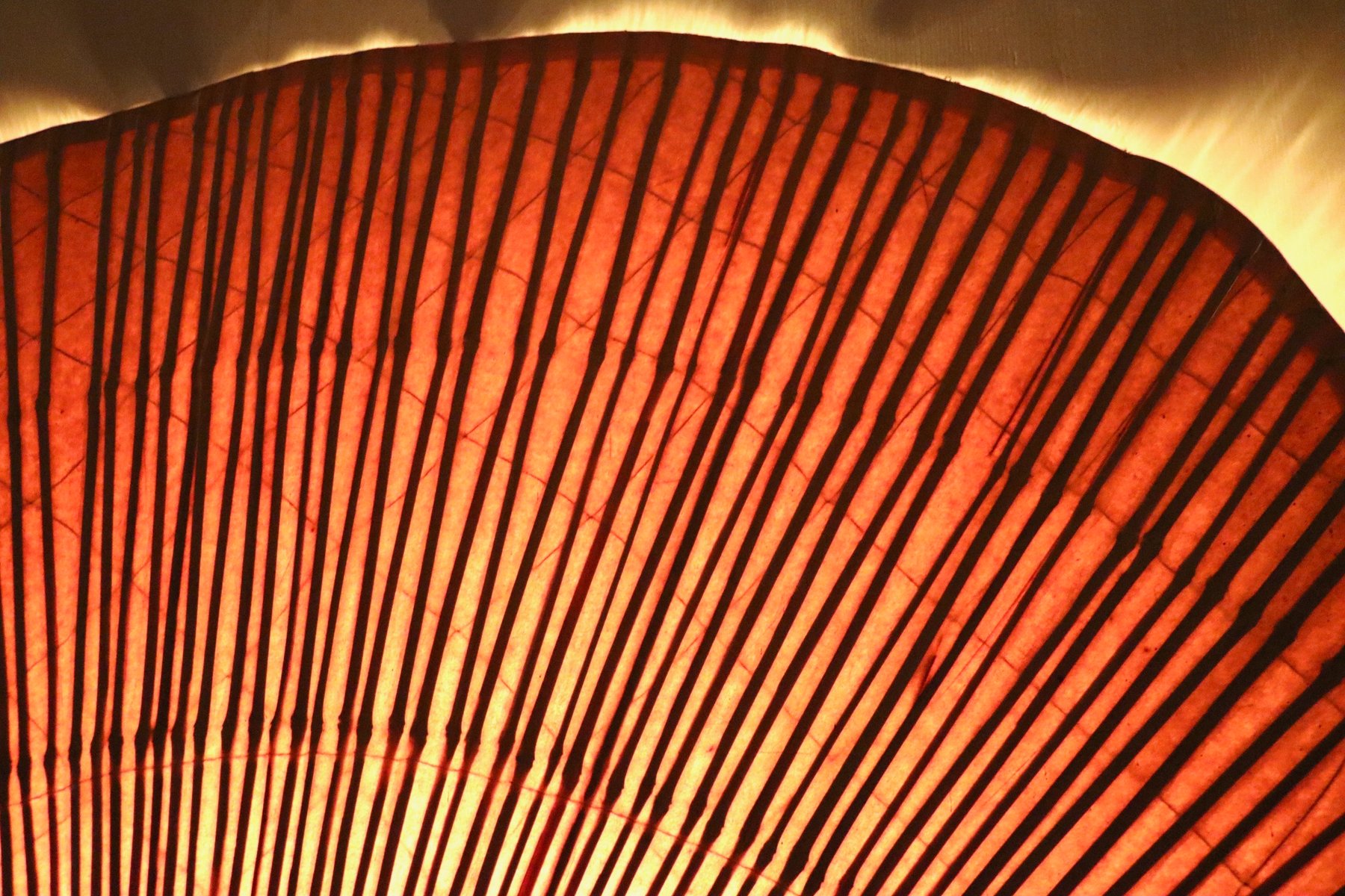 Aufgrund der Verwendung dieser empfindlichen Materialien sind viele dieser Lichtskulpturen im Laufe der Jahre beschädigt worden oder verloren gegangen. Daher sind die verbliebenen zu einem einzigartigen Fund geworden. Diese Lampe ist in einem sehr guten Zustand mit nur einem kleinen Riss an der Unterseite des Fächers, der kaum sichtbar und im eingeschalteten Zustand unsichtbar ist.