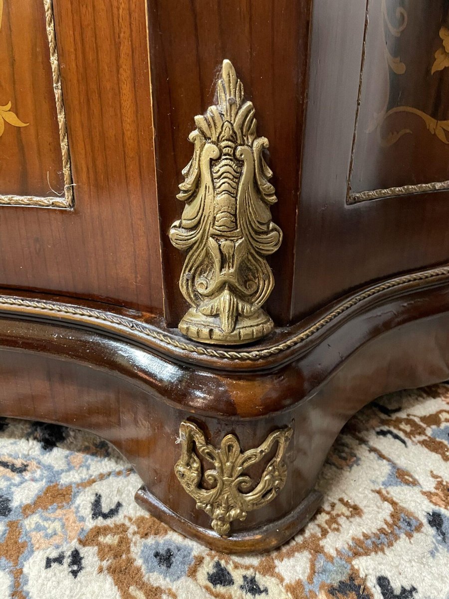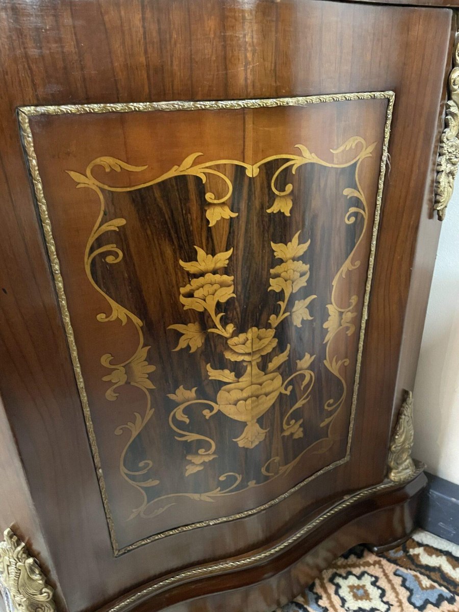 A stunning French buffet or sideboard featuring exquisite marquetry inlay and a beautifully veined, green marble top. This elegant piece showcases fine craftsmanship, with rich detailing, refined proportions, and classic French styling. Perfect as a statement piece in a dining room, hallway, or living space. In excellent condition throughout. Dimensions: 180 cm wide x 57 cm deep x 97 cm high. Nationwide delivery available.