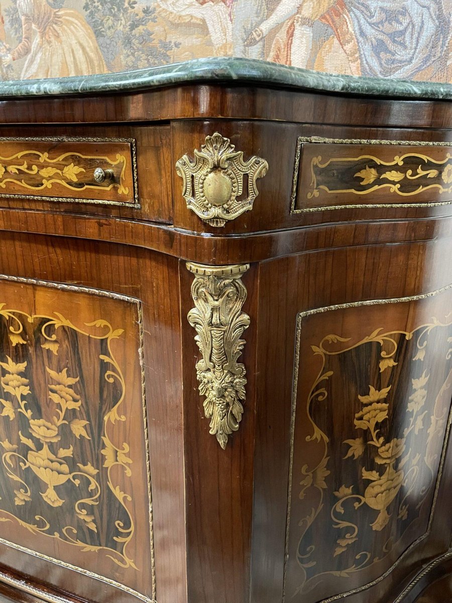 Ein atemberaubendes französisches Buffet oder Sideboard mit exquisiter Intarsienarbeit und einer wunderschön geäderten, grünen Marmorplatte. Dieses elegante Stück zeigt feine Handwerkskunst, mit reichen Details, raffinierten Proportionen und klassischem französischen Stil. Perfekt als Blickfang in einem Esszimmer, Flur oder Wohnraum. Insgesamt in ausgezeichnetem Zustand. Abmessungen: 180 cm breit x 57 cm tief x 97 cm hoch. Bundesweite Lieferung möglich.