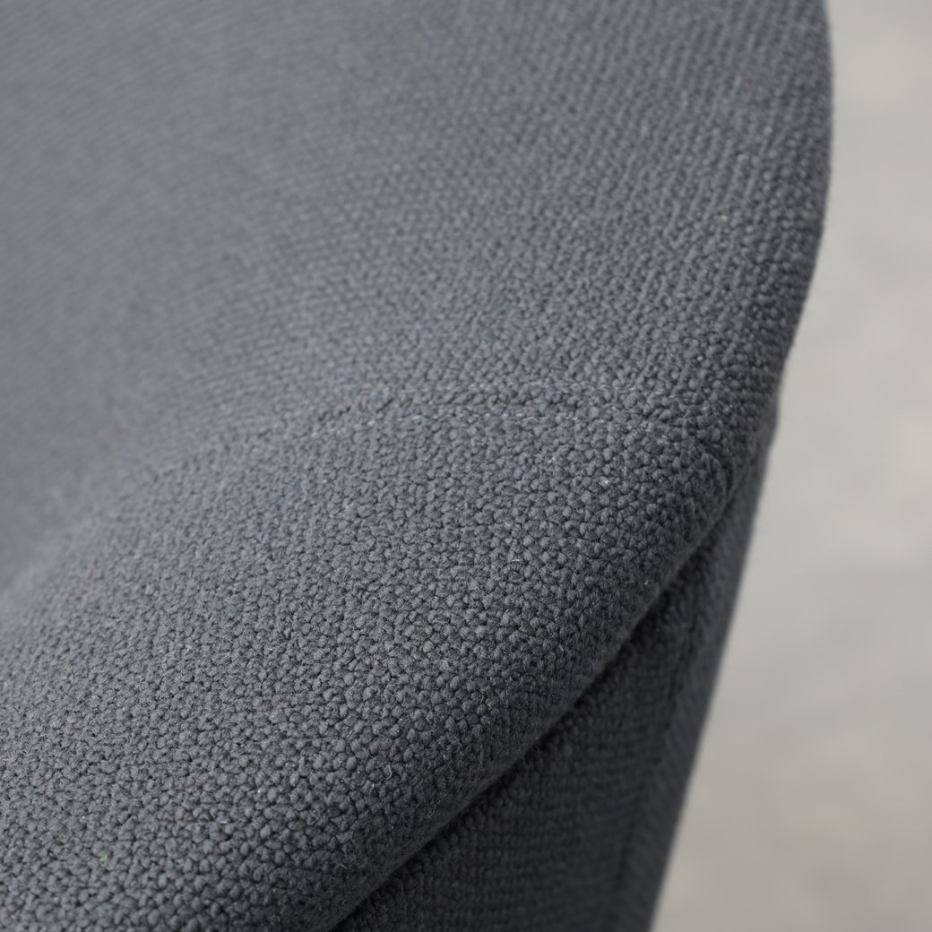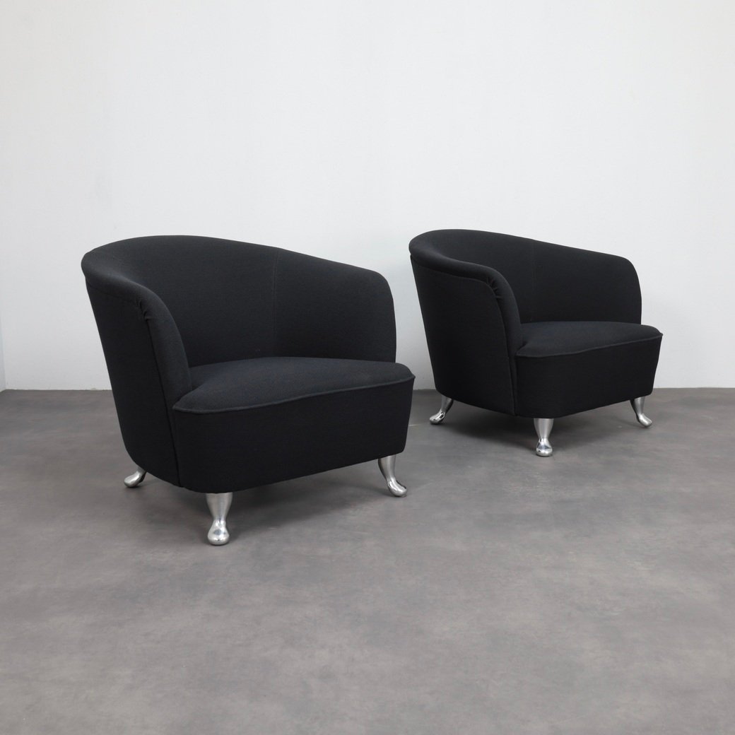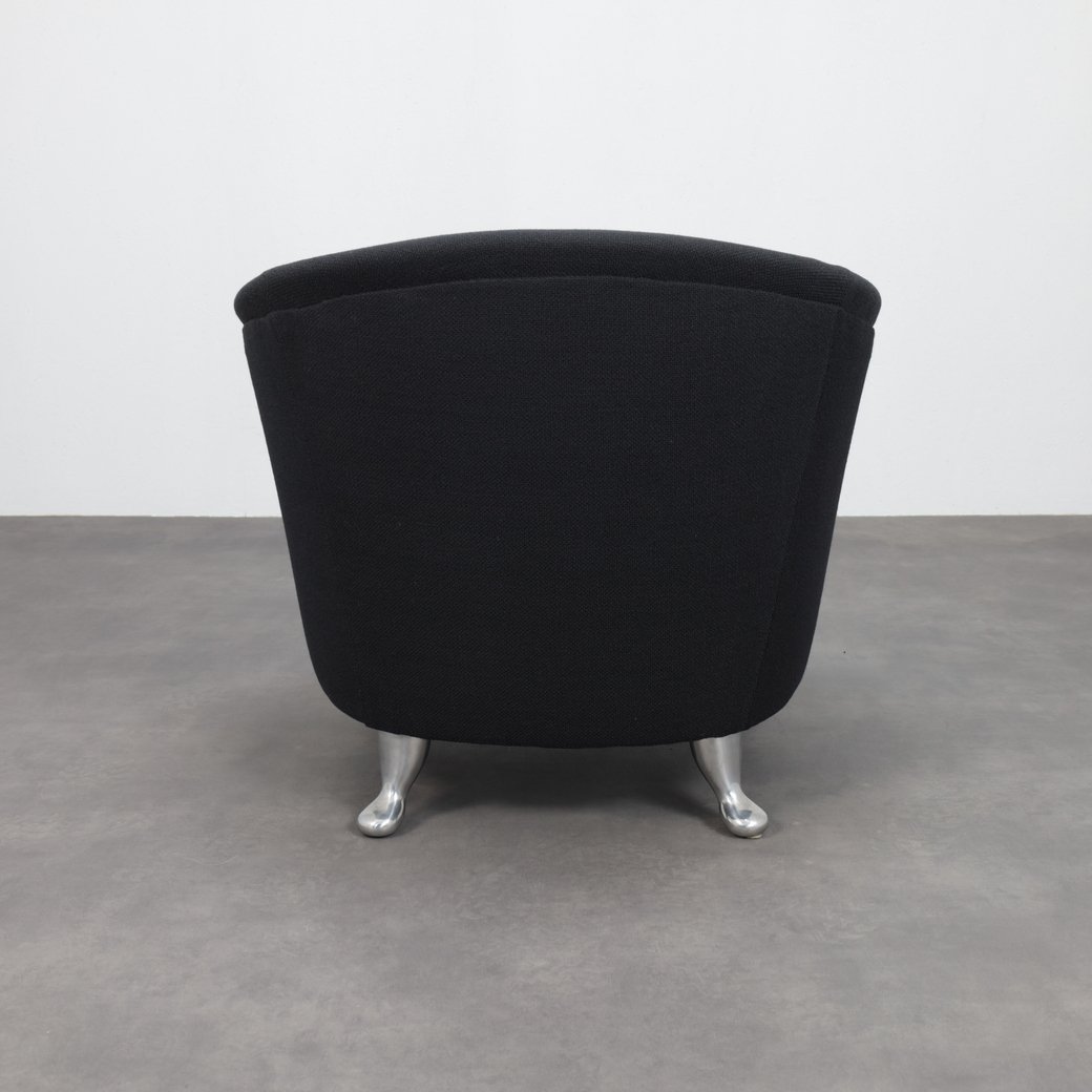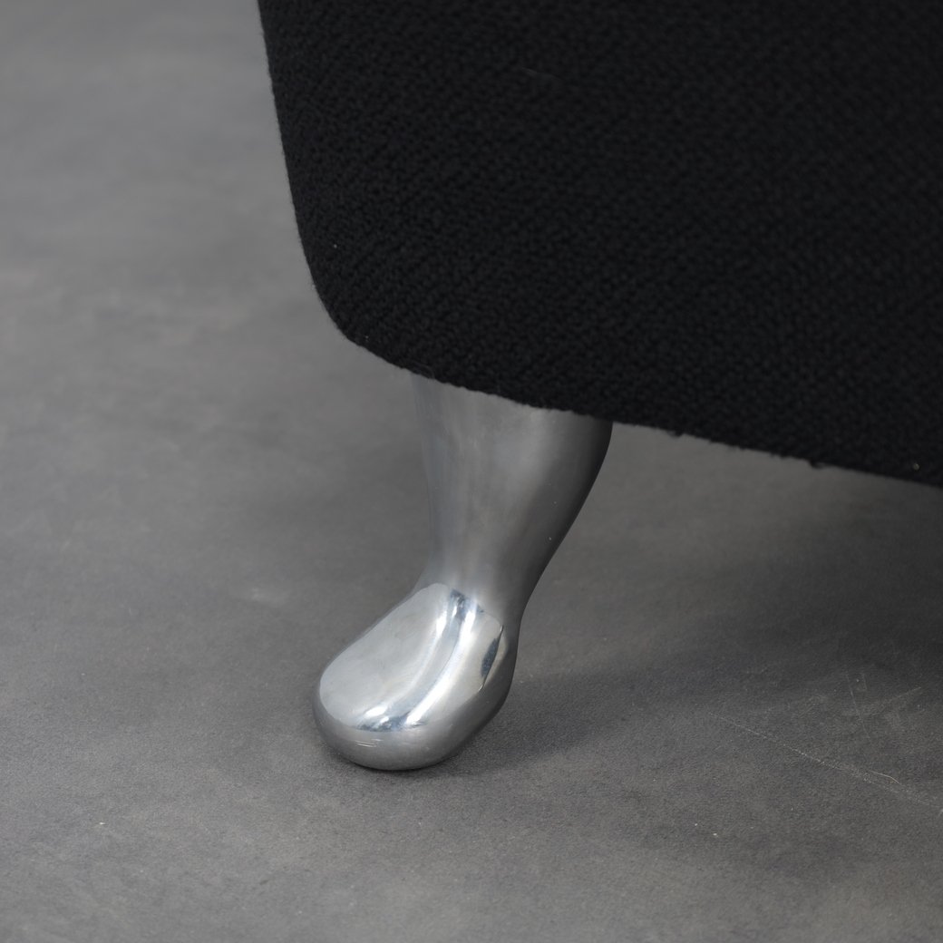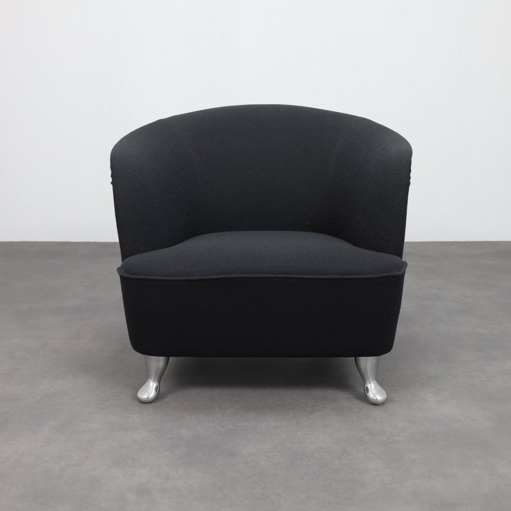 The Classico model is defined by its gently curved, enveloping form, offering both visual calm and exceptional comfort. The chairs have been recently reupholstered in high-quality black wool, enhancing their sculptural presence while preserving the purity of the original design. The subtle texture of the wool contrasts beautifully with the smooth, flowing lines of the silhouette. Distinctive metal feet, produced by Custos, add a refined architectural accent and lend the chairs a light, poised stance.