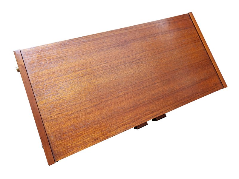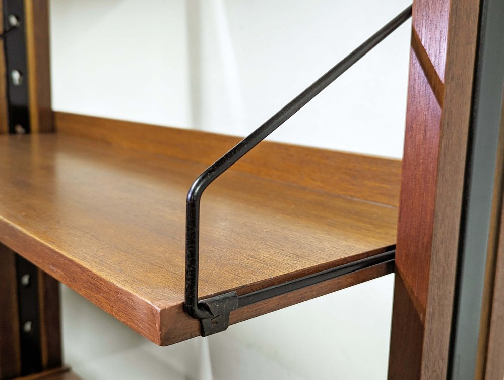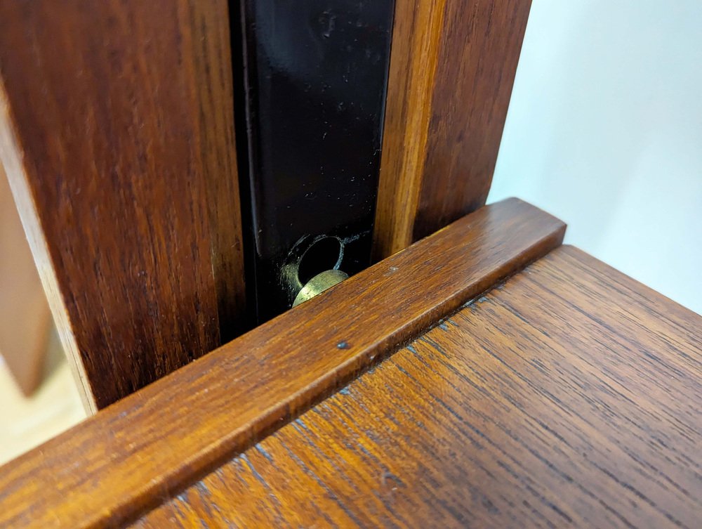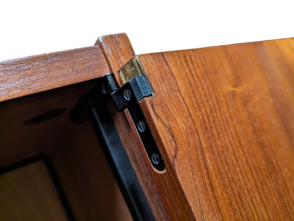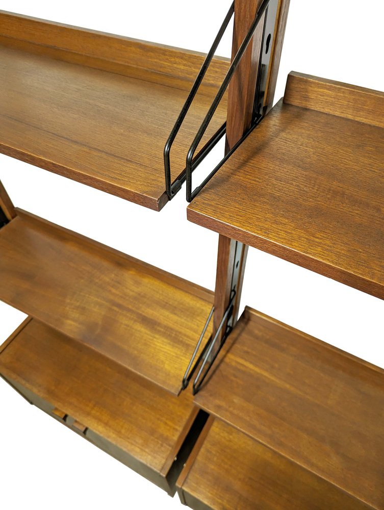 The bookshelf remains in overall pretty good conditions: however, the uprights, in more than fair condition, are the most damaged parts, especially at the ends. the upper part is not shaped but straight because it was sawn to allow the installation of the bookcase in its original place. Visible signs of wear on the wood in correspondence with the intervention. In some places the teak veneer is raised, as shown in the photo.
