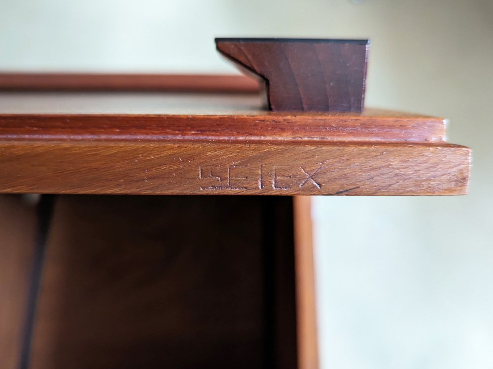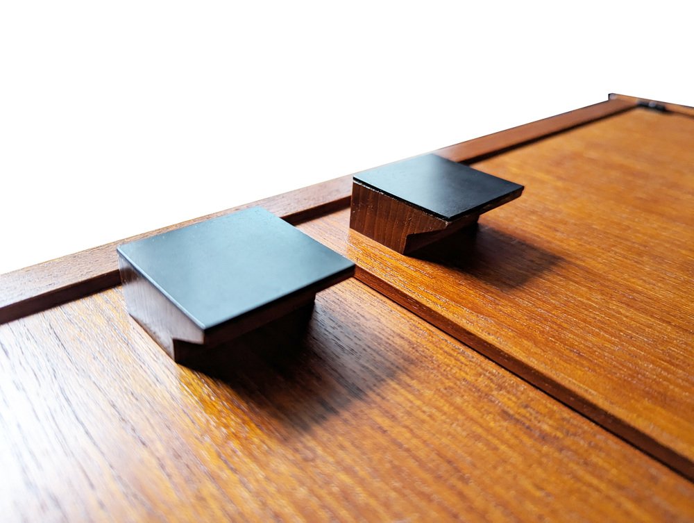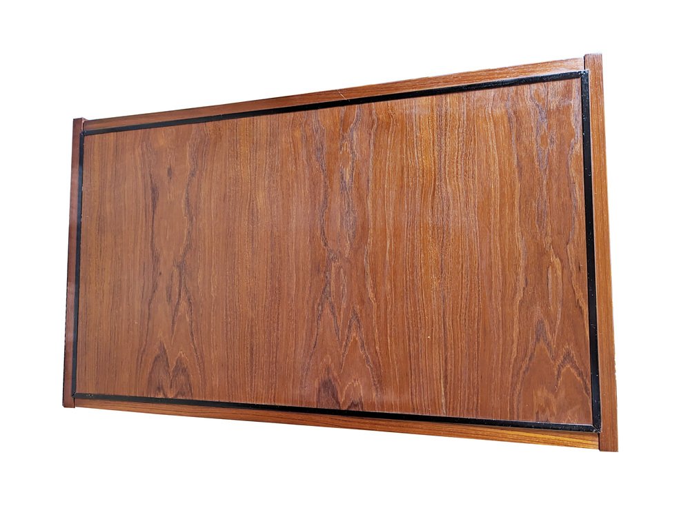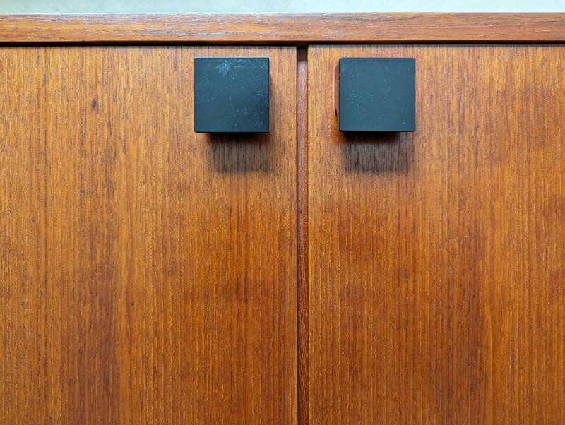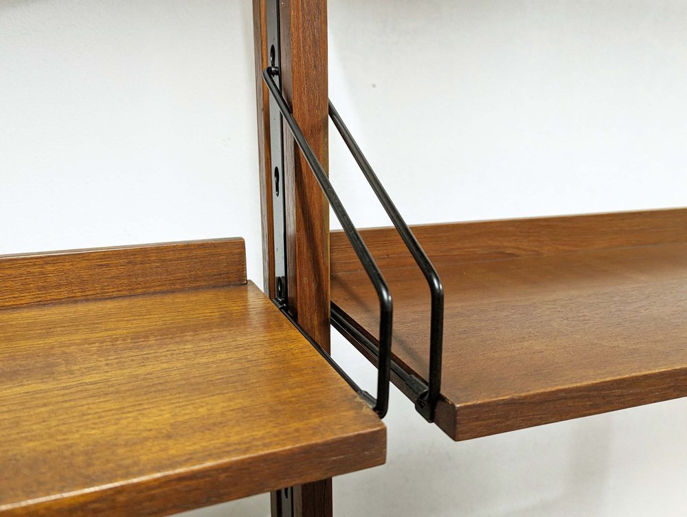 The bookshelf remains in overall pretty good conditions: however, the uprights, in more than fair condition, are the most damaged parts, especially at the ends. the upper part is not shaped but straight because it was sawn to allow the installation of the bookcase in its original place. Visible signs of wear on the wood in correspondence with the intervention. In some places the teak veneer is raised, as shown in the photo.
