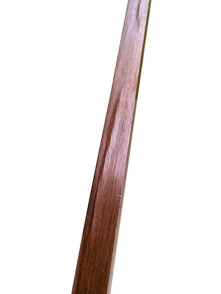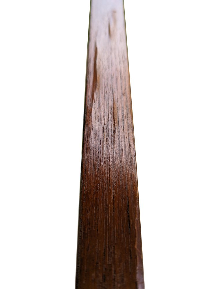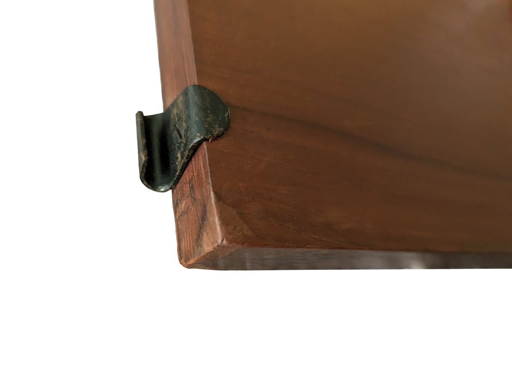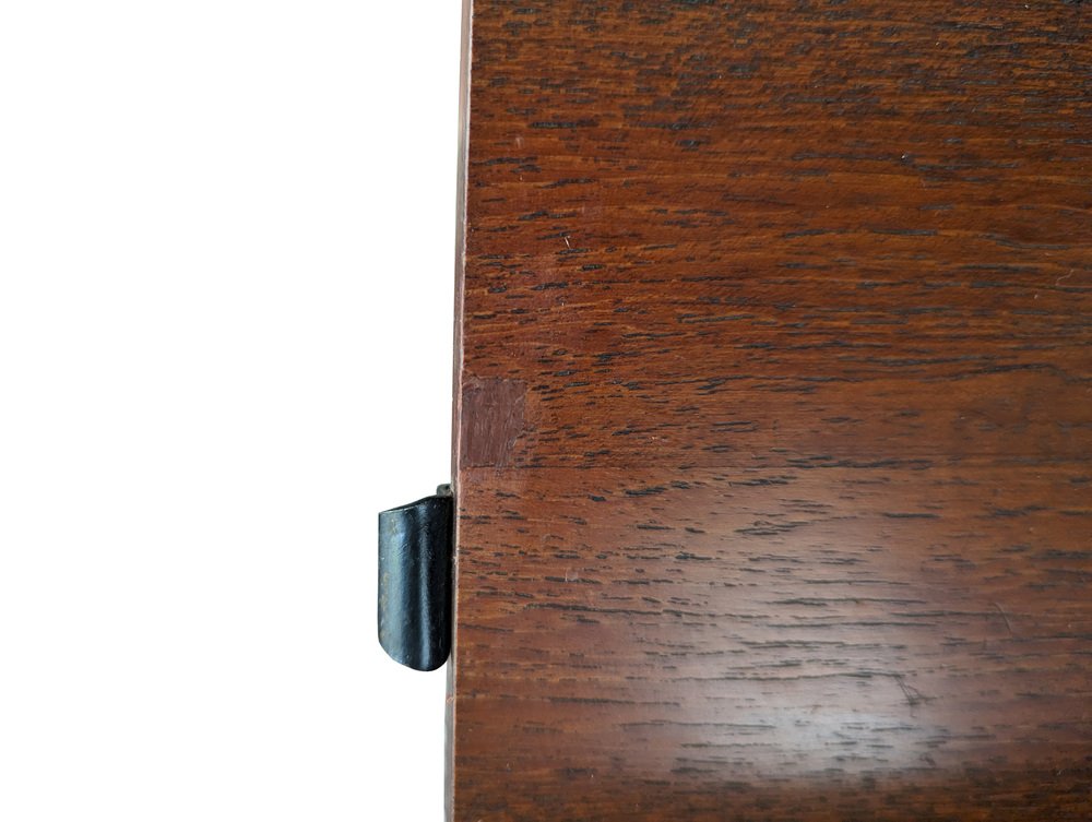 Das Regal befindet sich in einem insgesamt recht guten Zustand: Die Stützen, die sich in einem mehr als ordentlichen Zustand befinden, sind jedoch die am stärksten beschädigten Teile, vor allem an den Enden. Der obere Teil ist nicht geformt, sondern gerade, da er gesägt wurde, um die Installation des Regals an seinem ursprünglichen Platz zu ermöglichen. Sichtbare Abnutzungserscheinungen des Holzes in Übereinstimmung mit dem Eingriff. An einigen Stellen ist das Teakholzfurnier erhaben, wie auf dem Foto zu sehen.