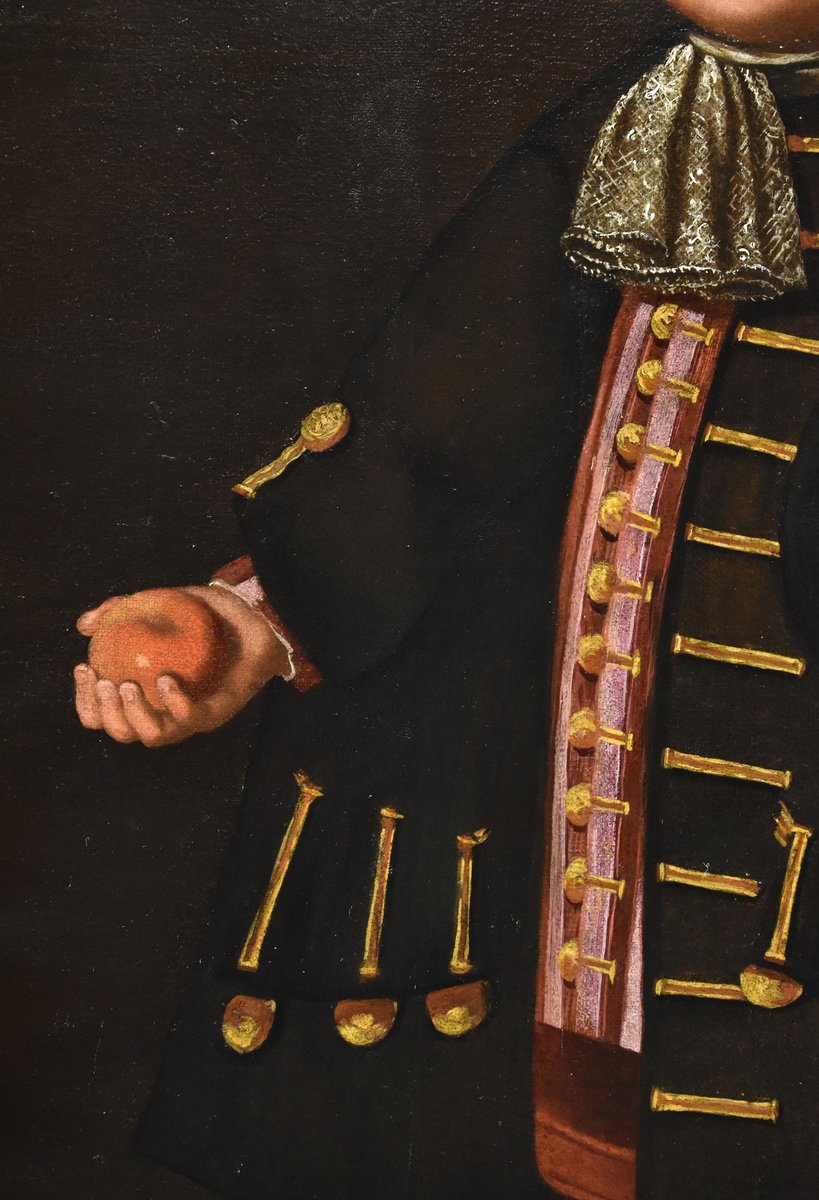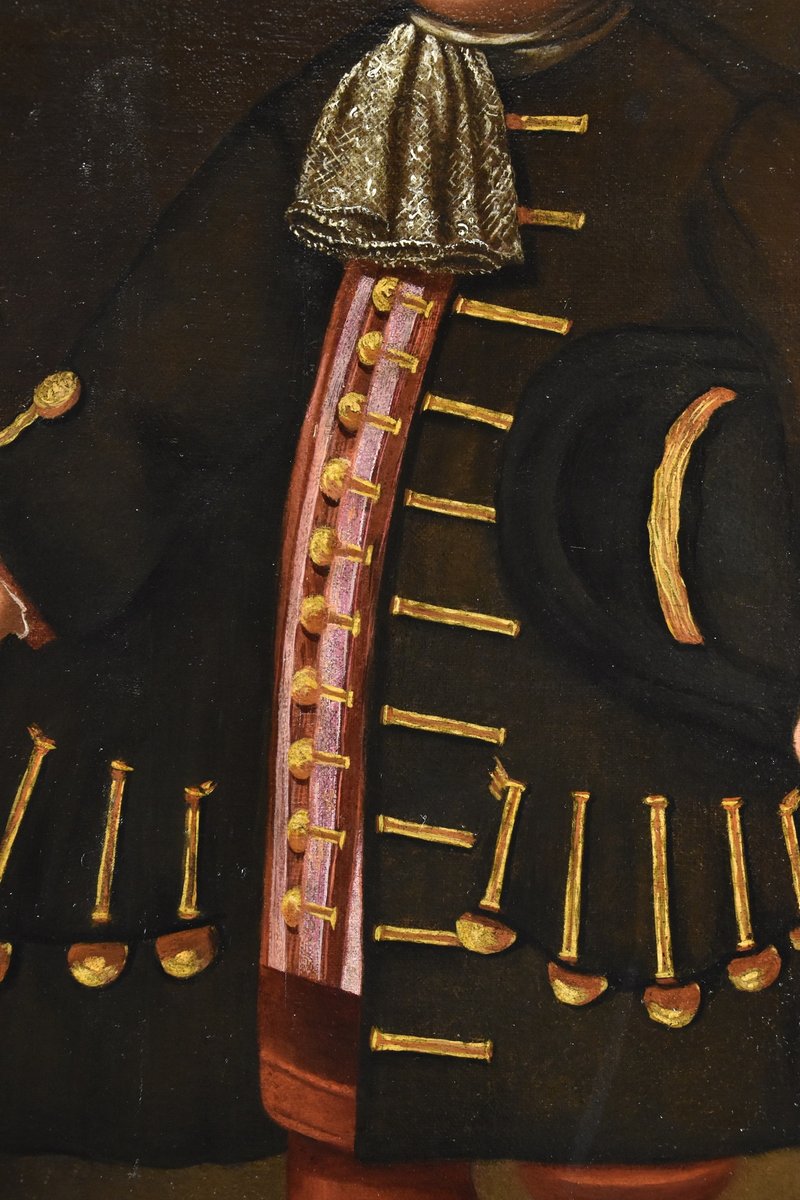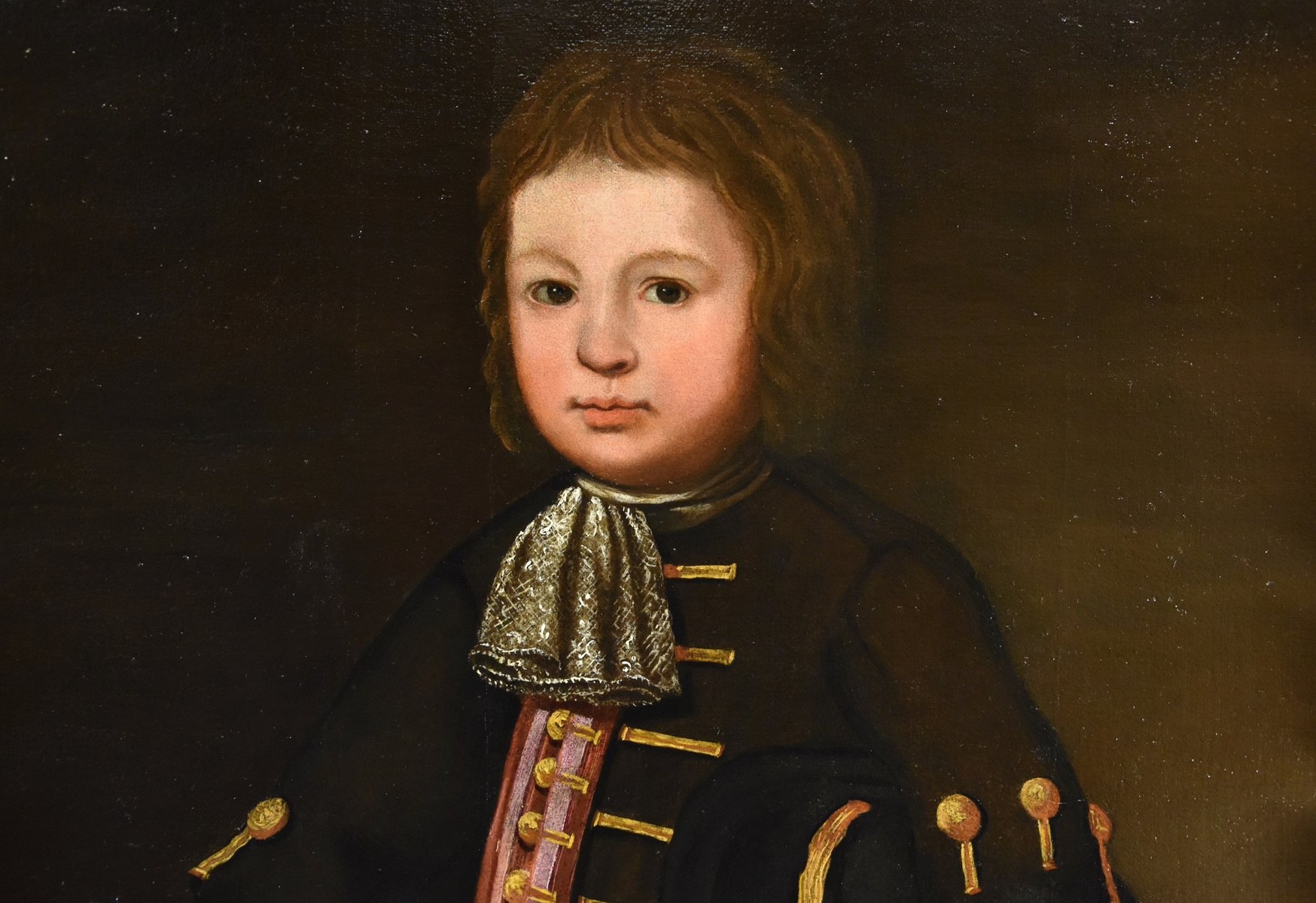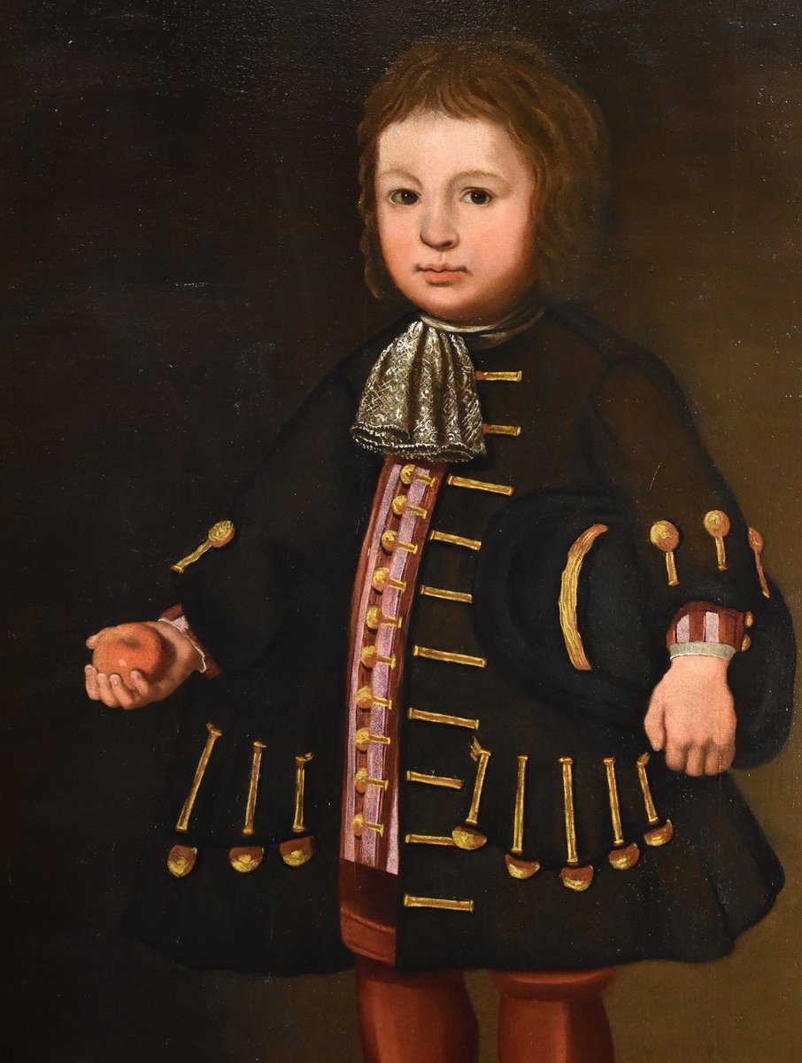 The subject of the canvas offered is a plump boy, approximately five years old, a young member of a 17th-century aristocratic family. He wears sumptuous yet sober clothing, consisting of a large, short, bell-shaped cape with gold trim and buttons, which covers his red robe.